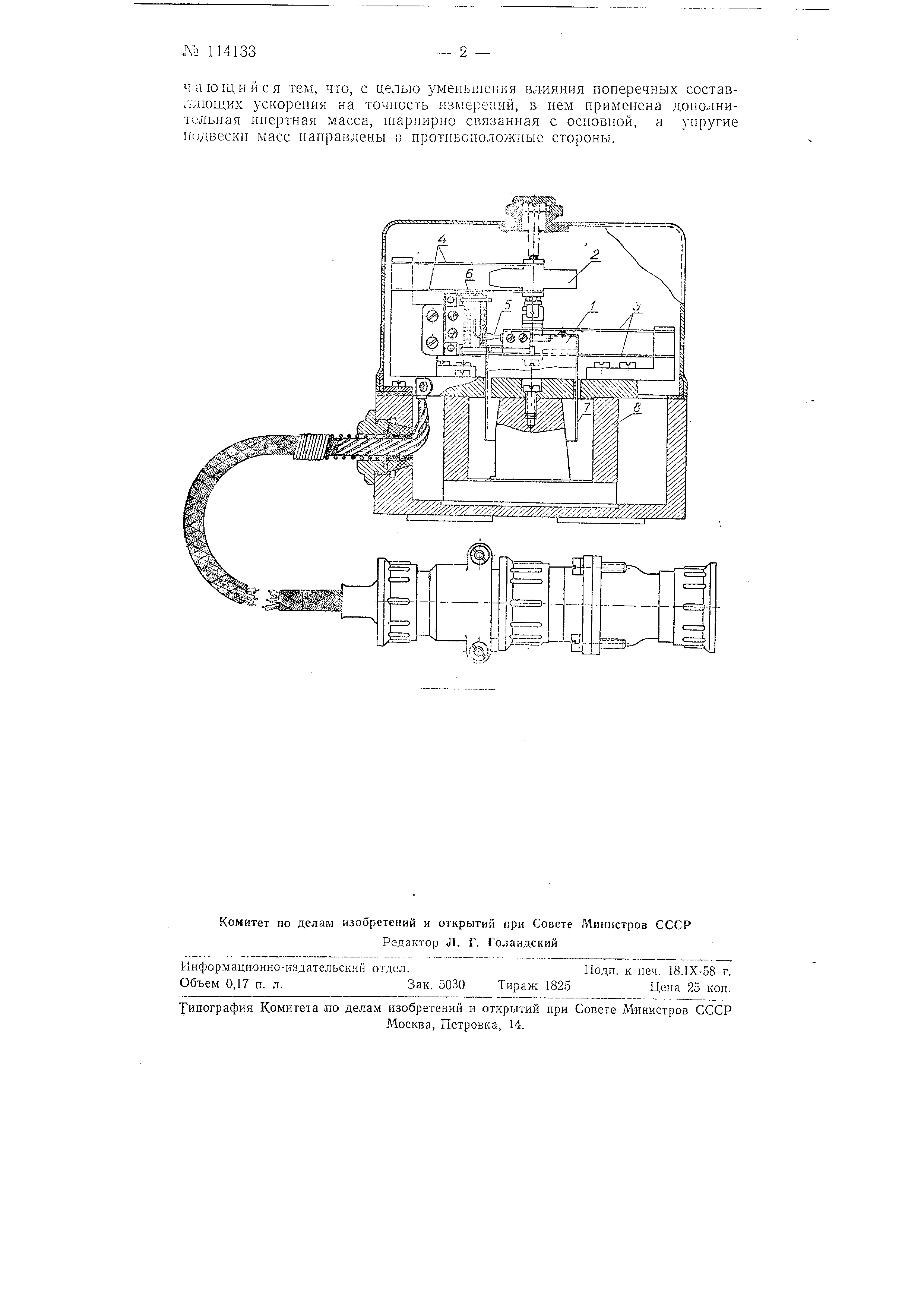 Под действием инерционных сил массы 1 и 2 перемещаются, что приводит к изменению положения контакта 5 потенциометра, т. е. изменению его омического сопротивления.