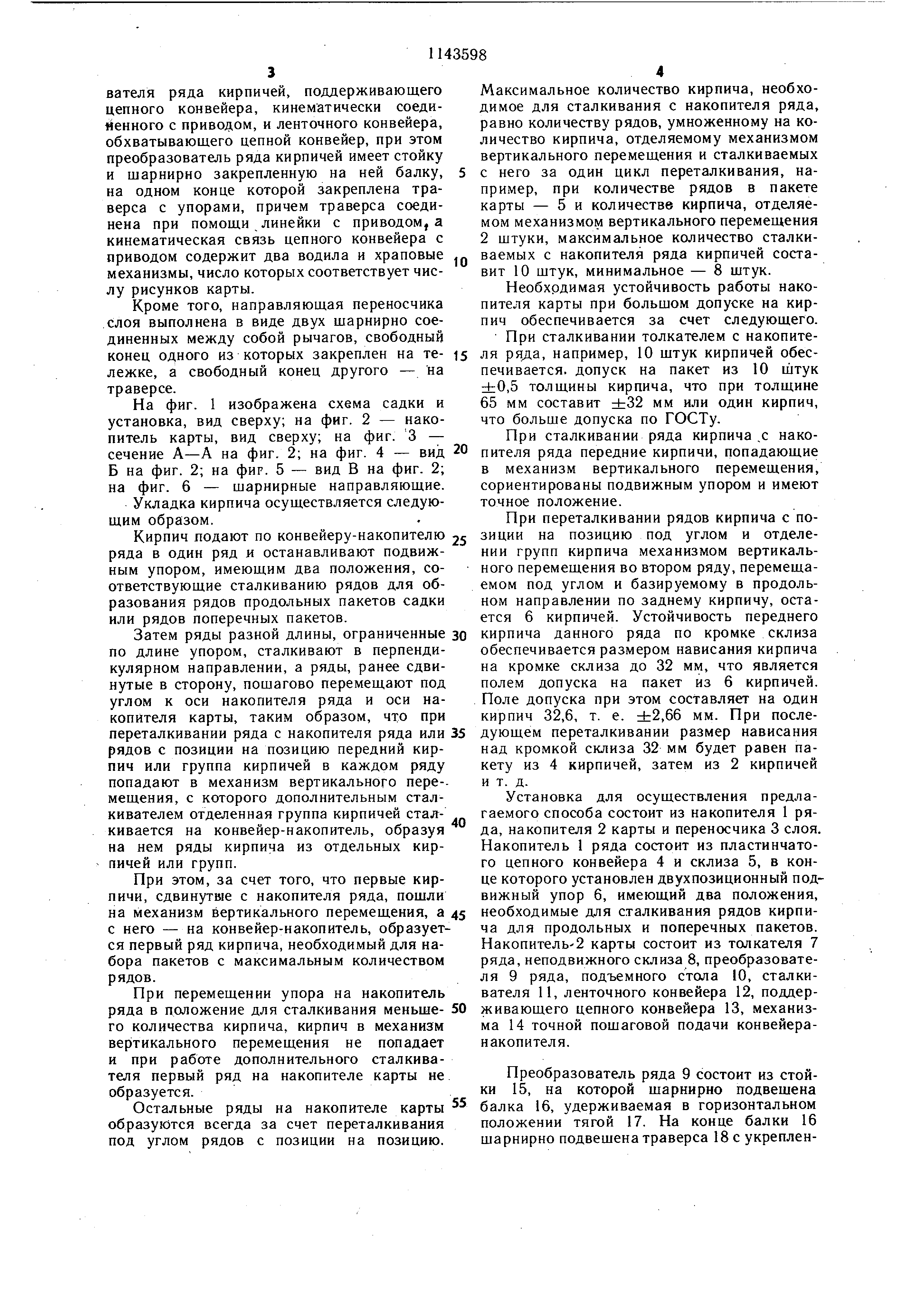Установка для осуществления предлагаемого способа состоит из накопителя 1 ряда , накопителя 2 карты и переносчика 3 слоя. Накопитель 1 ряда состоит из пластинчатого цепного конвейера 4 и склиза 5, в конце которого установлен двух позиционный подвижный упор 6, имеющий два положения, необходимые для сталкивания рядов кирпича для продольных и поперечных пакетов. Накопитель-2 карты состоит из толкателя 7 ряда, неподвижного склиза 8, преобразователя 9 ряда, подъемного стола 10, сталкивателя 11, ленточного конвейера 12, поддерживающего цепного конвейера 13, механизма 14 точной пощаговой подачи конвейеранакопителя .