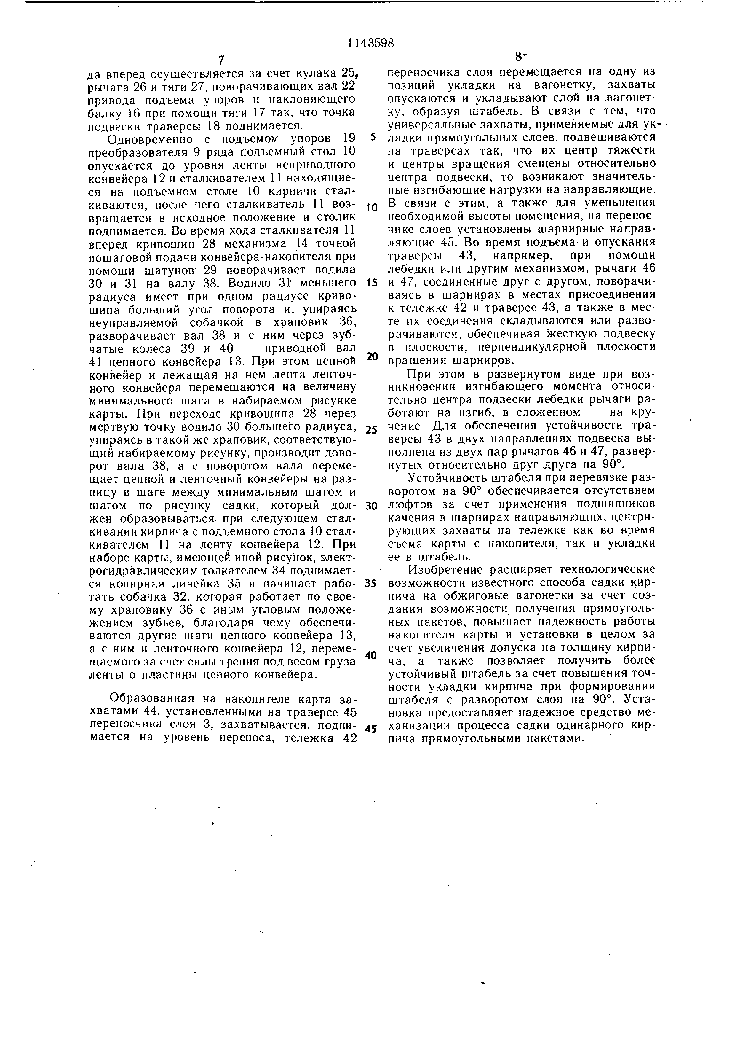 Преобразователь ряда 9 состоит из стойки 15, на которой шарнирно подвешена балка 16, удерживаемая в горизонтальном положении тягой 17. На конце балки 16 щарнирно подвещена траверса 18 с укрепленными на ней упорами 19. В горизонтальном положении траверса 18 удерживается при помощи линейки 20, перекатываемой по ролику, укрепленному на рычаге 21 вала 22 привода подъема упоров 19. Перемещение преобразователя 9 ряда осуществляется при помощи кривощипа 23 и щатуна 24. При возврате толкателя в исходное положение подъем балки осуществляется при помощи кулака 25 рычага 26 и тяги 27. Механизм точной пошаговой подачи 14 состоит из кривощипа 28, двух щатунов 29, водила 30 и водила 31 разных радиусов с укрепленными на них сс бачками 32 и 33 по количеству храповиков. При этом собачки 32 на водиле с больщим радиусом имеют ролики, при помощи которых электрогидравлические толкатели 34 копирными линейками 35 могут включать в работу ту или иную собачку 32, которая входит в заценление с одним из храповиком 36 с угловым расположением зубьев, равным очередному щагу на карте и равному толщине кирпича (группы кирпичей) плюс зазор. Один оборот храповика равен линейному размеру пакета 37 на карте плюс зазор меж ду пакетами. Вал 38 механизма 14 точной пощаговой подачи при помощи зубчатых колес 39 и 40 связан с приводным валом 41 цепного конвейера 13. С целью обеспечения набора карты на конвейере-накопителе при сталкивании кирпича со стола 10 в направлении движения кирпича ложковой стороной и исключения попадания обломков кирпича при сырце малой прочности под ленты накопителя ленточный конвейер 12 выполнен на всю щирину набираемой карты, точность положения которой при съеме захватами обеспечивается за счет сил трения ленты о цепной конвейер 13. Переносчик 3 слоя состоит из тележки 42, траверсы 43 с подвещенными на ней захватами 44 и шарнирных направляющих 45, которые представляют собой два соединенных между собой рычага 46 и 47. Второй конец каждого из рычагов соединен с рамой тележки 42 или траверсой 43 с захватами 44. Каждый рычаг представляет собой конструкцию, хорощо работающую на кручение, и имеет шарнир с разнесенными 45 подшипниками для уменьщения нагрузки на подшипниковые узлы. Каждая пара соединенных между собой рычагоБ 46 и 47 подсоединена к раме тележки и траверсе так, что плоскости вращения рычагов каждой пары развернуты от- 50 носительно друг друга. Установка работает следующим образом. Кирпичи подаются в один ряд по пластинчатому конвейеру-накопителю 1 ряда и силой трения кирпича, находяйхегося на конвейере 4, заталкиваются на склиз 5 накопите- ля 1 ряда, причем точка перехода с конвейера на склиз выбрана так, что кирпичи доталкиваются до упора б, установленного, в положение сталкивания ряда с минимальным количеством кирпичей в том случае, если общее количество кирпичей на склизе 5 и конвейере 4 в зоне толкателя 7 ряда обеспечивает плотное заполнение ряда,необходимого по количеству кирпича для сталкивания . При нажатии конечного выключателя на подвижный упор 6 включаются толкатель 7 ряда и преобразователь 9 ряда, при этом преобразователь ряда перемещает ряды кирпича, находящиеся на склизе 8 под углом к направлению накопителя 1 ряда и накопителя 2 карты так, что в конце хода передний кирпич (группа кирпичей) оказывается на подъемном столе 10, находящимся в верхнем положении, являющемся прод