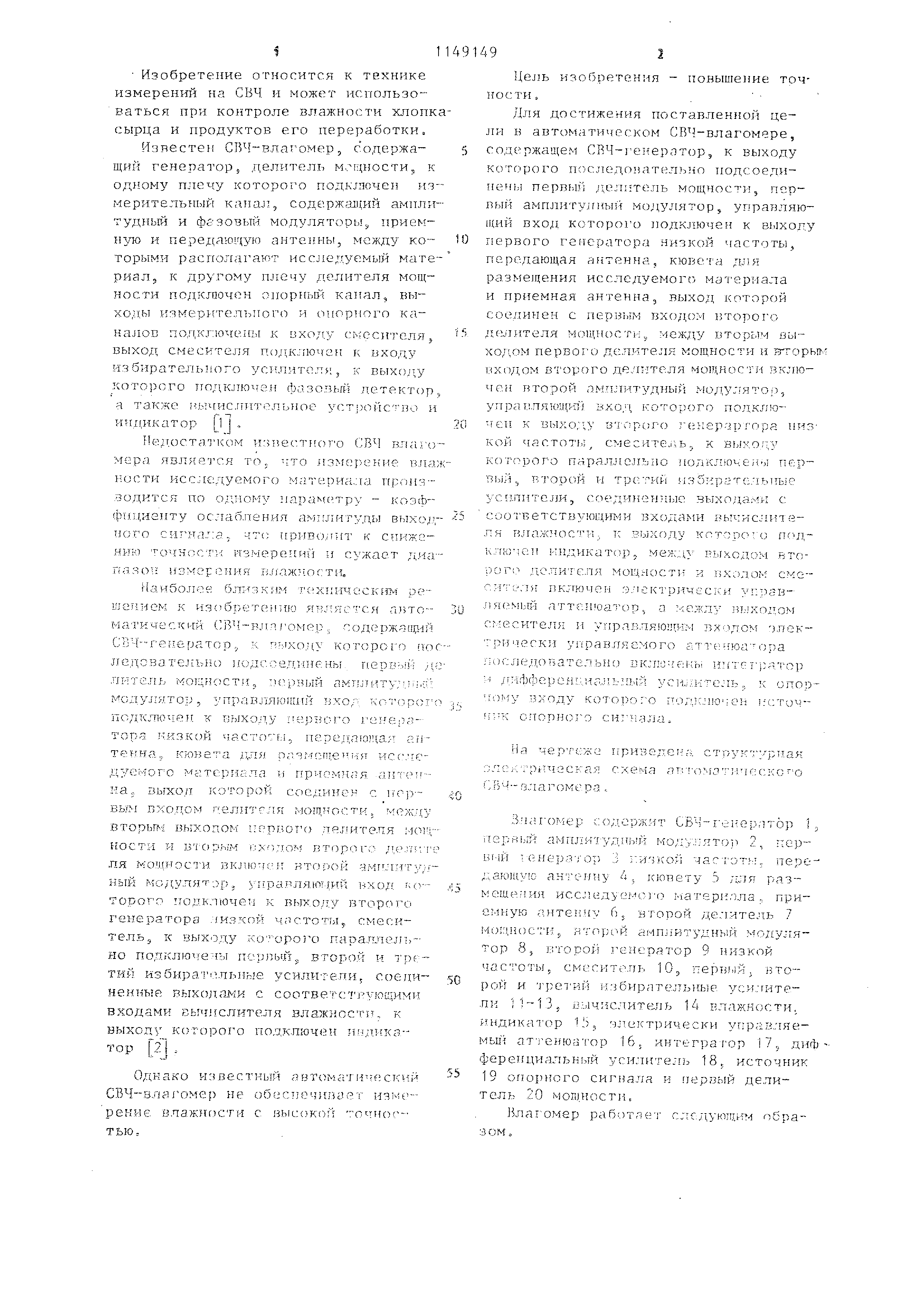 СВЧ-влагомер не обеспечи;1ает ичме-рекие влажнг)сти с высокой гочнсм--тью . liejib изобретения - повышение точности , Для достижения поставленной цели Б автоматичееком СВЧ-влагомере, содержащем СВЧ-генератор, к выходу