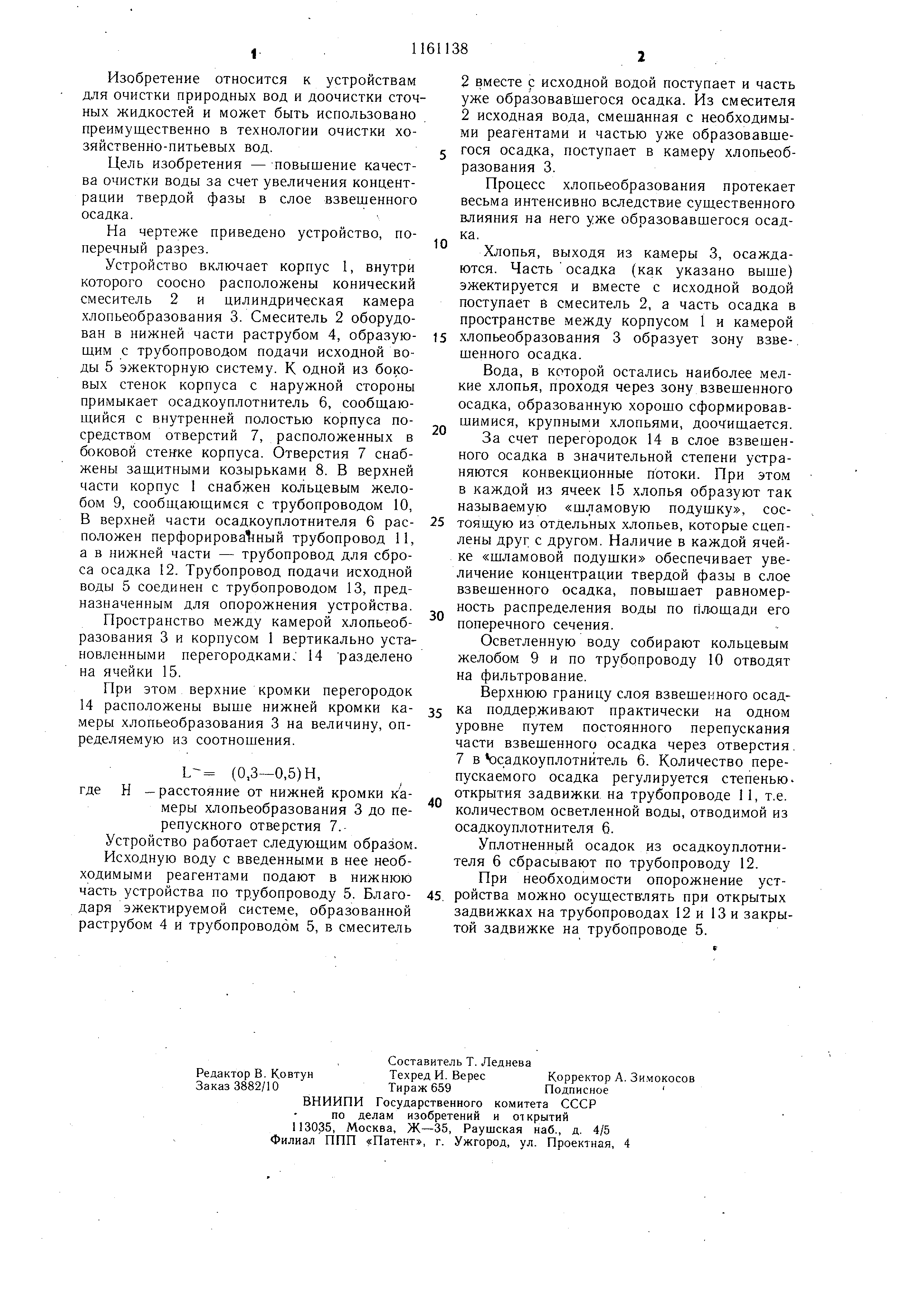 осадка, образованную хорошо сформировавшимися , крупными хлопьями, доочищается. За счет перегородок 14 в слое взвешенного осадка в значительной степени устраняются