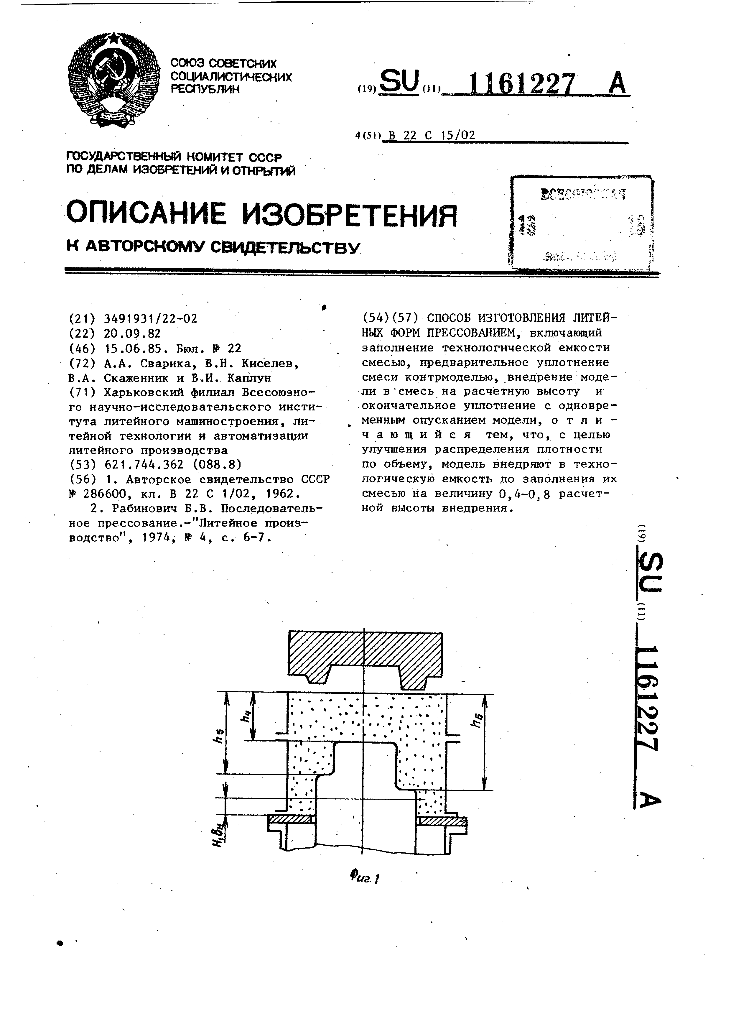 Для достижения указанной цели согласно способу изготовления литейных форм прессованием, включающему заполнение технологической емкости смесью, предварительное уплотнение смеси контрмоделью, внедрение модели в смесь на расчетную высоту и окончательное уплотнение с одновременным опусканием модели, модель внедряют в технологическую екость до заполнения их смесью на величину 0,4-0,8 расчетной высоты вне рения.