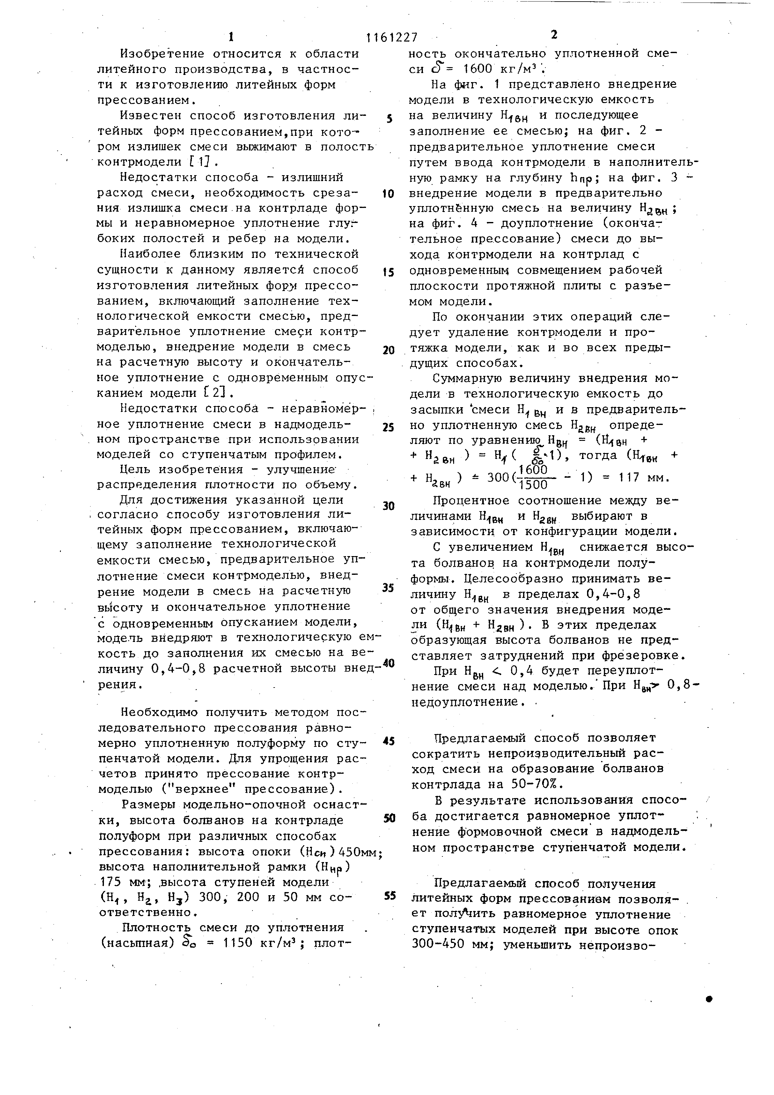 На фиг. 1 представлено внедрение модели в технологическую емкость на величину Н и последующее заполнение ее смесьюj на фиг. 2 предварительное уплотнение смеси путем ввода контрмодели в наполнитеную рамку на глубину hnp; на фиг. 3 внедрение модели в предварительно уплотненную смесь на величину на фиг, 4 - доуплотнение (окончательное прессование) смеси до выхода контрмодели на контрлад с одновременным совмещением рабочей плоскости протяжной плиты с разъемом модели.