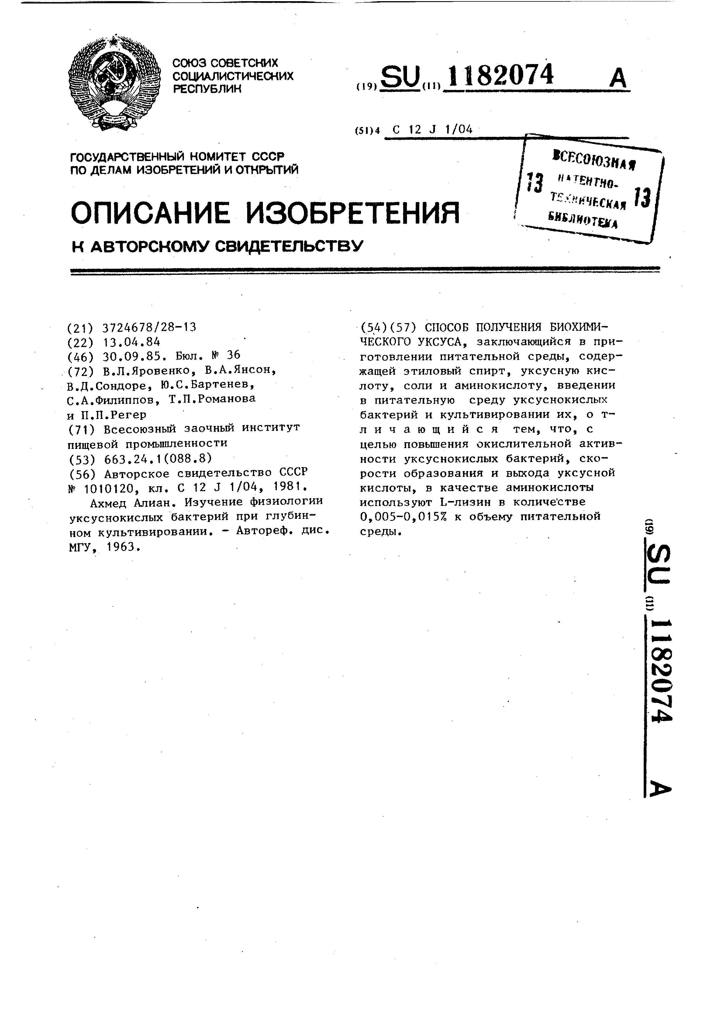этиловый спирт, уксусную кислоту , соли и аминокислоту, введении в питательную среду уксуснокислых бактерий и культивировании их, о тличающийся