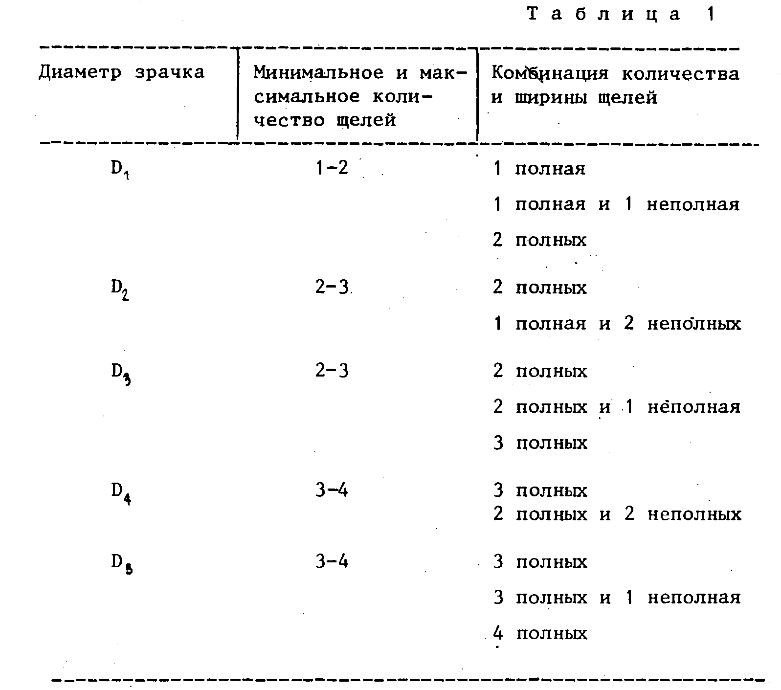 открывает различное количество щелей в зрачке с различной их шириной. К испытуемому глазу приближали тест-объект - вертикальную нить (проволоку толщиной 0,05 мм) на светлом фоне яркостью 100 кд/м2 до получения двойных изображений. Спрашивали, сколько изображений нити видит испытуемый при небольшом поперечном сдвиге решетки.