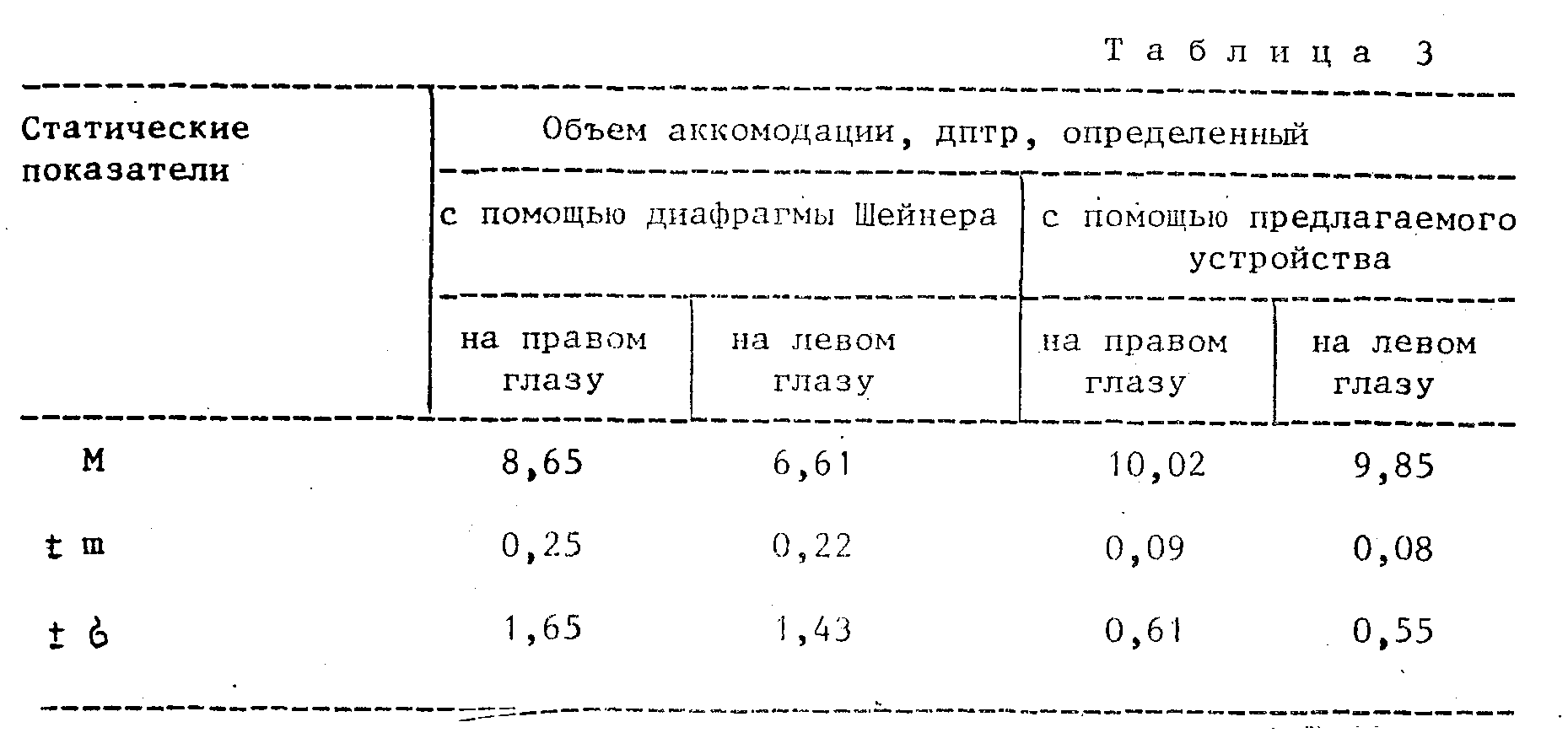 Изобретение относится к медицине, а именно к офтальмологии и может быть использовано при исследовании аккомодации глаза с диагностической целью. Целью изобретения является повышение точности измерения. На фиг. 1 изображена диафрагма; на фиг. 2 - решетка с периодом Т и различными величинами горизонтального диаметра зрачка: Устройство содержит тест-объект (не показан) и диафрагму, которая выполнена в виде диска 1 диаметром 38 мм из непрозрачного материала (пластмассы) черного цвета. В центре диска имеется воронкообразное углубление 2 с донышком 3 диаметром не менее 12 мм. Донышко представляет собой решетку с параллельными щелями и перемычками одинаковой ширины. Исследование осуществляют следующим образом. Измеряют диаметр зрачка исследуемого глаза. Одевают пробную очковую оправу (не показано). В линзодержатель перед исследуемым глазом вставляют диафрагму с Соответствующим периодом решетки, обращенную донышком к глазу. При этом щели должны располагаться вертикально. Второй глаз закрывается матовым стеклом или 50%-ным фильтром. Рассматривая глаз сквозь решетку, фиксируют устройство так, чтобы зрачок исследуемого глаза был в центре. Приставляют к краю орбиты проксиметр, на штанге которого находится тест-объект -вертикальная линия на светлом фоне. Исследование начинают с перемещения тест-объекта с дальнего конца штанги в направлении к исследуемому глазу со скоростью 1 см/с до того момента, когда линия начинает раздваиваться. В этот момент отмечают расстояние тест-объекта до исследуемого глаза. Затем тест-объект отодвигают от глаза до того момента, когда двоение вертикальной линии исчезает. Вторично отмечают расстояние между тест-объектом и глазом. Среднее из двух отсчетов соответствует искомому положению ближайшей точки ясного зрения. Для большей точности исследование повторяют 3 раза и вычисляют среднее арифметическое. Объем аккомодации вычисляют по формуле Дондерса где Р - отстояние ближайшей точки ясного зрения, м; R - величина клинической рефракции глаза, диоптрии (при гиперметропии со знаком "-", при миопии со знаком "+". Теоретические предпосылки использования предлагаемого устройства для исследования аккомодации глаза заключаются в том, что зрачок исследуемого глаза хорошо просматривается через решетку, что позволяет правильно ее центрировать. Кроме того, при случайном или намеренном смещении решетки до 4 мм, функция ее не исчезает, так как в любом случае зрачок перекрыт двумя или тремя щелями, и, если тест-объект находится не в области ясного зрения, то двойные изображения тест-объекта переходят в тройные, затем снова в двойные и т.д. При перемещении тест-объекта в область ясного зрения всегда будет одиночное изображение тест-объекта даже при смещении решетки. Смещение ее. по горизонтали на 3-4 мм является контрольной пробой, показывающей, где находится тест-объект: в области ясного зрения или вне ее. Таким образом исключаются грубые ошибки при определении ближайшей точки ясного зрения. Кроме того, важное преимущество решетки заключается в том, что освещенность сетчатки исследуемого глаза в 5 раз выше, чем при использовании известного устройства, а поле зрения расширяется до 80-90°. Все это позволяет точно и полно исследовать объем аккомодации глаза. Что касается двоения при исследовании с помощью предлагаемого устро