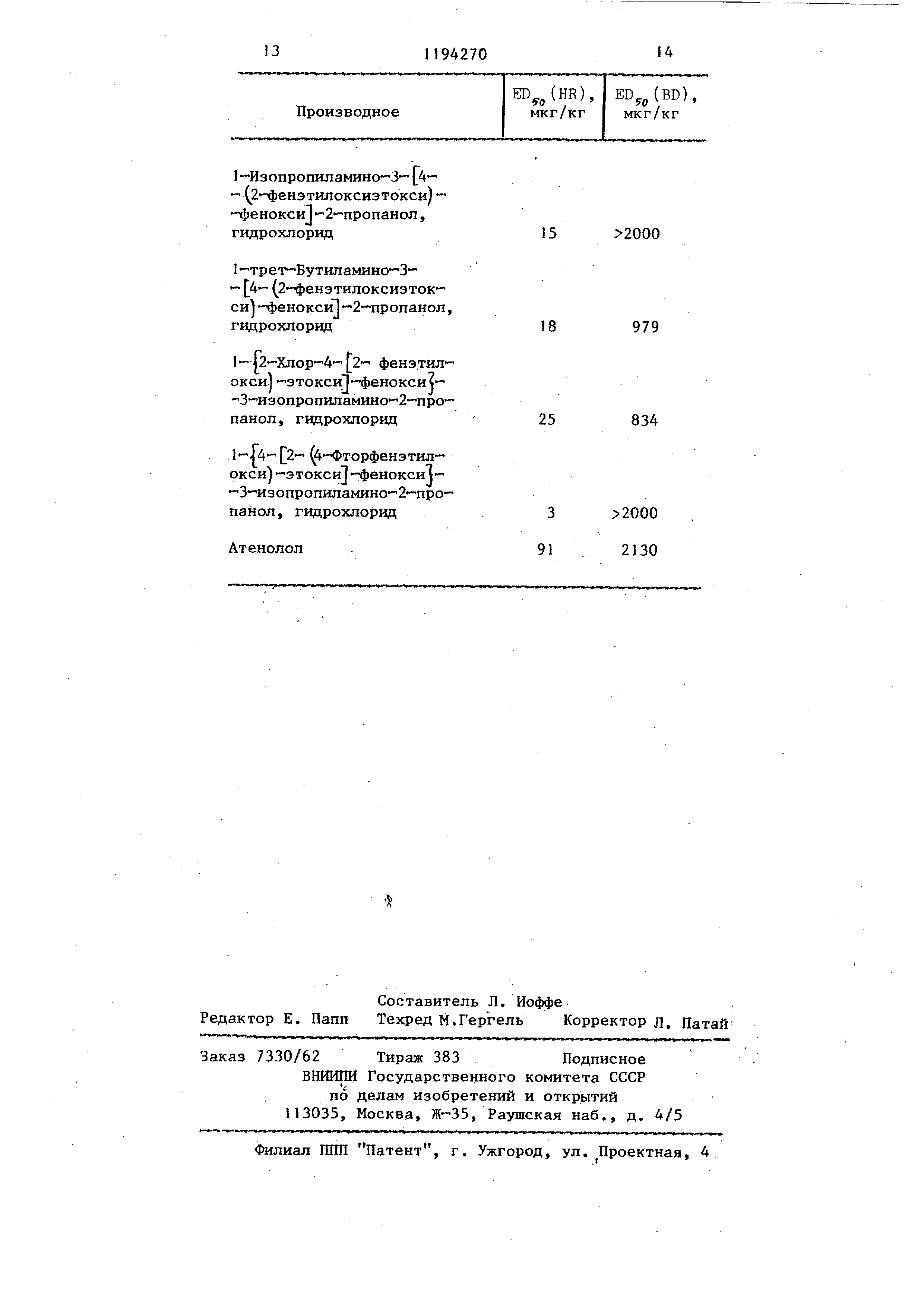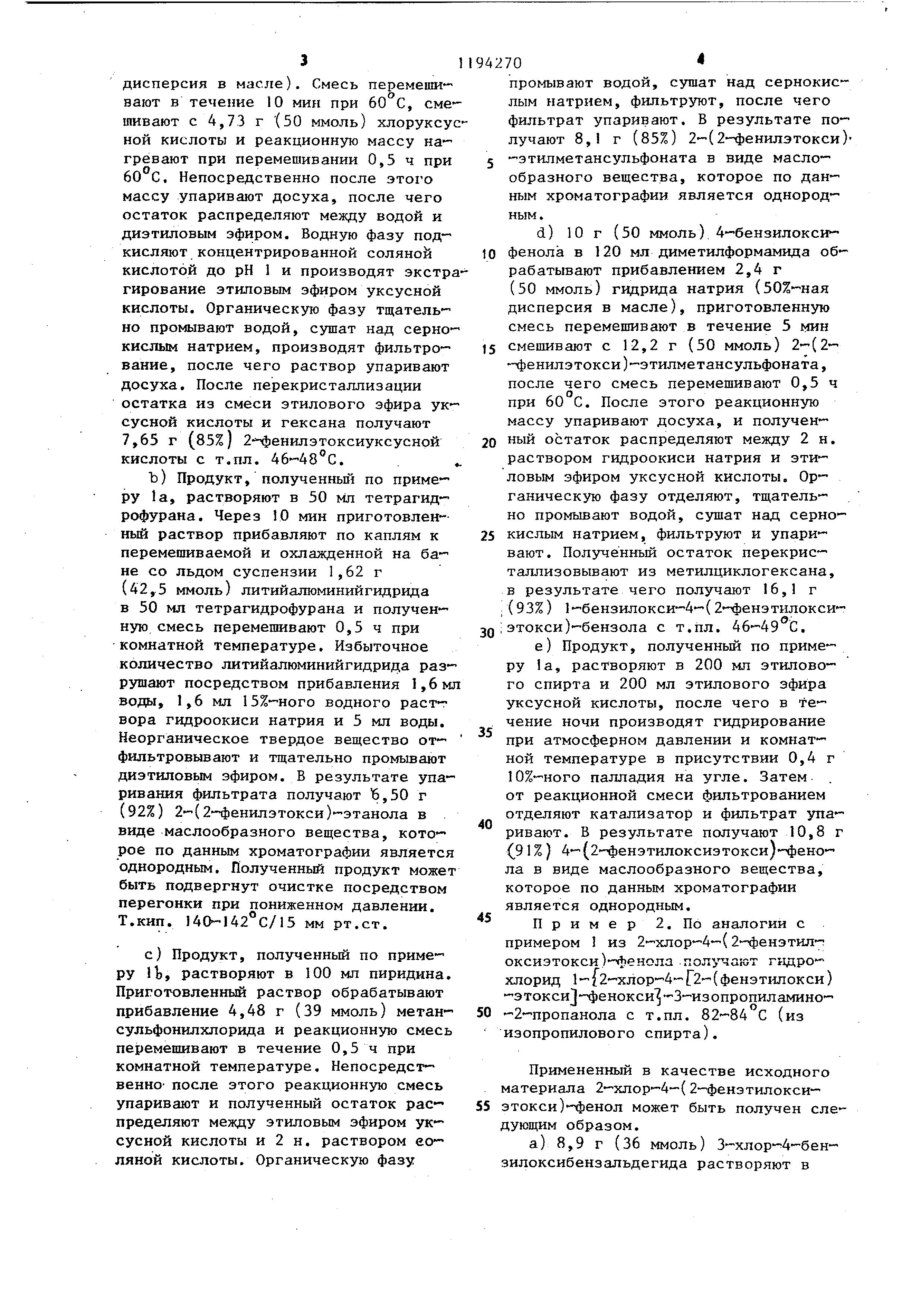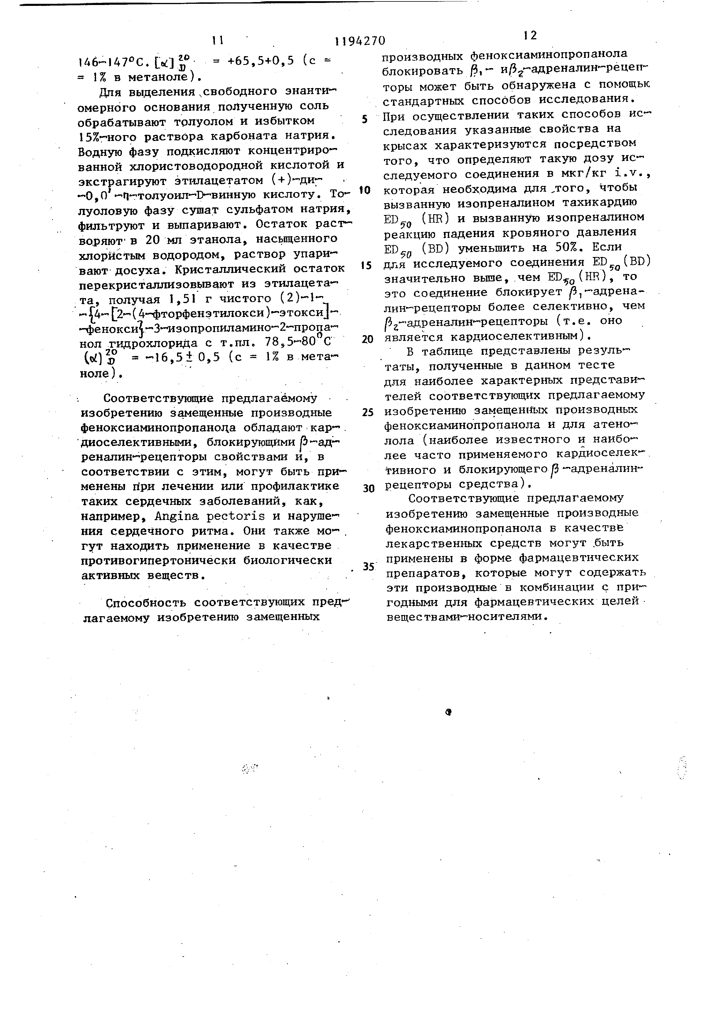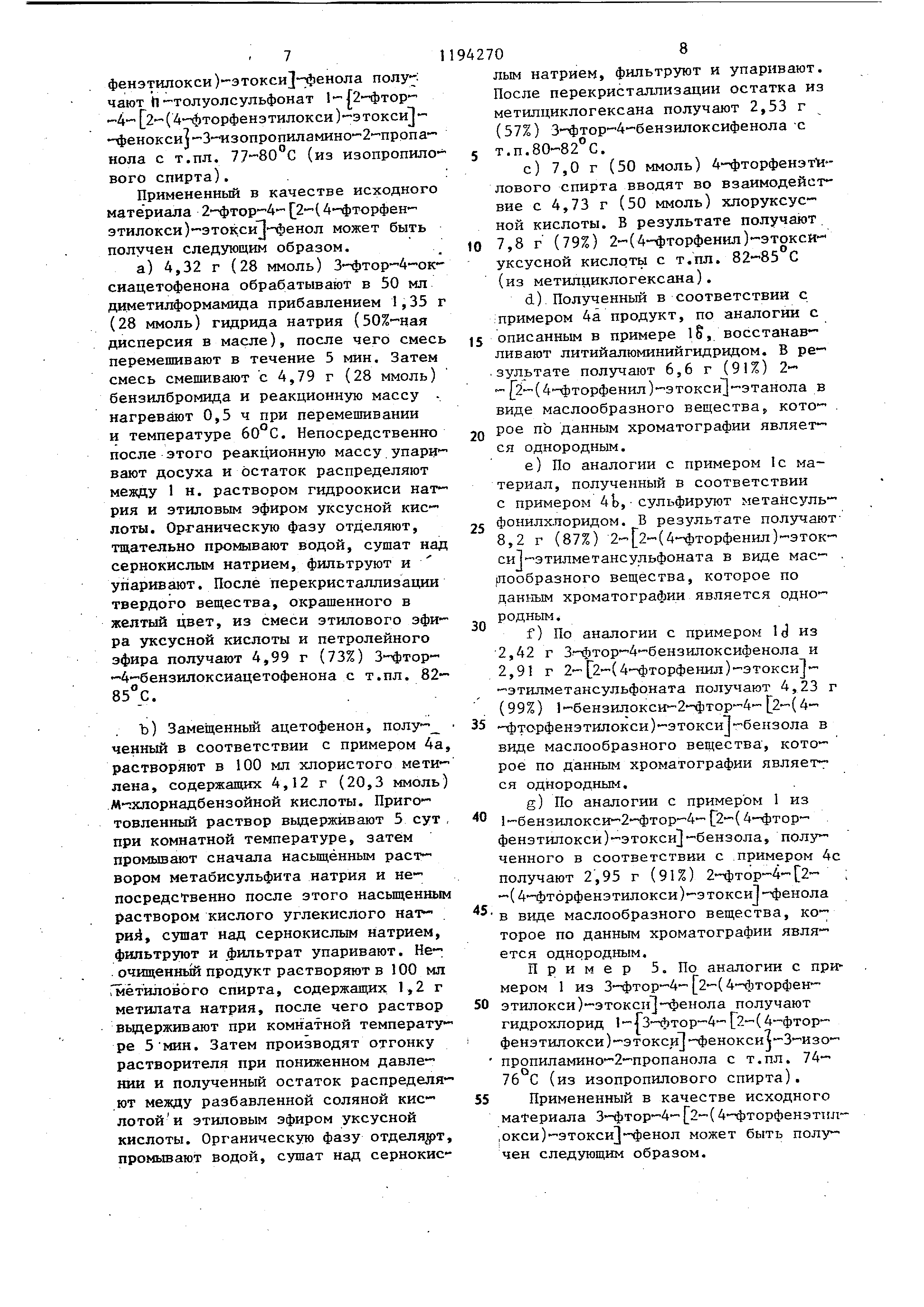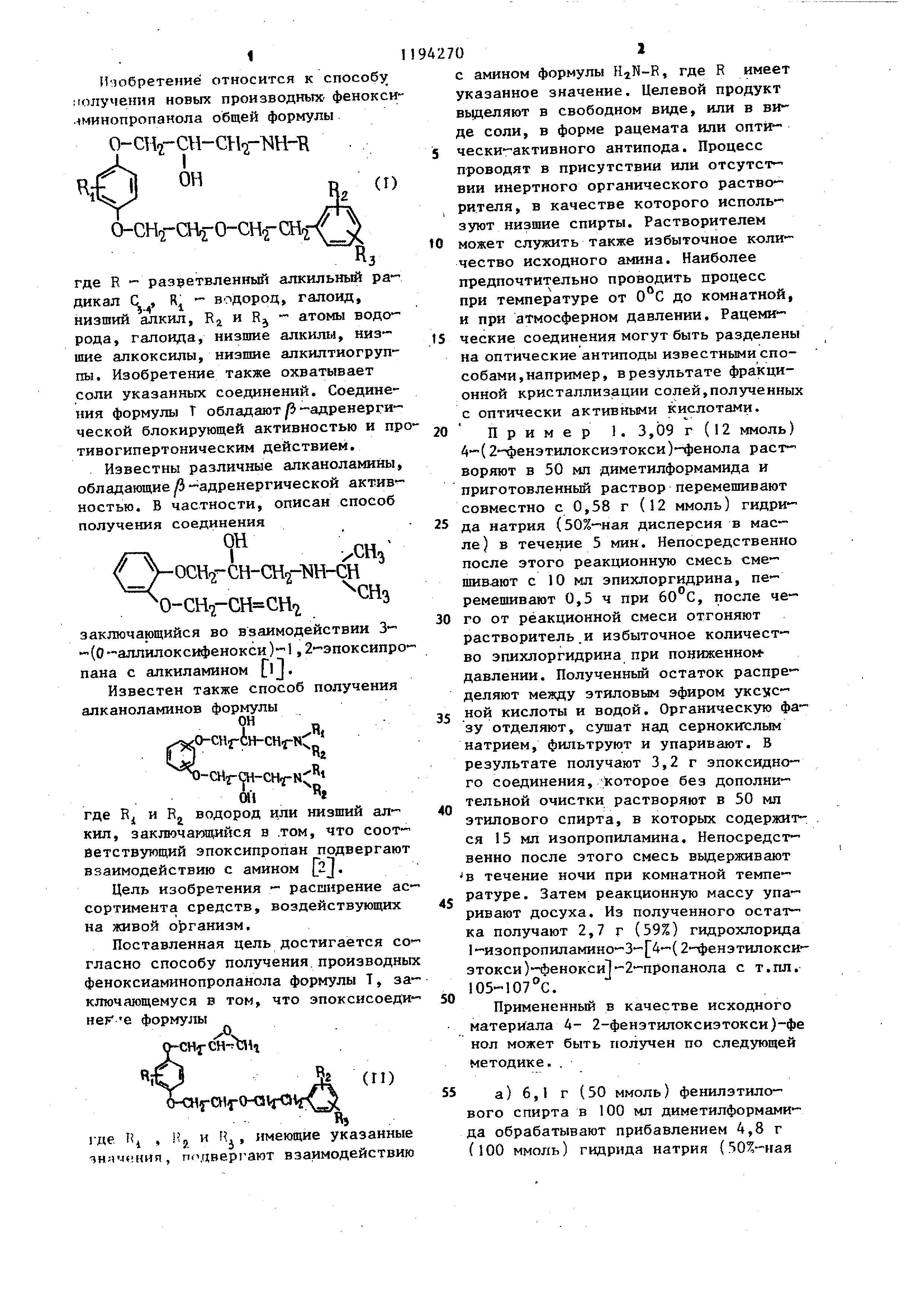 1 Изобретение относится к способу получения новых производных, фенокси . 1минопропанола общей формулы 0-СИгСН-СН - 1Н-Н O-CHrCHfO-CH -CH - J где R - разветвленный алкильный ра- дикал Ц. , Rj - воДород, галоид, низший алкил, Rj и R - атомы водорода , галоида, низшие алкилы, низ шие апкоксилы, низшие алкилтиогруппы . Изобретение также охватывает соли указанных соединений. Соединения формулы Т обладают/5-адренергической блокирующей активностью и пр тивогипертоническим действием. Известны различные алканоламины обладающие jb -адренергической актив ностью. В частности, описан способ получения соединения ОН л f -OCH2-CH-CH2-NH-CH 0-СНг,. заключающийся во взаимодействии 3- -(О-аллилоксифенокси)- ,2-эпоксипро пана с алкиламином flj. Известен также способ получения апканоламинов формулы ОН Я| RZ CH-rCH-CHf- i-CHj-CH-CH N;; ffll где Rj и R, водород и.ли низший алкил , заключающийся в том, что соот- ветствующий эпоксипропан подвергаю взаимодействию с амином pZJ. Цель изобретения - расширение ас сортимента средств, воздействующих на живой о1рганизм. Поставленная дель достигается со гласно способу получения производны феноксиаминопропанола формулы Т, за ключающемуся в том, что эпоксисоеди нер е формулы , НгСН-гС г ij-cvi -o-aifO Hj, и F, , имеющие указанные где. lij тнмчякня, подвергают взаимодействию 02 с амином формулы , где R имеет указанное значение. Целевой продукт вь1деляют в свободном виде, или в виде соли, в форме рацемата или оптй чески-активного антипода. Процесс проводят в присутствии или отсутствии инертного органического растворителя , в качестве которого используют низшие спирты. Растворителем может служить также избыточное количество исходного амина. Наиболее предпочтительно проводить процесс при температуре от до комнатной, и при атмосферном давлении. Рацемкческие соединения могут быть разделены на оптические антиподы известными способами , например, в результате фракционной кристаллизации солей,полученных с оптически активными кислотами. Пример 1. 3,09 г (12 ммоль) 4-(2-фенэтилоксиэтокси)-фенола растворяют в 50 мл диметилформамида и приготовленный раствор перемешивают совместно с 0,58 г (12 ммоль) гидри- да натрия (50%-ная дисперсия в масле ) в течение 5 мин. Непосредственно после этого реакционную смесь сме- шив.ают с 10 мл эпихлоргидрина, перемешивают 0,5 ч при , после че- го от реакционной смеси отгоняют растворитель.и избыточное количество эпихлоргидрина при пониженномдавлении . Полученный остаток распределяют между этиловым эфиром уксусной кислоты и водой. Органическую фазу отделяют, сушат над сернокислым натрием, фильтруют и упаривают. В результате получают 3,2 г эпоксидного соединения, Которое без дополнительной очистки растворяют в 50 мл этилового спирта, в которых содержится 15 мл изопропиламина. Непосредственно после этого смесь выдерживают B течение ночи при комнатной температуре . Затем реакционную массу упаривают досуха. Из полученного остатка получают 2,7 г (59%) гидрохлорида 1-изопропиламино-3- 4-(2-фенэтилоксиэтокси )-фенокси -2-пропанола с т.пл. 105-107°С. Примененный в качестве исходного материала 4- 2-фенэтилоксиэтокси)-фе НОЛ может быть получен по следующей методике. . а) 6,1 г (50 ммоль) фенилэтило- вого спирта в 100 мл диметилформамида обрабатывают прибавлением 4,8 г (100 ммоль) гидрида натрия ( 3 дисперсия в масле). Смесь перемешивают в течение 10 мин при 60 С, смешивают с 4,73 г (50 ммоль) хлоруксуной кис