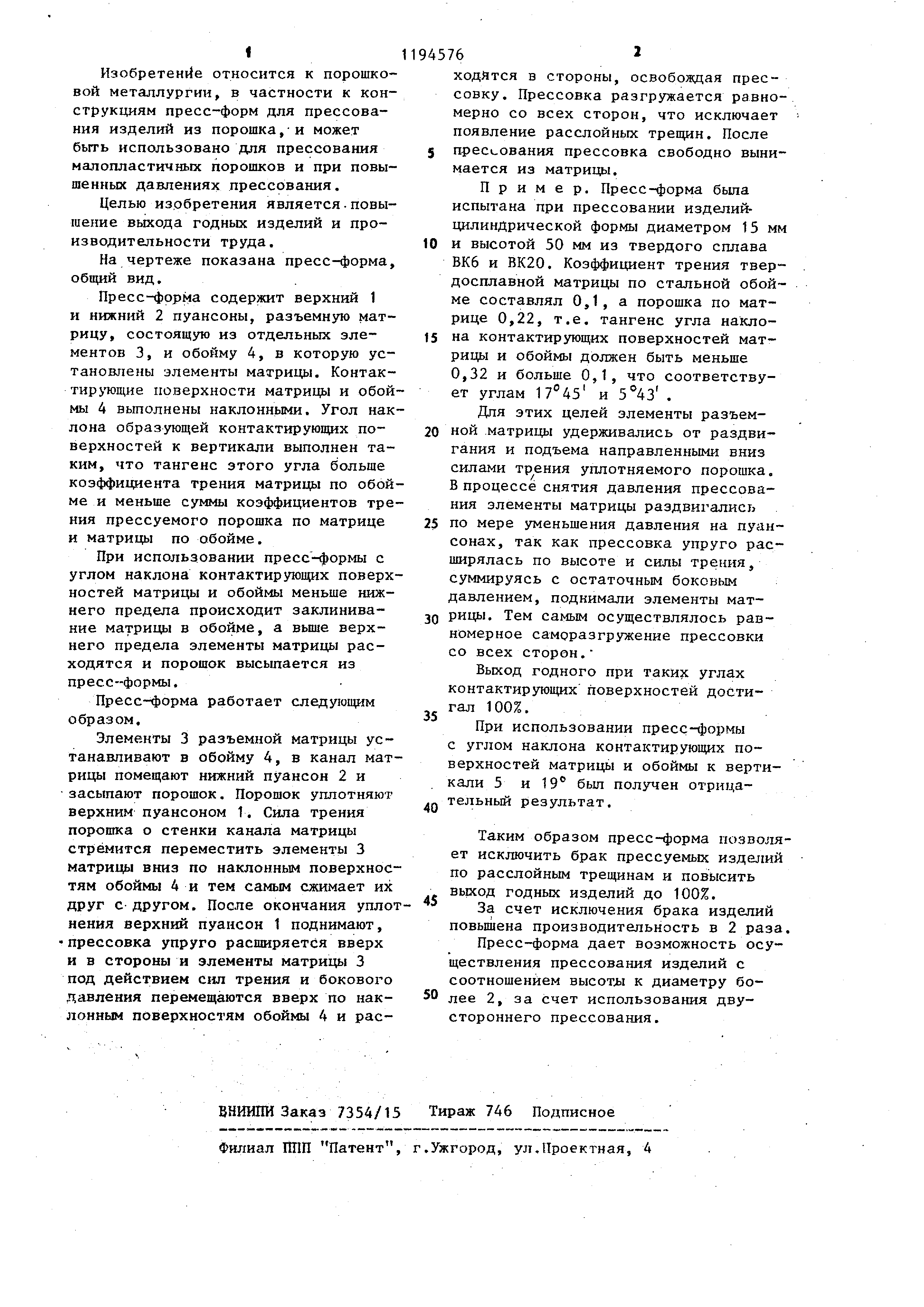« Изобретение относится к порошковой металлургии, в частности к конструкциям пресс-форм для прессования изделий из порошка,-и может быть использовано для прессования малопластичньгх порошков и при повышенных давлениях прессования. Целью изрбретения является - повышение выхода годных изделий и производительности труда. На чертеже показана пресс-форма, общий вид. Пресс-форма содержит верхний 1 и нижний 2 пуансоны, разъемнзпо матрицу , состоящую из отдельных элементов 3, и обойму 4, в которую установлены элементы матри. Контактирующие поверхности матрицы и обой мы 4 вьтолнены наклоннь1ми. Угол нак лона образующей контактирующих поверхностей к вертикали выполнен таким , что тангенс этого угла больше коэффициента трения матрицы по обой ме и меньше суммы коэффициентов тре ния прессуемого порошка по матрице и матрицы по обойме. При использовании пресс-формы с углом наклона контактирующих поверх ностей матрицы и обоймы меньше нижнего предела происходит заклинивание матрицы в обойме, а вьш1е верхнего предела элементы матрицы расходятся и порошок высыпается из пресс-формы. Пресс-форма работает следующим образом. Элементы 3 разъемной матрицы устанавливают в обойму 4, в канал мат рицы помещают нижний пуансон 2 и засыпают порошок, Порошок уплотняют верхним пуансоном 1. Сила трения порошка о стенки канала матрицы стремится переместить элементы 3 матрицы вниз по наклонным поверхнос тям обоймы 4 и тем самым сжимает их друг с другом. После окончания упло нения верхний пуансон 1 поднимают, прессовка упруго расширяется вверх и в стороны и элементы матрицы 3 под действием сил трения и бокового давления перемещаются вверх по наклонным поверхностям обоймы 4 и рас6 ходЯтся в стороны, освобоящая прессовку . Прессовка разгружается равномерно со всех сторон, что исключает появление расслойных трещин. После пресс-ования прессовка свободно вынимается из матрицы. Пример. Пресс-форма бьша испытана при прессовании издели1 цилиндрической формы диаметром 15 мм и высотой 50 мм из твердого сплава ВК6 и ВК20. Коэффициент трения твердосплавной матрицы по стальной обойме составлял 0,1, а порошка по матрице 0,22, т.е. тангенс угла наклона контактирующих поверхностей матрицы и обоймы должен быть меньше 0,32 и больше 0,1, что соответствует углам 17°45 и . Для этих целей элементы разъемной матрицы удерживались от раздвигания и подъема направленными вниз силами трения уплотняемого порошка. В процессе снятия давления прессования элементы матрицы раздвигались по мере уменьшения давления на пуансонах , так как прессовка упруго расширялась по высоте и силы трения, суммируясь с остаточным боковым давлением, поднимали элементы матрицы . Тем самым осуществлялось равномерное саморазгружение прессовки со всех сторон. Выход годного при таких углах контактирующих поверхностей достигал 100%. При использовании пресс-формы с углом наклона контактирующих поверхностей матрицы и обоймы к вертикали 5 и 19 был получен отрицательный результат. Таким образом пресс-форма позволяет исключить брак прессуемых изделий по расслойным трещинам и повысить вьрсод годных изделий до 100%. За счет исключения брака изделий повышена производительность в 2 раза. Пресс-форма дает возможность осуществления прессования изделий с соотношением высотл к диаметру более 2, за счет использования двустороннего п