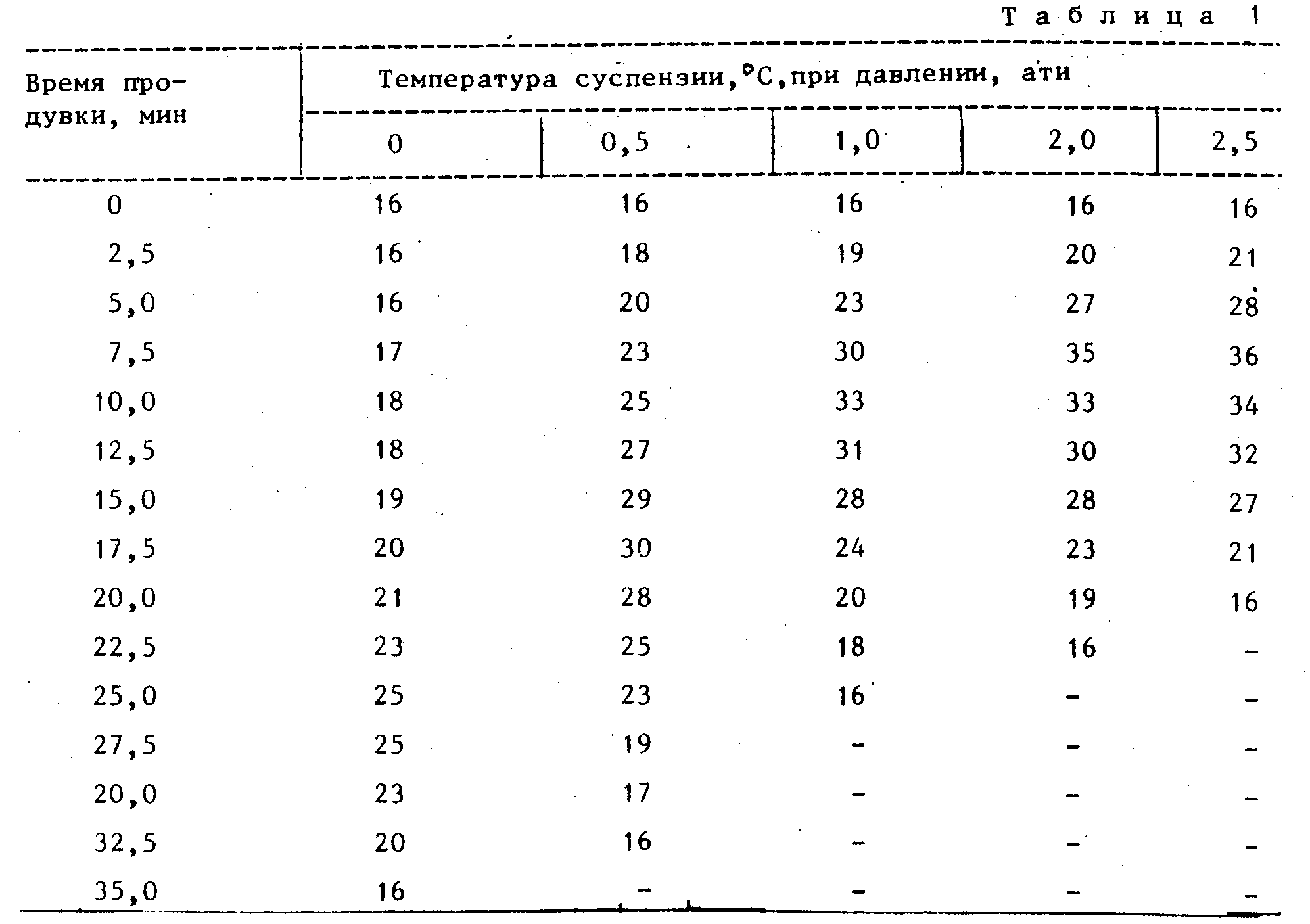 В табл. 1 приведены сравнительные данные кинетики изменения температуры суспензии в процессе ее перемешивания в зависимости от давления (избыточное давление, равное 0 ати, соответствует известному способу).