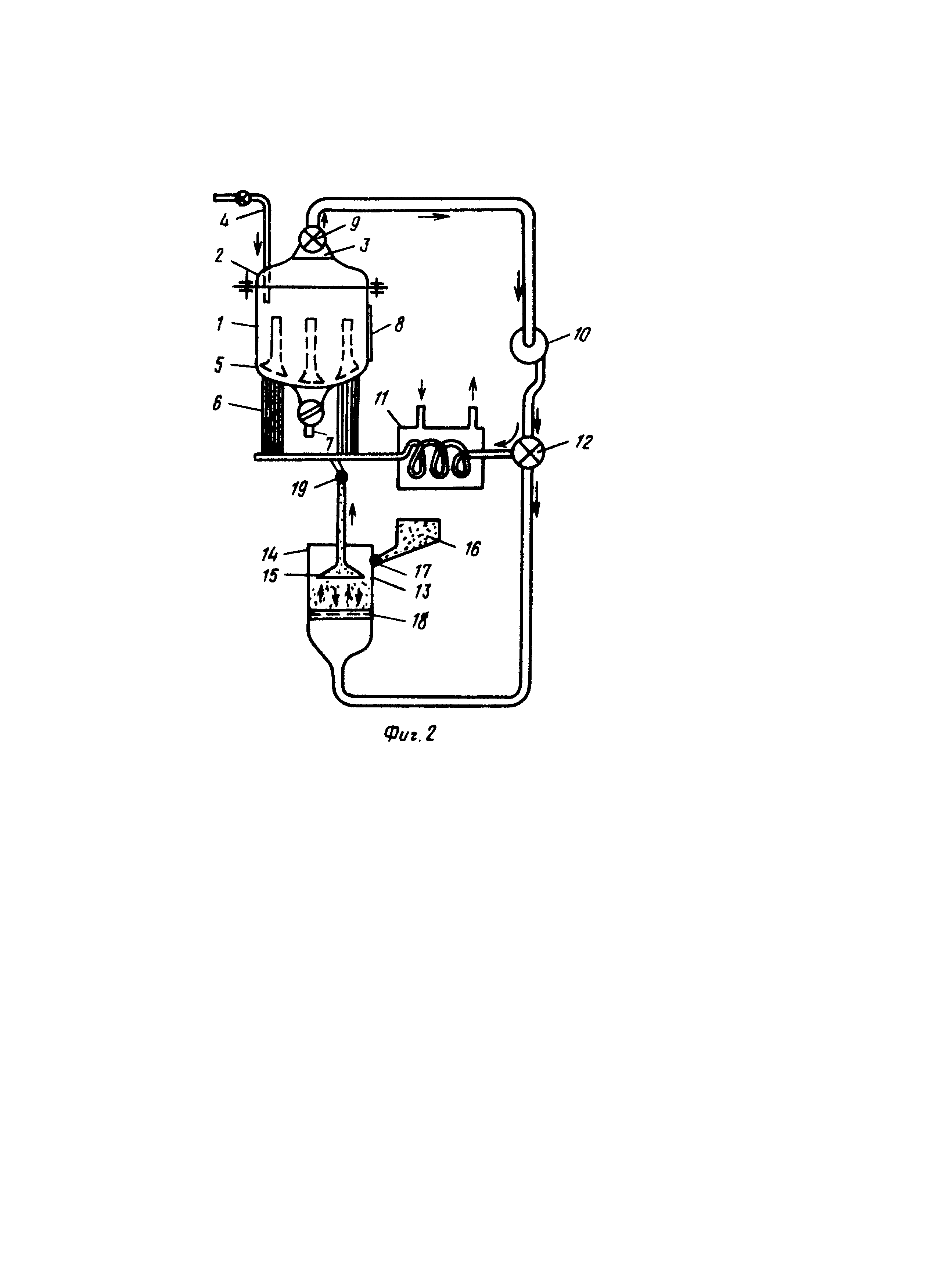 Таким образом, при приготовлении суспензии по предлагаемому способу в емкости 1 происходит барботирование суспензии, циркуляционное и пульсирующее перемешивание, что значительно ускоряет процесс приготовления суспензии и повышает ее качество. Газы, насыщенные парами растворителя и этилсиликата, через газоотводящий патрубок 3 снова поступают в емкость гидролизатора 1, проходя через нагнетатель 10, охлаждающий элемент 11 и газоподводящие патрубки 6. Таким образом, осуществляется постоянная оборотная циркуляция газов. По окончании приготовления суспензии готовый продукт сливают через выпускной патрубок 7 в раздаточные емкости.