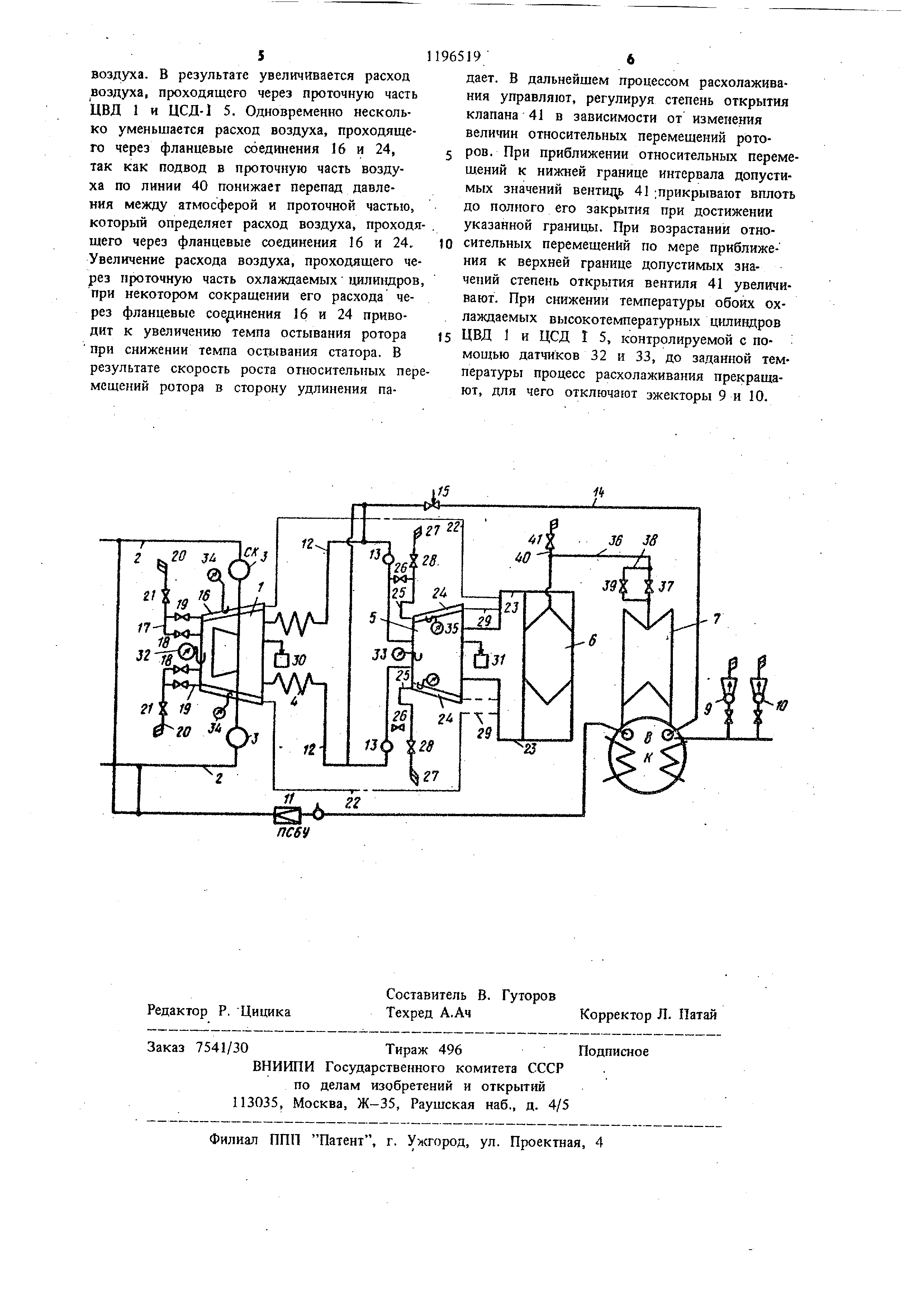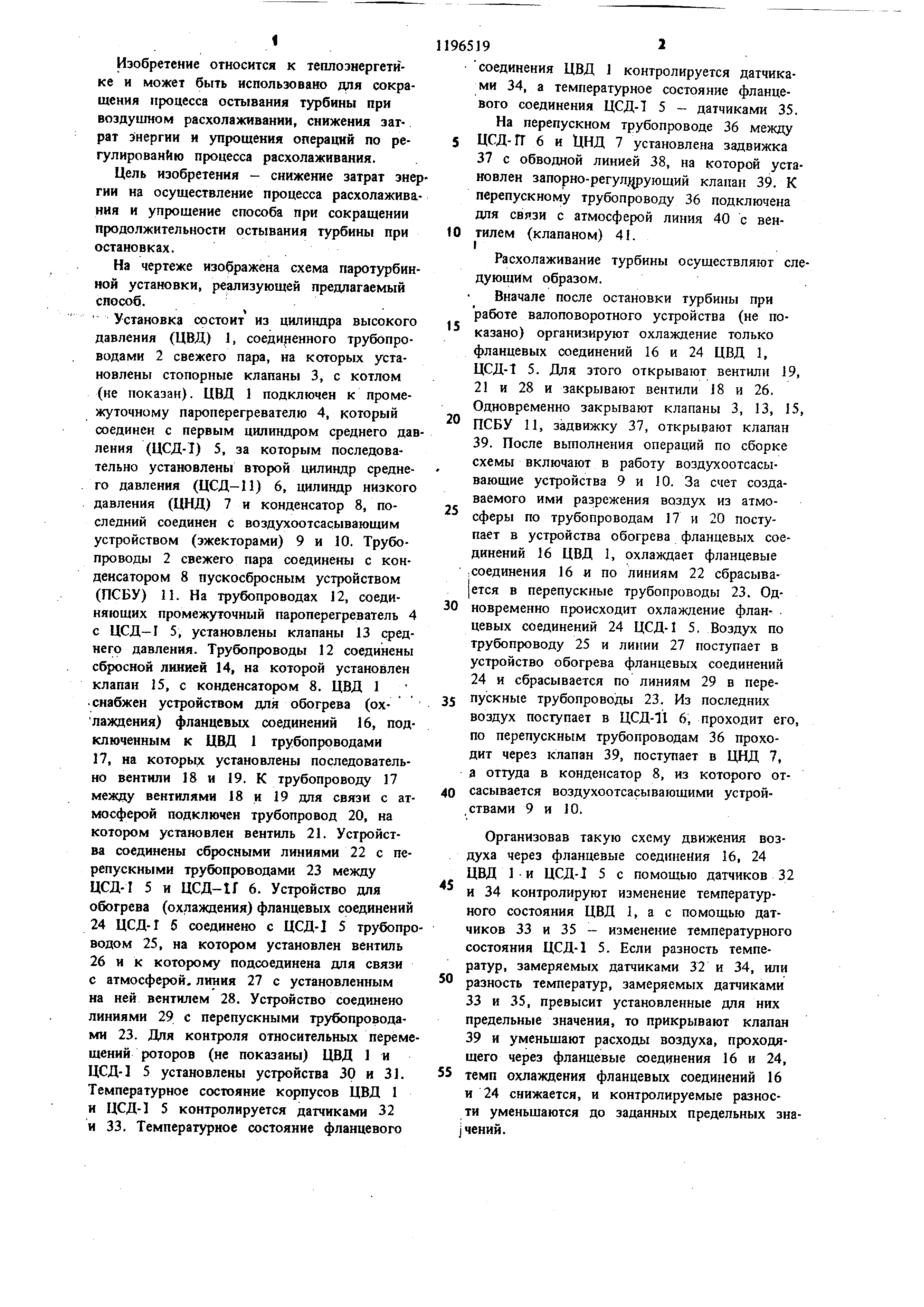 для связи с атмосферой линия 40 с вентилем (клапаном) 41. Расхолаживание турбины осуществляют следующим