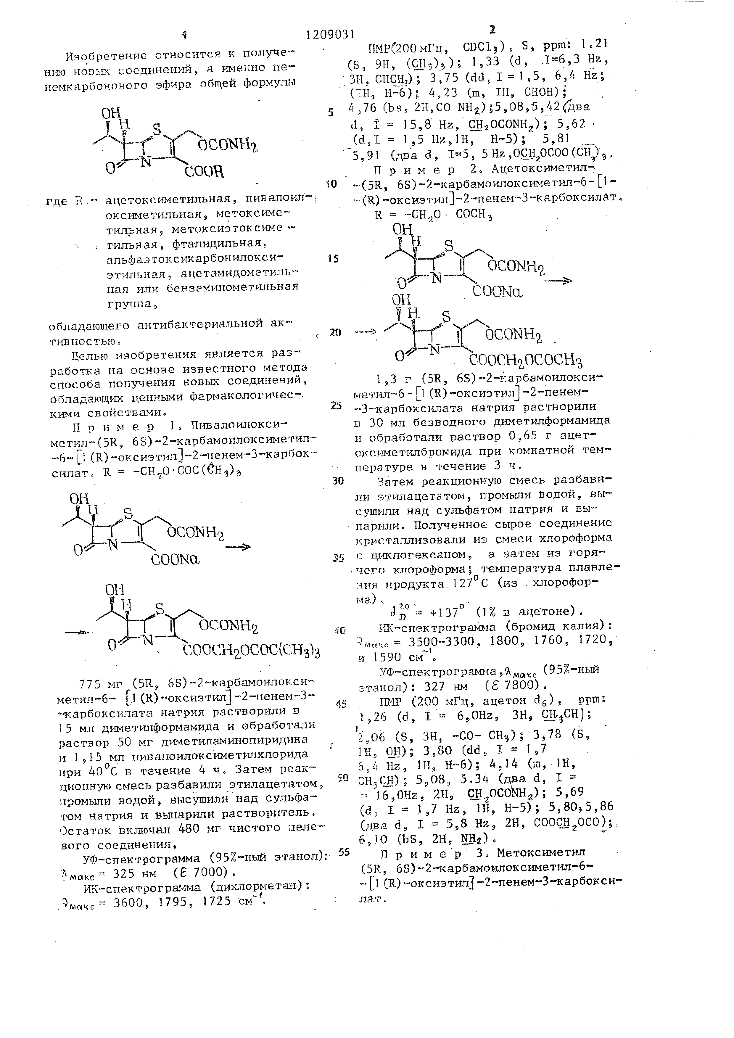 способа получения новых соединений, обладающих ценными фармаколог:ичес-.. к:ими свойствами. Пример 1. Пивалоилокси- метил(5К, б8)2-карбамоилоксиметил-