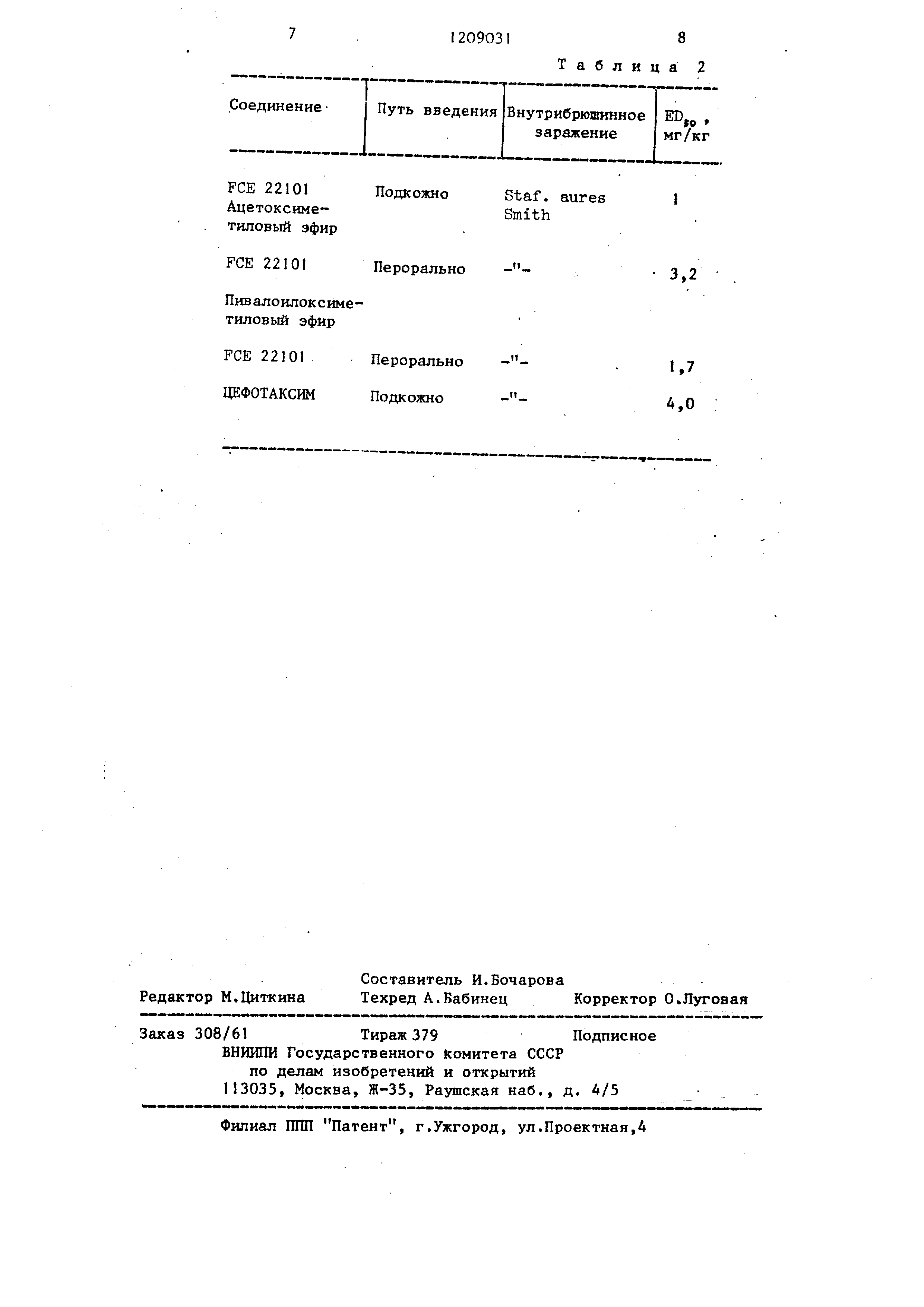 113035, Москва, Ж-35, Раушская наб., д. 4/5 Филиал ШШ Патент, г.Ужгород, ул.Проектная,4 Таблица 2 Внутрибрюшинное заражение EI5«,. мг/кг Staf. aures Smith 3,2 1,7 A,0