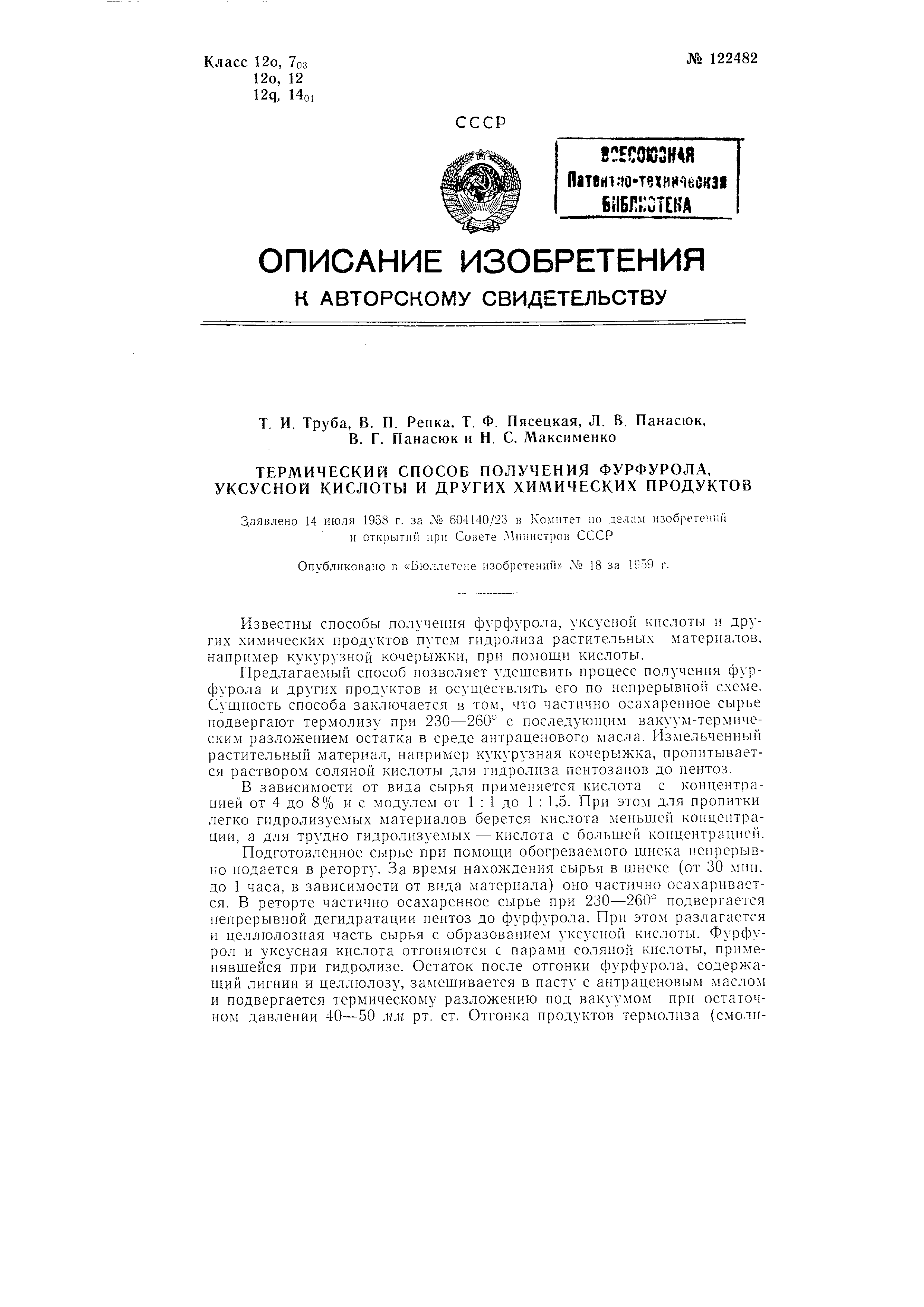 Термический способ получения фурфурола, уксусной кислоты и других химических продуктов путем гидролиза растительных материалов,