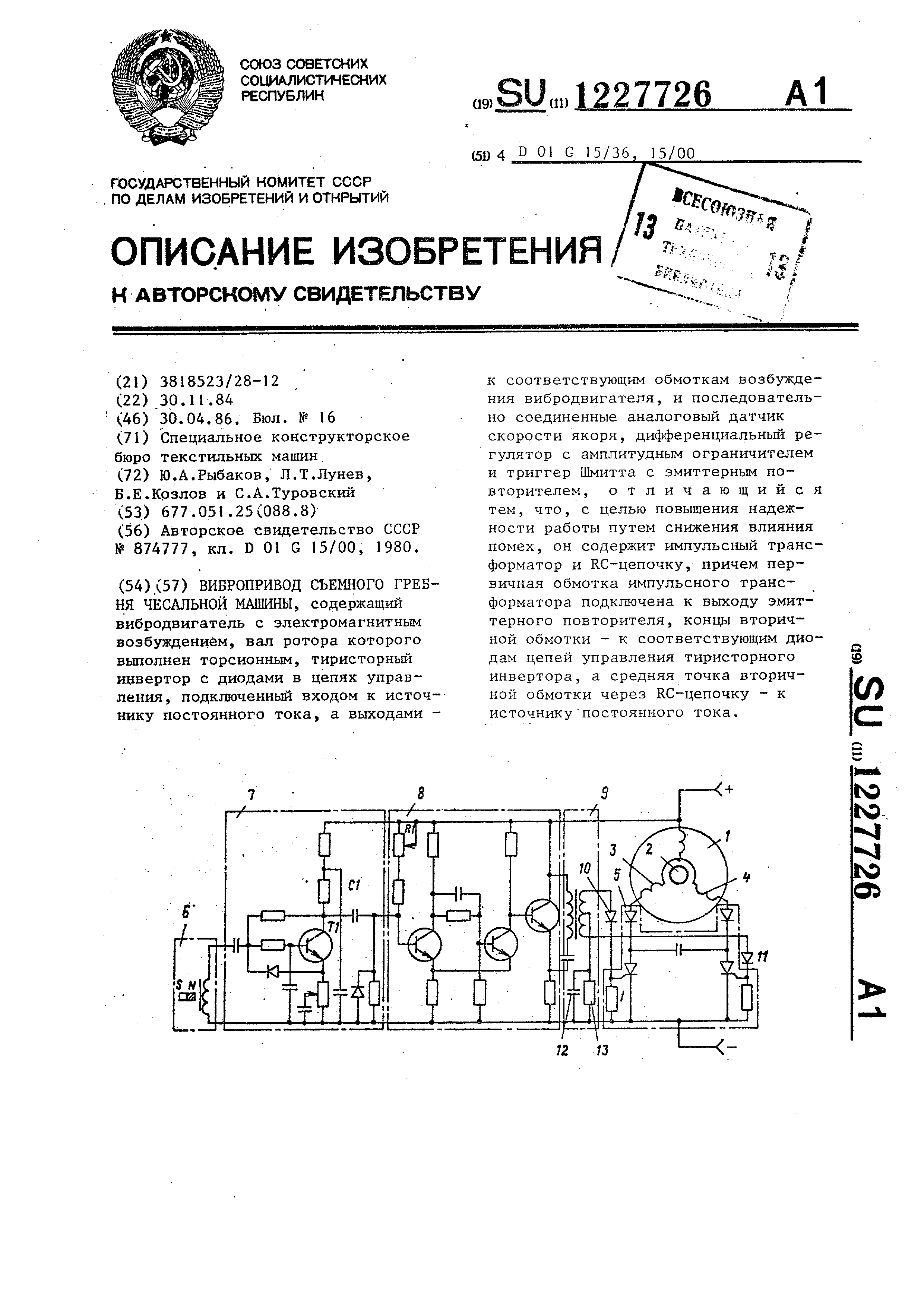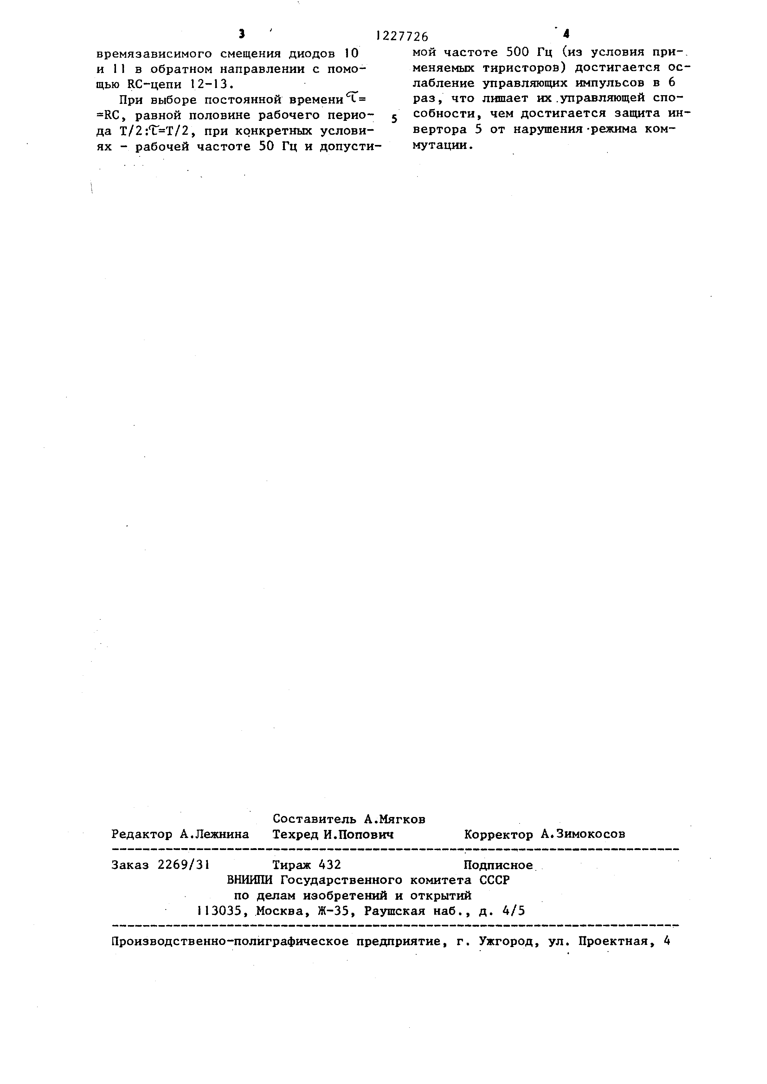 между соседними импульсами сильно сокращен. Достигается это за счет 5 1227726 времязависимого смещения диодов 10мой частоте 500 Гц (из условия при-, и 11 в обратном направлении с помо-меняемых тиристоров) достигается осщью RC-цепи 12-13.лабление управляющих импульсов в 6 При выборе постоянной времени раз, что лишает их .управляющей , равной половине рабочего перио- 5собности, чем достигается защита инда
