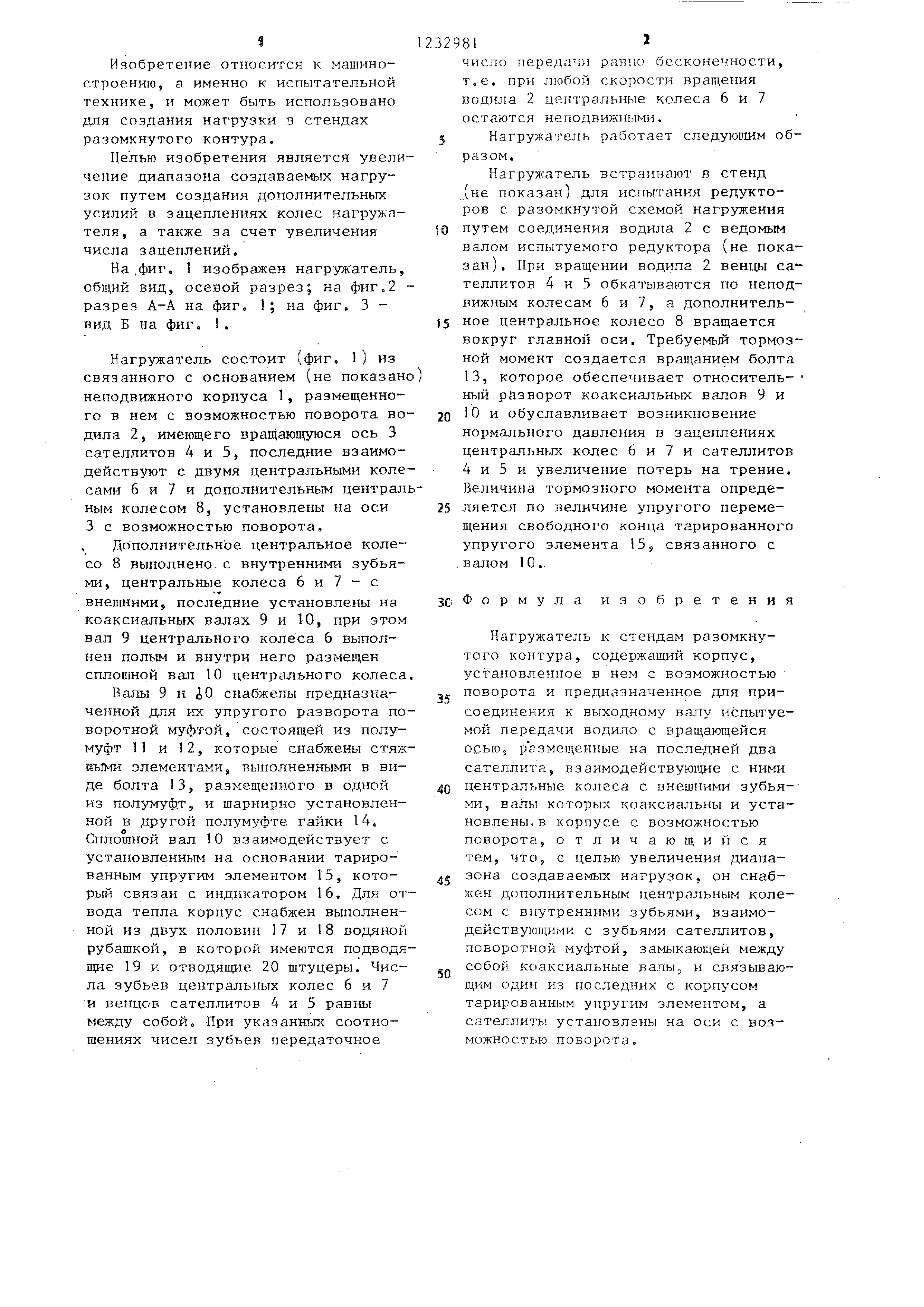 т.е, при любой скорости вращения водила 2 центральные колеса 6 и 7 остаются неподвижными. 5 Нагружатель работает следующим образом , Нагружатель встраивают в стенд