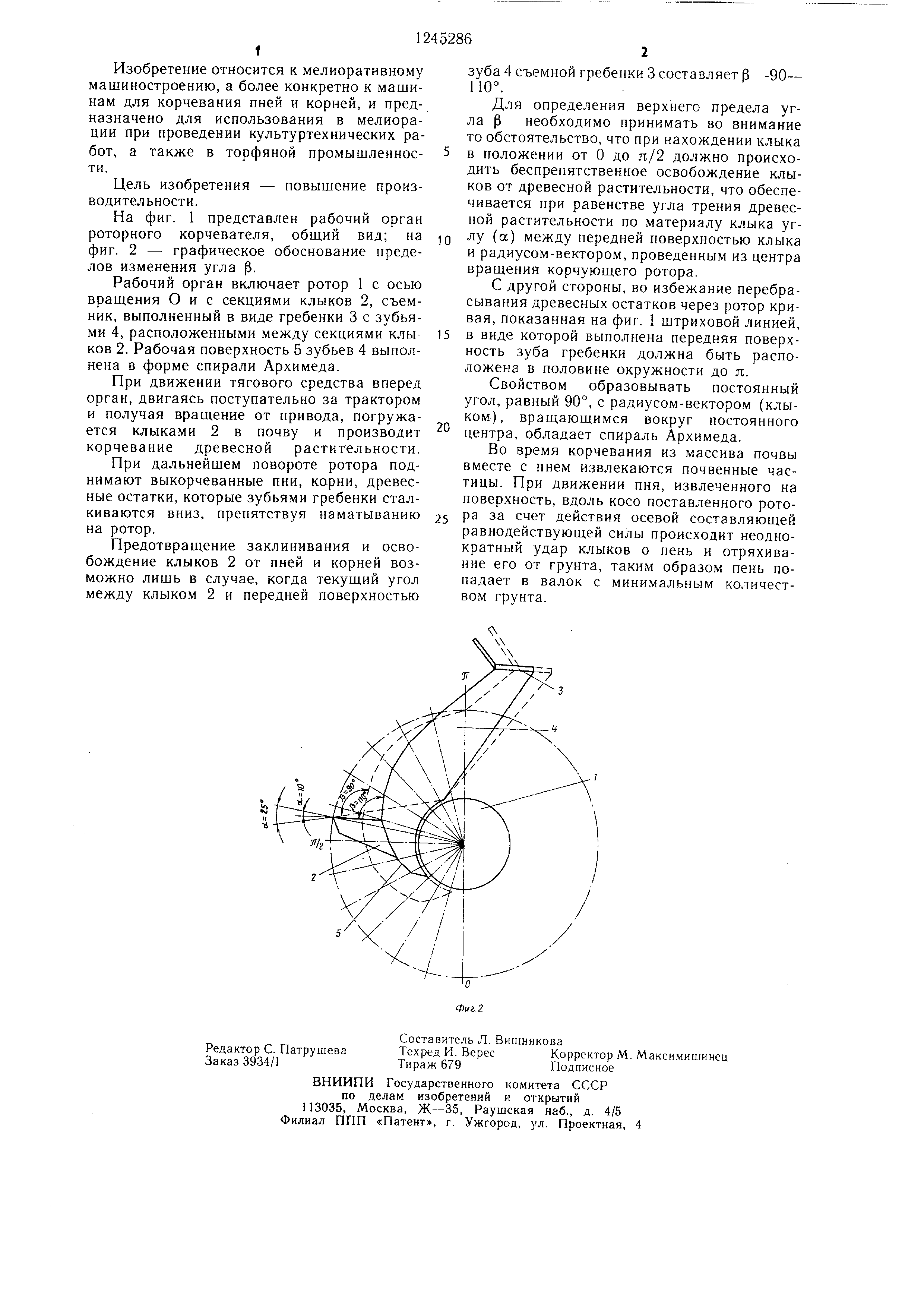 фиг. 2 - графическое обоснование пределов изменения угла р. Рабочий орган включает ротор 1 с осью враш.ения О и с секциями клыков 2, съемник