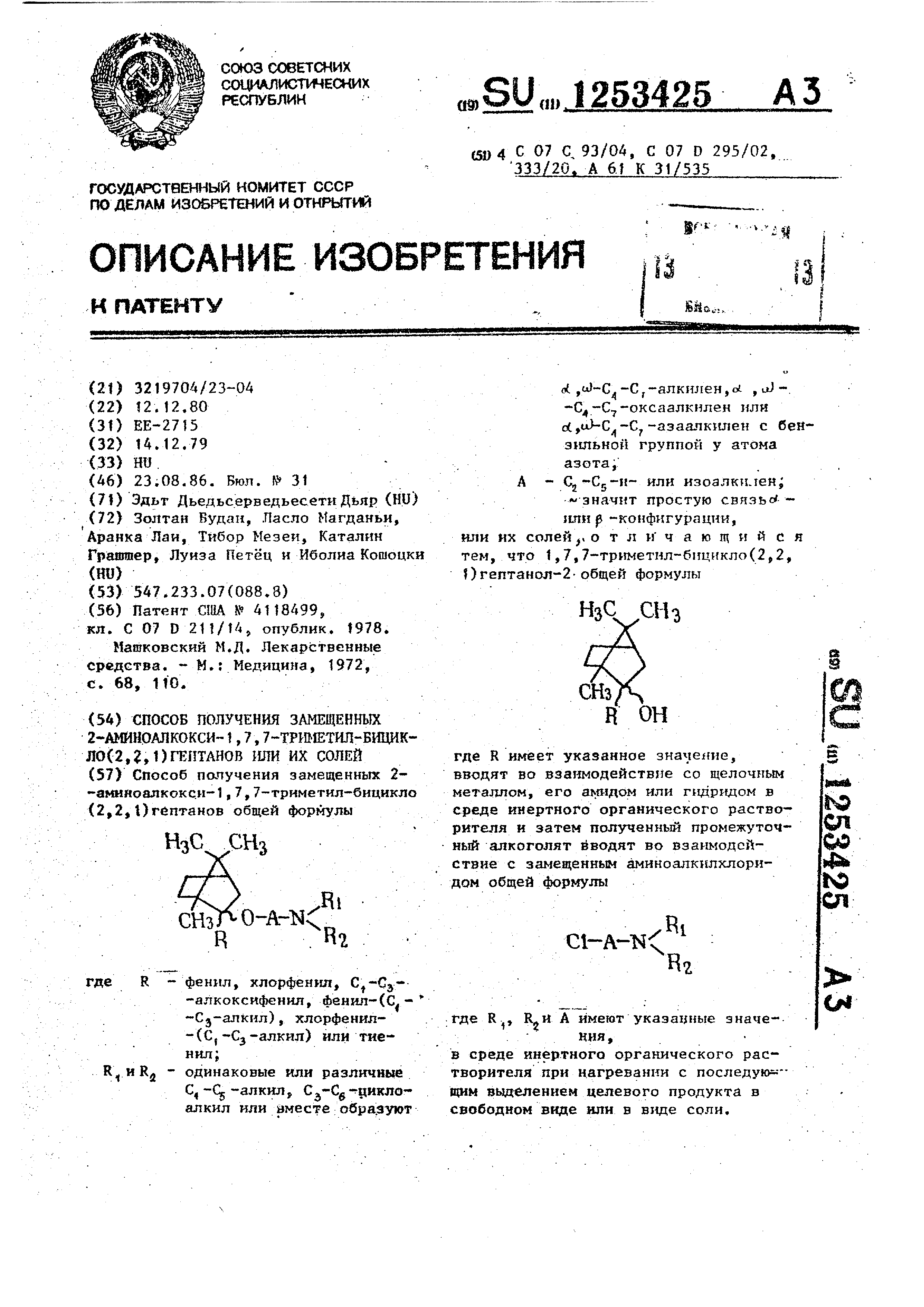 получения новых замещенных 2-амино- алКокси-1,7,7-триметил-бицикло(2,2,1)- -гептаиов общей формулы 125 1) де R л« С ,-СлСНгТ О-А-кС R Вг - фенил, хлорфения, -алкоксифёнил, фенил-(