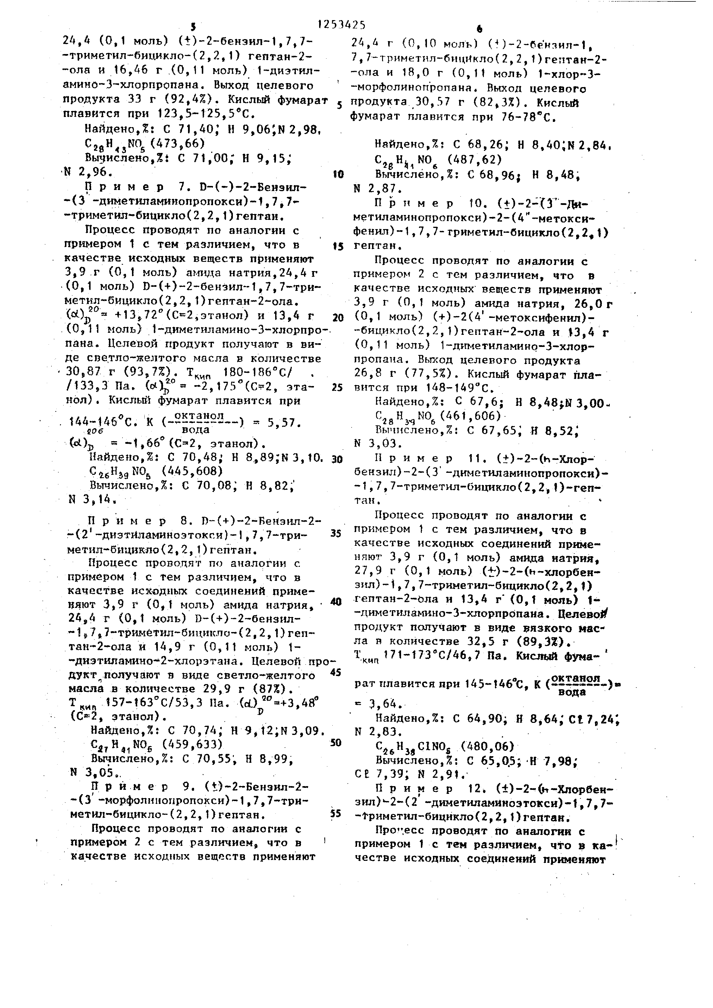 29,7 г (85,96%). Т кислого фумара- та 149-151 С. Найдено,Z; С 8,01; Н 8,6r,N 3,11 (461,6) Вычислено,%: С 67,76, Н 8,52; N 3,03. 45 30 Пример 23. (н)-2-Бензил-2- -(2 - метил-З -диметиламинопропокси)- ,.-1,7,7-триметил-бицнкло(2, 2,1)гептан