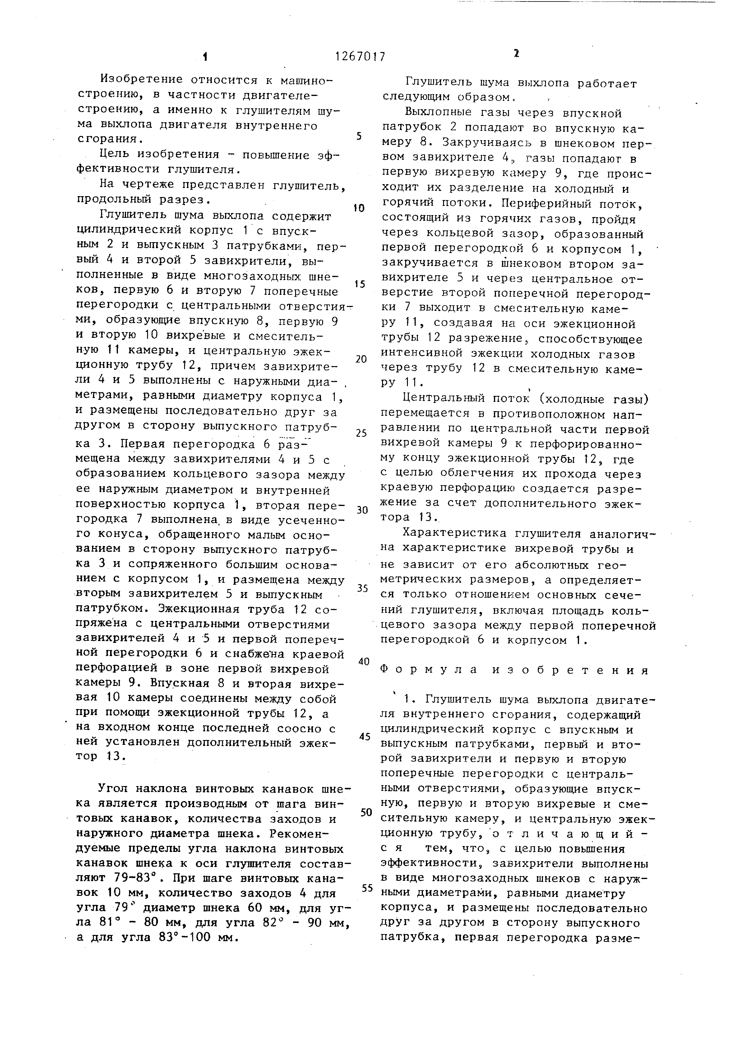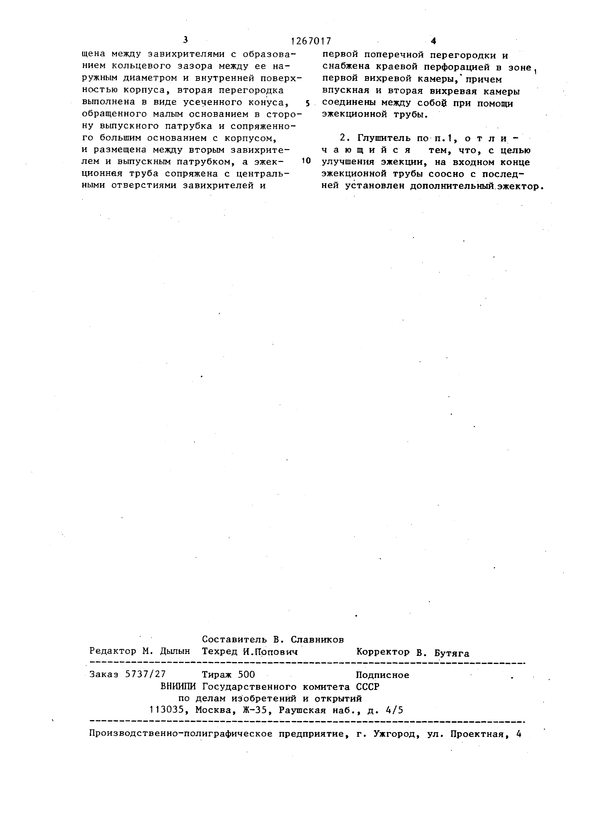 патрубка, первая перегородка разме312670174 щена между эавихрителями с образова-первой поперечной перегородки и нием кольцевого зазора между ее на-снабжена краевой перфорацией в зоне, ружным диаметром и внутренней поверх-первой вихревой камеры,причем ностью корпуса, вторая перегородкавпускная и вторая вихревая камеры выполнена в виде усеченного конуса, 5соединены между собой при помощи обращенного малым основанием в сторо-эжекционной трубы.