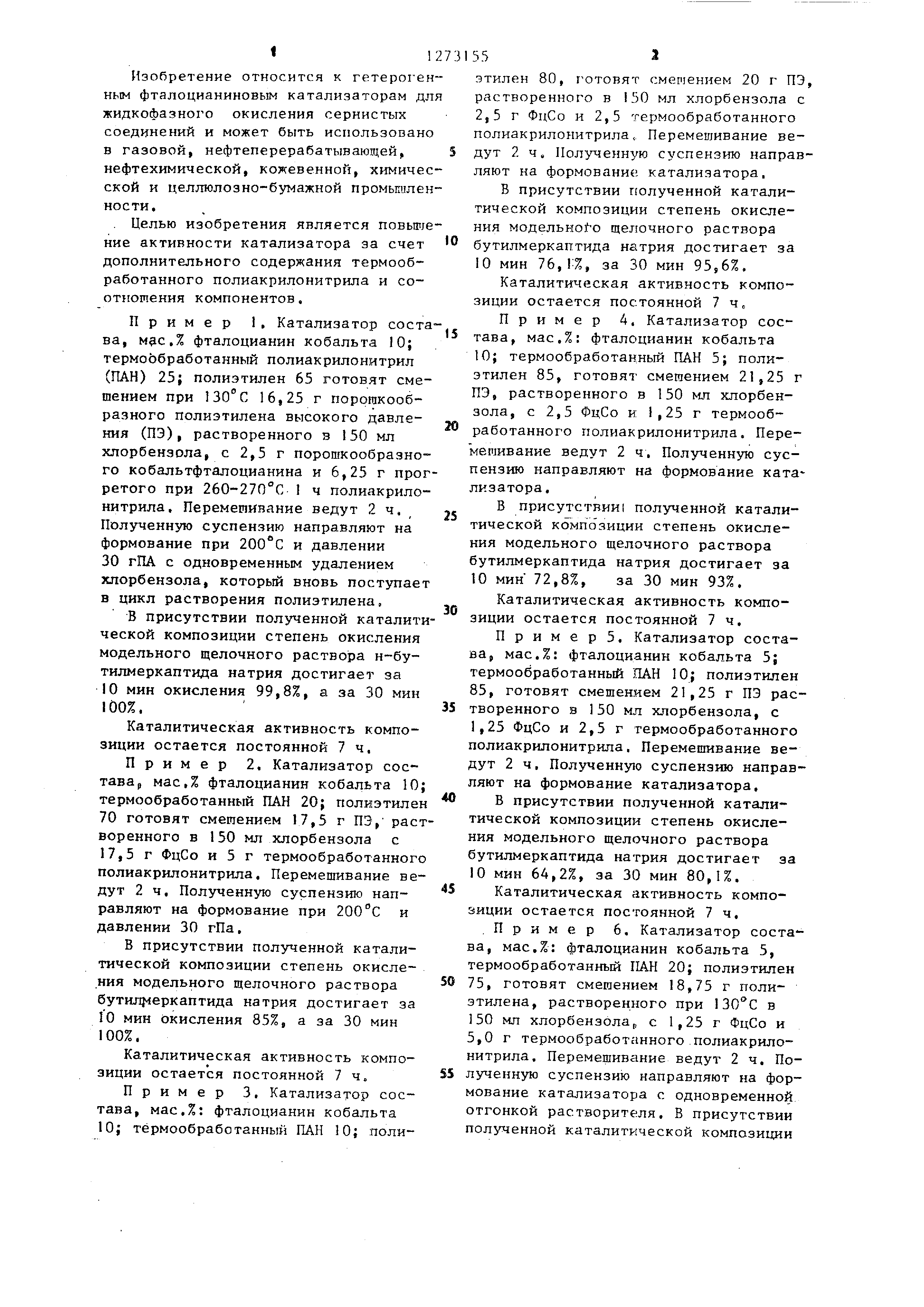 остается постоянной 7 ч, Пример 2. Катализатор состава , мас,% фталоцианин кобальта 10