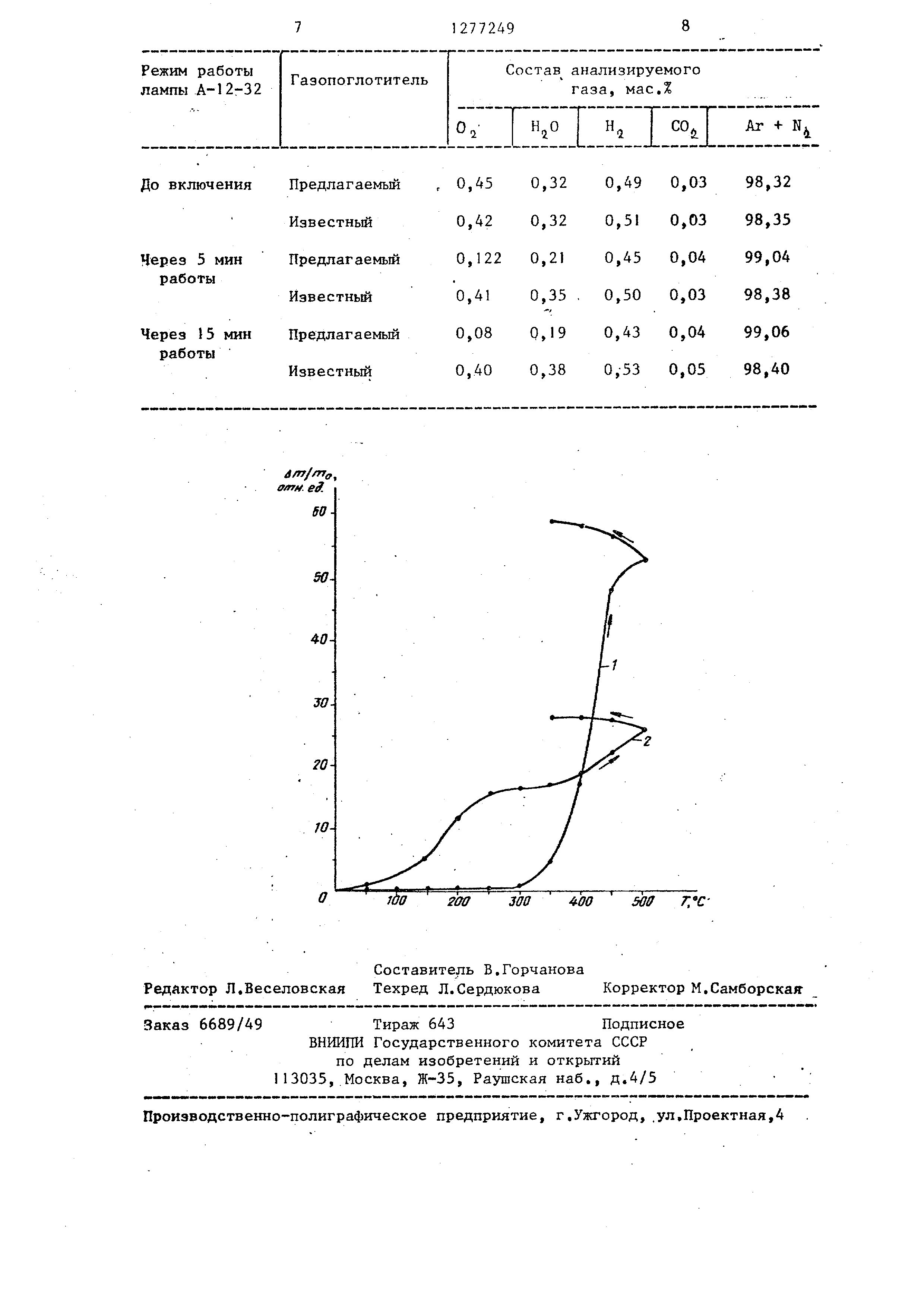 активность газопоглотителя, ю скорость поглощения, а следователь ч1 но, срок службы ламп. 1 ил,, 1 табл. со