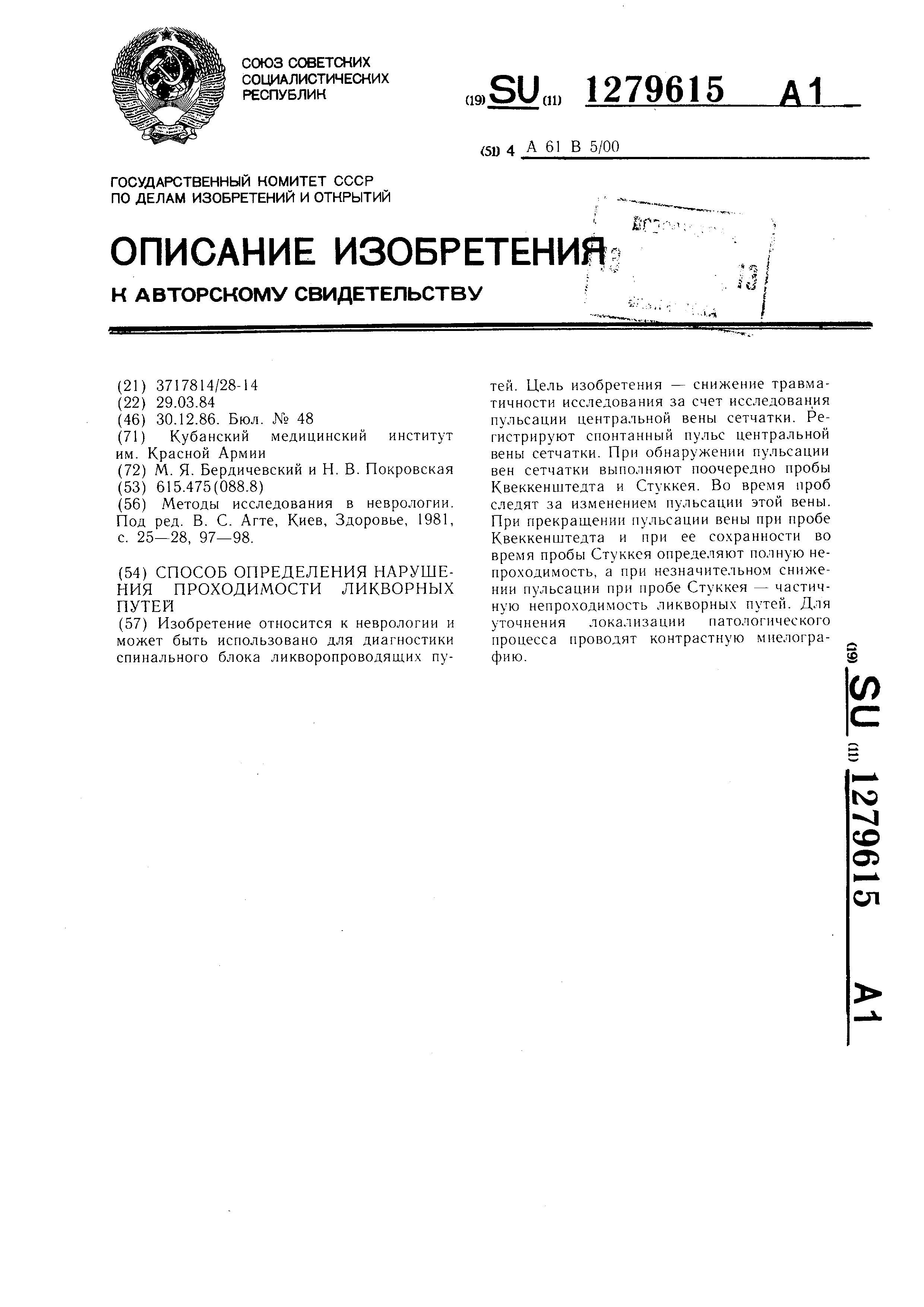 Изобретение относится к неврологии и может быть использовано для диагностики спинального блока ликворопроводящих путей . Цель изобретения - снижение травматичности исследования за счет исследования пульсации центральной вены сетчатки. Регистрируют