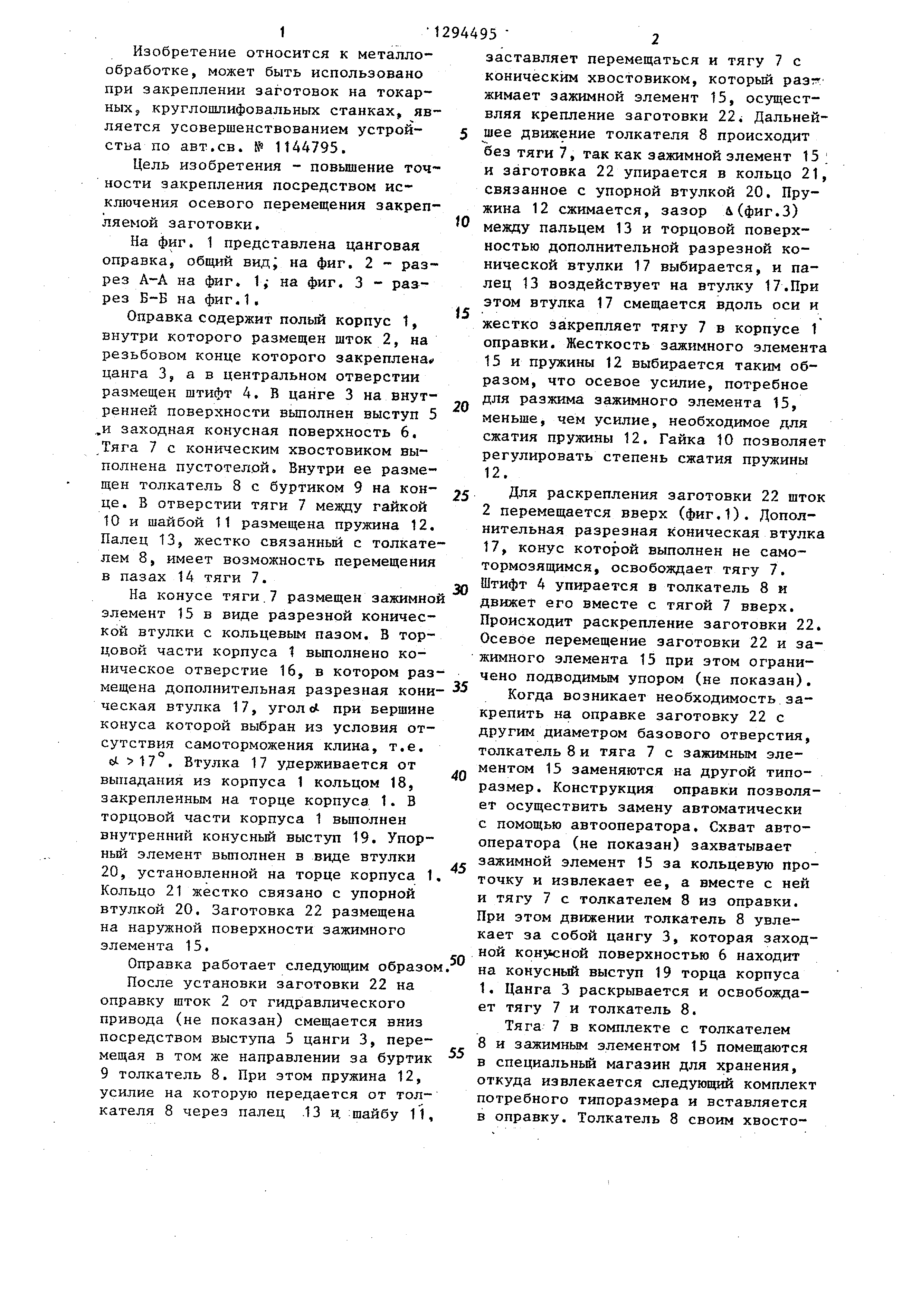 элемента 15 при этом ограничено подводимым упором (не показан). Когда возникает необходимость закрепить на оправке заготовку 22 с