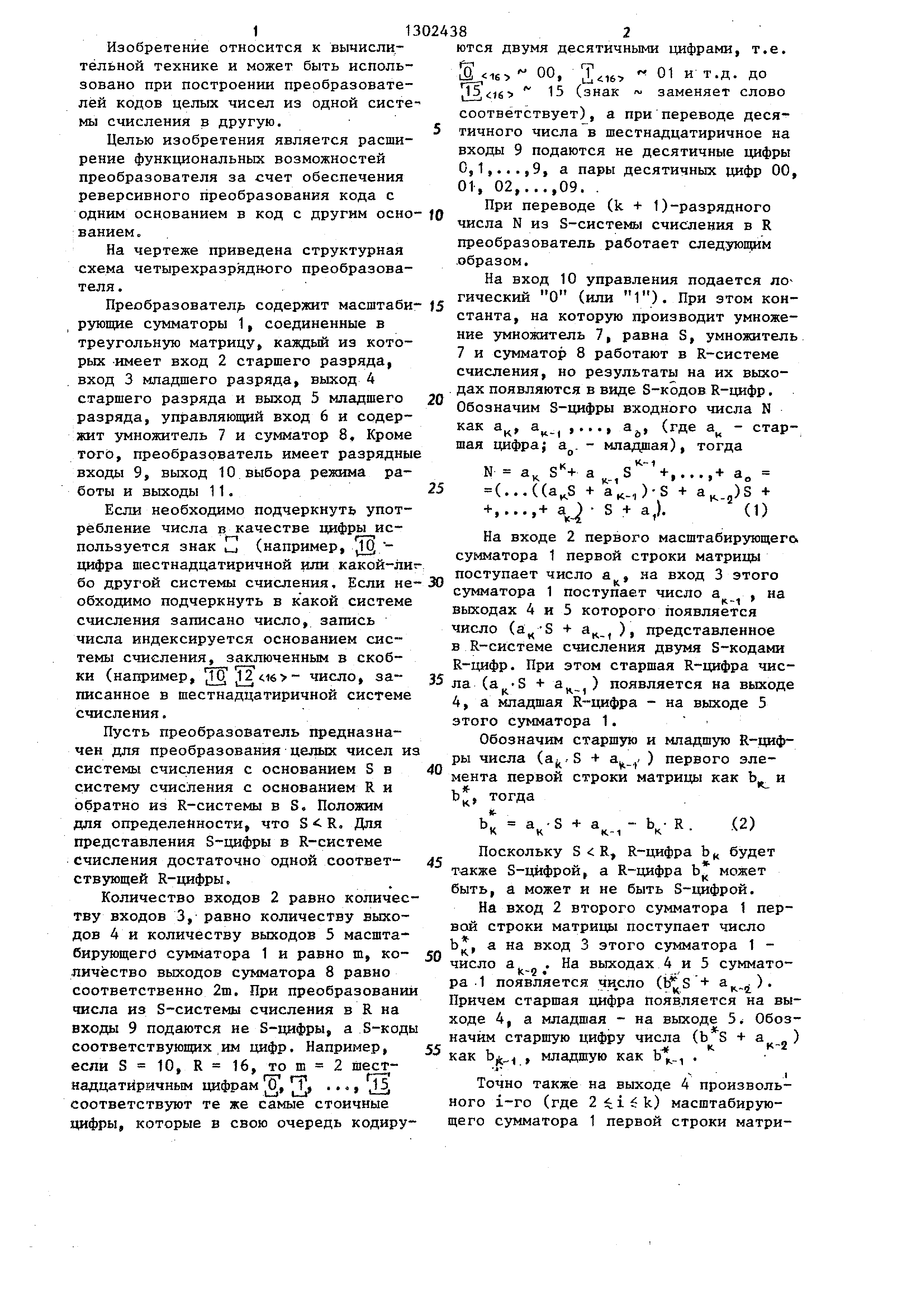 Изобретение относится к области вычислительной техники и может быть использовано при построении преобразователей кодов чисел из одной системы счисления в другую. Целью изобретения является расширение функциональных