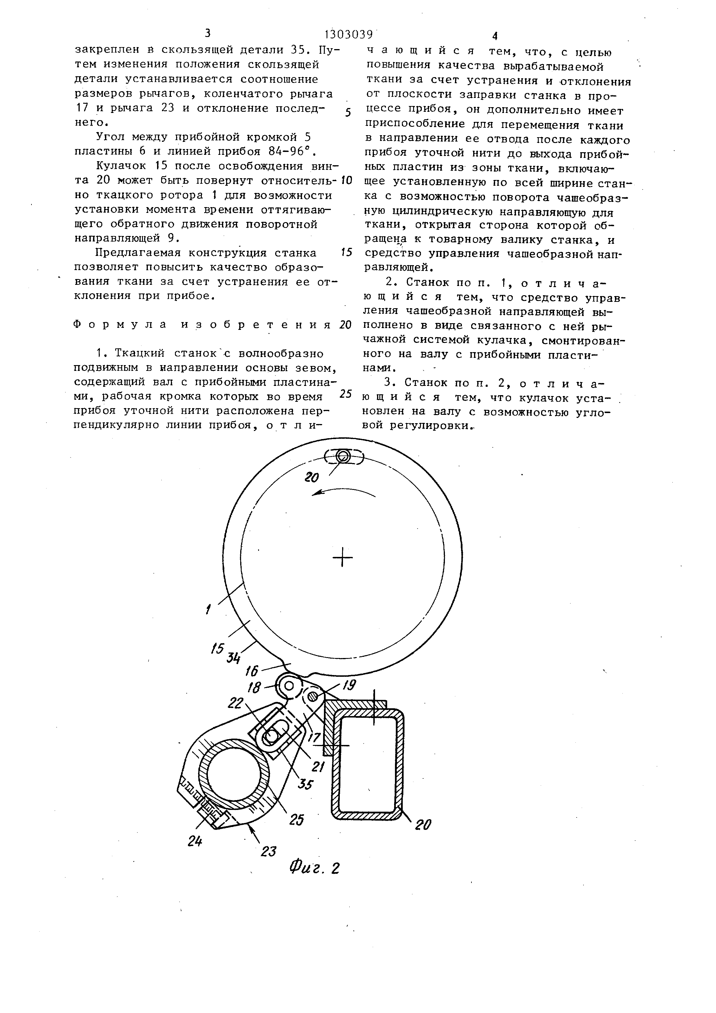с имеющи:м круговую форму отрезком 34 кулачка 15 с большим ходится на ткацком роторе 1 (показан50 радиусом, так что коленчатьй рычаг только один выступ 16). С кулачком-|7 поворачивается по часовой стрелке. 15 взаимодействует коленчатьй рычагНижняя кромка 8 поворотной направляю17 , которые имеет следящий ролик 18.шей 9 при этом приподнимается, и ткань