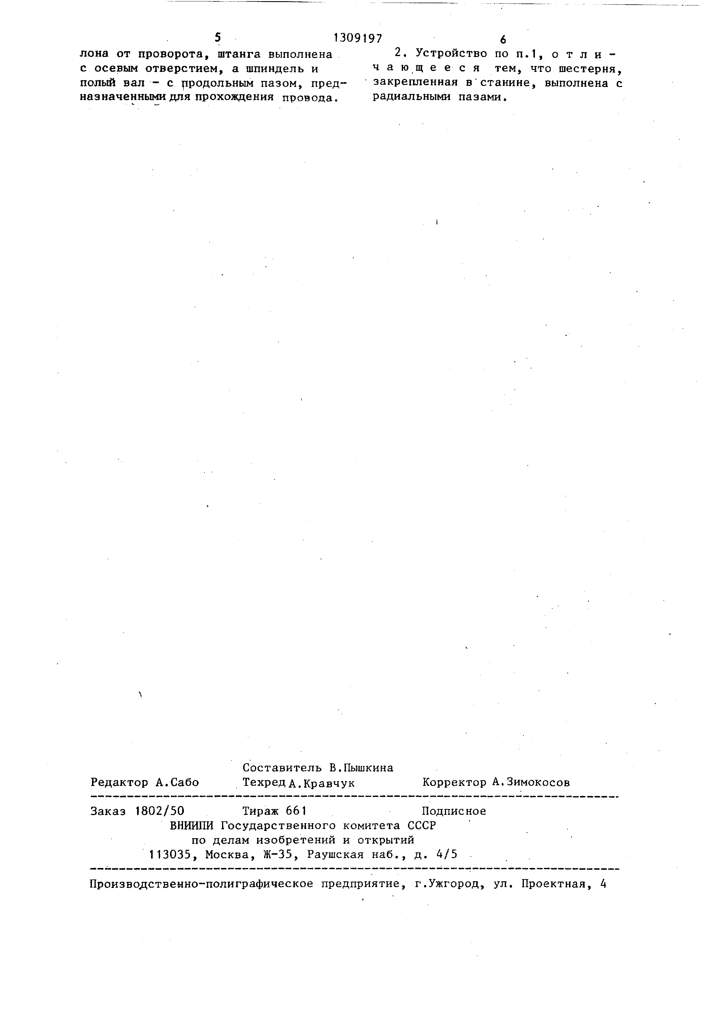 снабжена пальцем для удержания щаб513091976 лона от проворота, штанга выполнена 2. Устройство по п,1, о т л и - с осевым отверстием, а шпиндель и чающееся тем, что шестерня,
