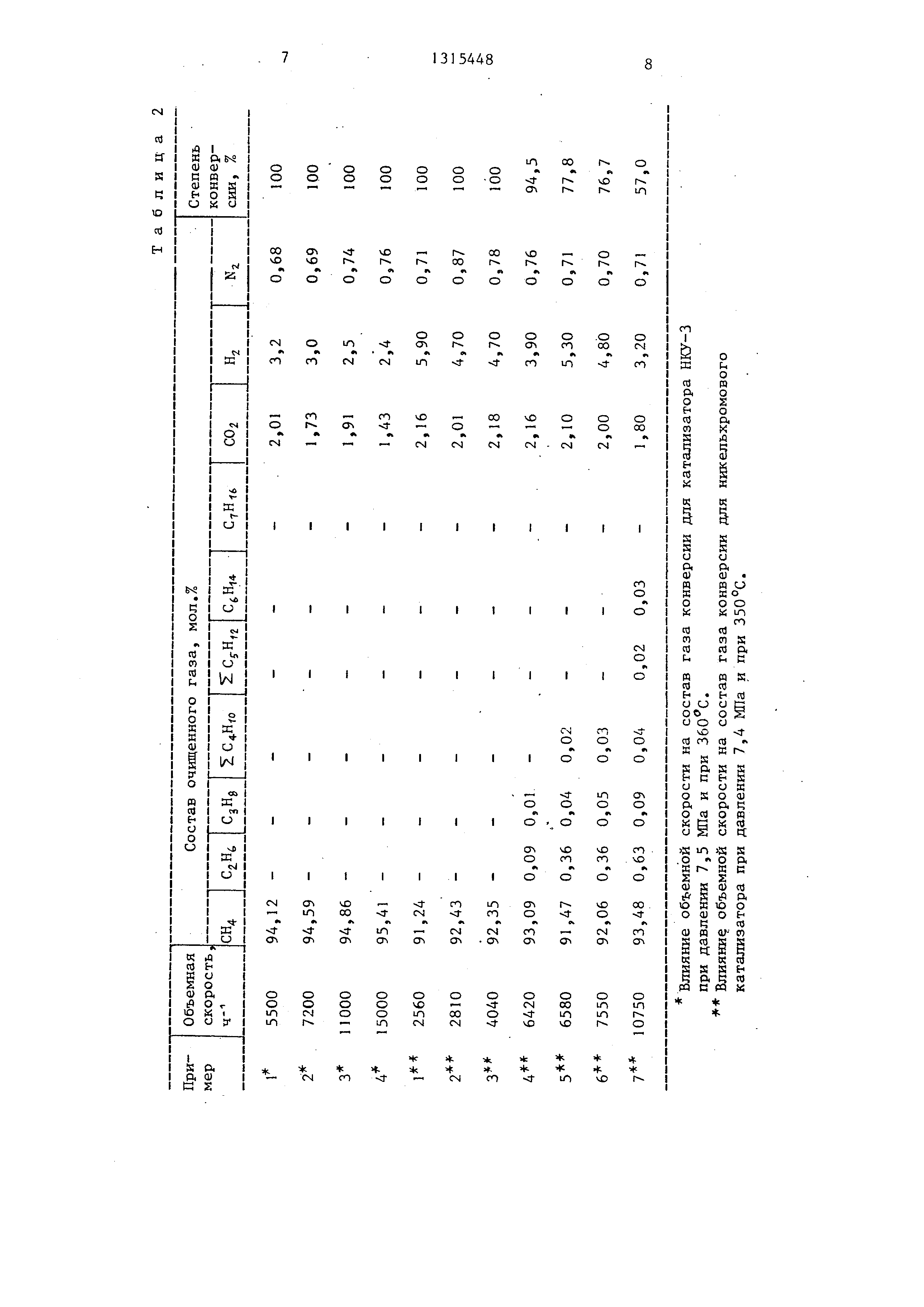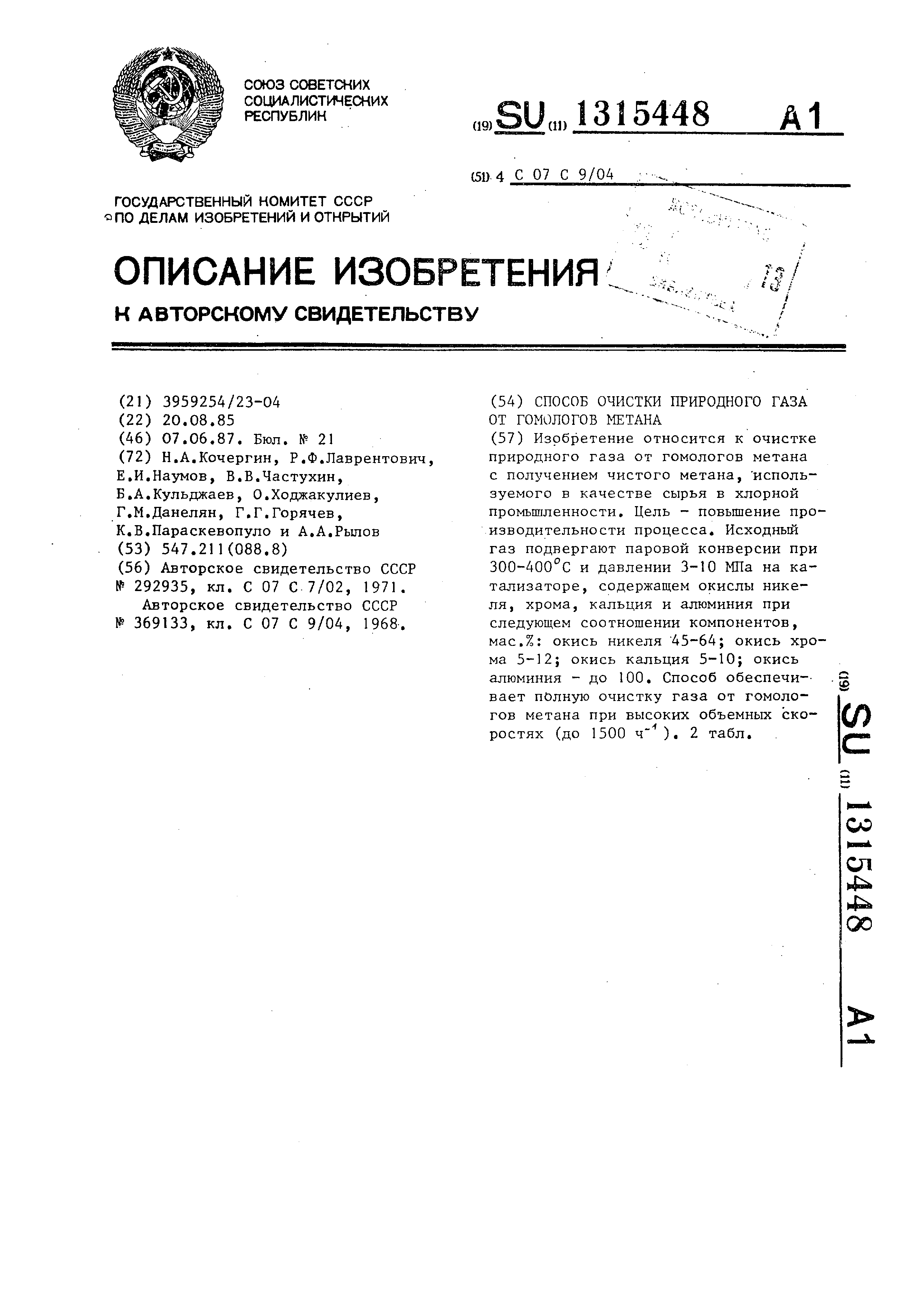 Изобретение относится к очистке природного газа от гомологов метана с получением чистого метана,, посшед- НИИ, не содержащий примесей гомологов ,, используется в качестве сырья, например, в хлорной промышленности. Цель изобретения - повьшер1ие про- иаводительности процесса,, Поставленная цель достигается за счет использования более активного катализатора, позволяющего проводить очистку с большой глубиной при более высоком давлении и высоких скоростях подачи очищаемого сырья. Пример 1, Получение катализатора , 504 г основного карбоната никеляj I86 г алюмината кальция и 84 г окиси алюминия совместно измельчают в шаровой мельнице до размера частиц менее 0,05 мм. Полученную смесь загружают в смеситель и добавляют 1500 мл 25%-ного аммиака и перемещивают 2- 3ч, Соотношение жидкой и твердой фаз должно составлять 2-2,il. Включают обргрев и доводят массу до густой пасты, которую обрабатывают, раствором хромовой кислоты (63 г СгО, в 530 мл воды) при 70-80°С в течение 3-4 ч а Затем пасту сушат при JOO- )30 С в течение 10-15 ч и прокаливают при в течение 10 ч, В прокаленную массу добавляют 2% графита и 4% воды, измельчают и таблетируют Получают катализатор состава, мас.%: NiO 50; 8; СаО 7; AljOj - остальное , Алалогично получают катализатор с соотношением компонентов в интерзале , масе%: Окись никеля45-64 Окись хрома5-12 Окись кальция5 0 Окись алюминия До 100 Пример 2„ В металлический реактор объемом 300 мл внутренним диаметром 30 мм загружают 100 мл никель- алюмохромокальциевого катализатора состава, мас.%: NiO 45; 5; СаО 5-; - остальное Катализa i op восстанавливают водородом при 400 С, давлении 0,6 Ша, объемной скорости подачи 5000 в течение 4 ч. Присн родньш газ составаJ молс%; 95,87; ,32; 0„22; ,,, ,0,1; ,2 0,06; , 0,08; ,: 0,05:, 0,02; СО. 1,5,:; N 0,78 подают в реактор для очистки с объем5 0 5 ной скоростью 4000 ч- при соотношении пар : газ по массе 0,1:1, температуре и давлении 3 МПа. Очищенный природный газ, выходящий из реактораj рмеет следующий состав, молЛ: СН 93,07; СО 2,23; Н 4,01; N 0,7. Примерз, Данные по реактору и составу исходного газа аналогичны примеру 2 Используют катализатор состава, мас,%: N10 64;. 12; СаО 10; - остальное. Процесс конверсии проводят при 400 °С, 10 hffla, объемной скорости 15000 и соотнощении пар : : газ по массе О,. 13:1. Очищенньш природный газ, выходящий из реактора имеет следующий состав , мол,%; СН... 94.36; СО 2,43; Н,, 2,51; N 0,7, И р и м е р 4, Данные по реактору и составу исходного природного газа аналогичны примеру 2, Используют катализатор состава, мас,%: NiO 45; Cr. 5; СаО 5; Al2 0,- остальное. Процесс конверсии проводят при 360 С, давлении 7,5 Ша, объемной скорости 1 1000 ч и соотношении пар : газ по массе 0,13:1. Очищенный природный газ, выходящий из реактора,, имеет следующий состав, мол.%: СН,, 94,86; С02 1,91; Hj 2,5; Ny 0,74. П р и м е р 5. Данные по реакто- 5 руэ составу исходного газа и катализатора аналогичны примеру 2, Процесс конверсии проводят при 315°С, давлении 7,5 Mia, объемлой скорости 7000 ч- и соотношении пар : газ по массе 0,2:1. Очищенный природный газ, выxoдяш iiI из реактора, имеет следующий состав мол,%;; СН 95,76; СО 1,8; Н я7; N2 0,74. Пример 6„ Природньш газ состава как в примере 2 очищают по известному и предлагаемому способам. В первом случае используют никельхро- мовый катализатор, во втором случае- катализатор по примеру 4 НКУ-3, Условия и результаты очистки представлены Б табЛо 1е Дз-нные, представленные в табл.1, показываютS что очистку по предлагаемому способу мопно осуществлять при давлениях до 10 М