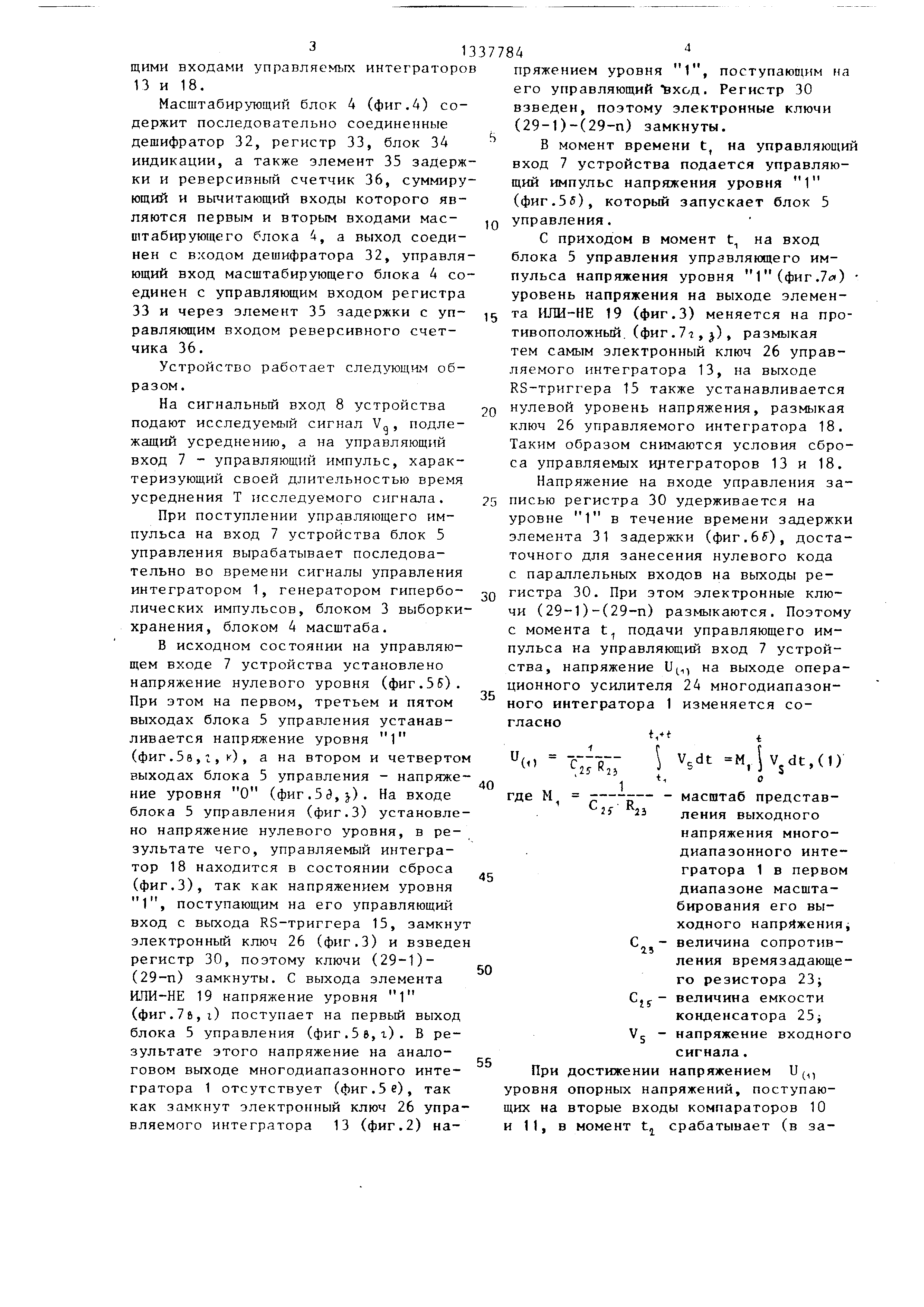 Изобретение может использоваться в устройствах технической диагностики по cneKTpajibHONry составу шумов и вибраций режимов работы различных промышленных объектов. Цель изобретения- повышение точности измерения. Устройство содержит интегратор 1, генератор 2 гиперболических импульсов, блок 3 выборки-хранения и блок 5 управления . Оснащение устройства масштабирующим блоком 4 и ключом 6 обеспечивает введение переме)1ного масштаба интегрирования и расширение диапазона вариаций времени усреднения исследуемого сигнала. В описании представлены примеры реализации блока 5 управления , интегратора 1, выполненного многодиапазонным , и масштабирующего блока 4. 4 з.п. ф-лы, 7 ил. с S (Л Фиг.