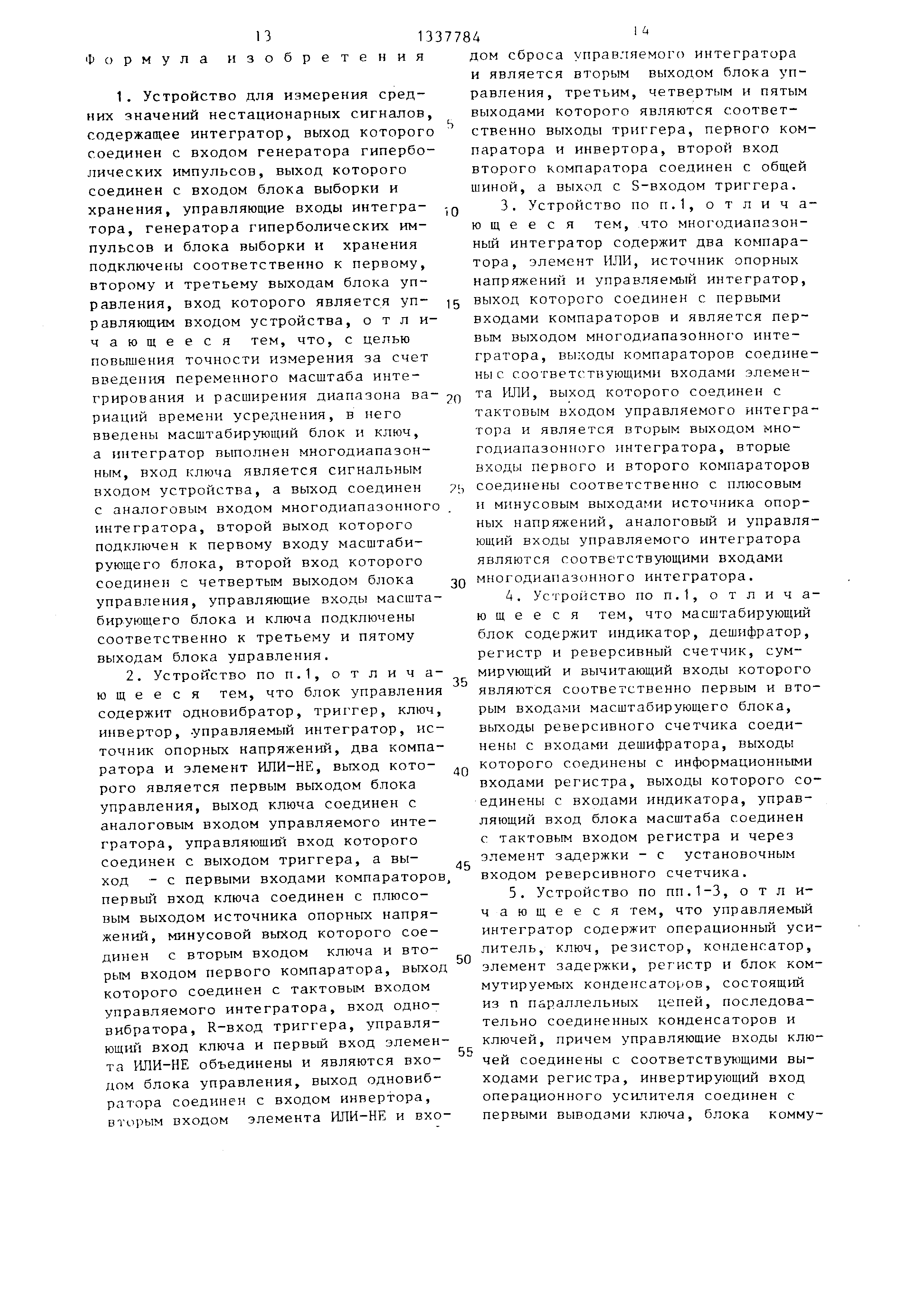 Устройство для измерения средних значений нестационарных сигналов содержит мтюгодиапазонный интегратор 1 , генератор 2 гиперболических импульсов , блок 3 выборки-хранения, масшта- бирующ1ш блок 4, блок 5 управления, ключ 6. На фиг.1 также показаны управляющий вход 7 и сигнальный вход 8 устройства который соединен с входом многодиапазонного интегратора 1, аналоговый выход которого соединен с входом генератора 2 гиперболических импульсов, выход которого соединен с входом блока 3 выборки-хранения, первый , второй и третий выходы блока 5 управления соединены соответственно с управляющими входами ключа 6 многодиапазонного интегратора 1, генера- 1тора 2 гиперболических импульсов, четвертый выход блока 5 управления соединен с управляющими входами блока 3 выборки-хранения и масштабирующего блока 4, первый и второй входы которого соединены соответственно с цифровым выходом многодиапазонного интегратора 1 и пятым выходом блока 5 управления.