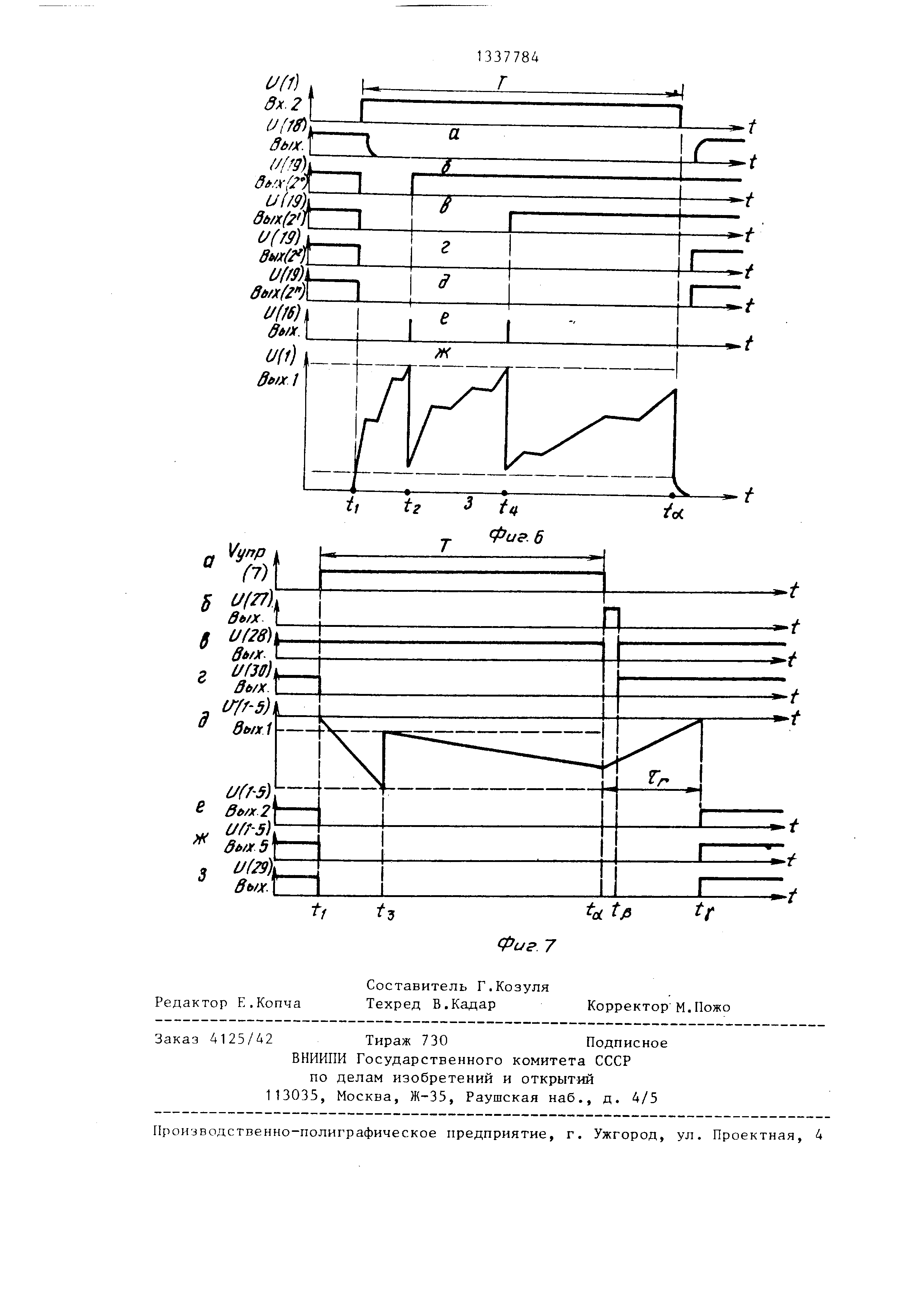 В исходном состоянии на управляющем входе 7 устройства установлено напряжение нулевого уровня (фиг.55). При этом на первом, третьем и пятом выходах блока 5 управления устанавливается напряжение уровня 1 (фиг.5в,г, к), а на втором и четвертом выходах блока 5 управления - напряжение уровня О (фиг .55, 5) . На входе блока 5 управления (фиг.З) установлено напряжение нулевого уровня, в результате чего, управляемый интегратор 18 находится в состоянии сброса (фиг.З), так как напряжением уровня 1, поступающим на его управляющий вход с выхода RS-триггера 15, замкну электронный ключ 26 (фиг.З) и взведе регистр 30, поэтому ключи (29-1)- (29-п) замкнуты. С выхода элемента ИЛИ-НЕ 19 напряжение уровня 1 (фиг.76,г) поступает на первый выход блока 5 управления (фиг.5 в,г). В результате этого напряжение на аналоговом выходе многодиапазонного интегратора 1 отсутствует (фиг.5е), так как замкнут электронный ключ 26 управляемого интегратора 13 (фиг.2) на37784