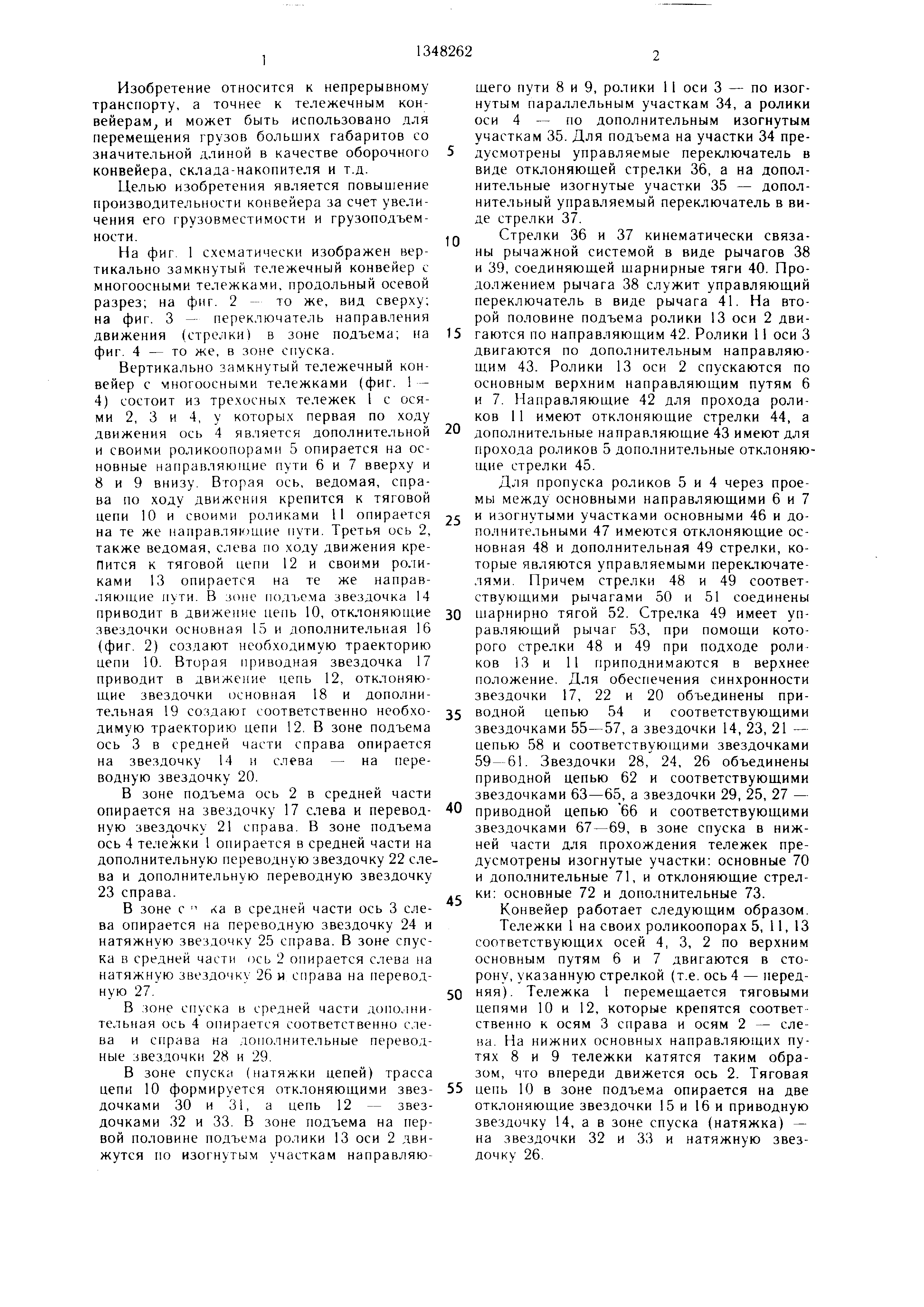 и дополнительные 71, и отклоняющие стрелс ки: основные 72 и дополнительные 73. Конвейер работает следующим образом. Тележки 1 на своих роликоопорах 5, 11, 13