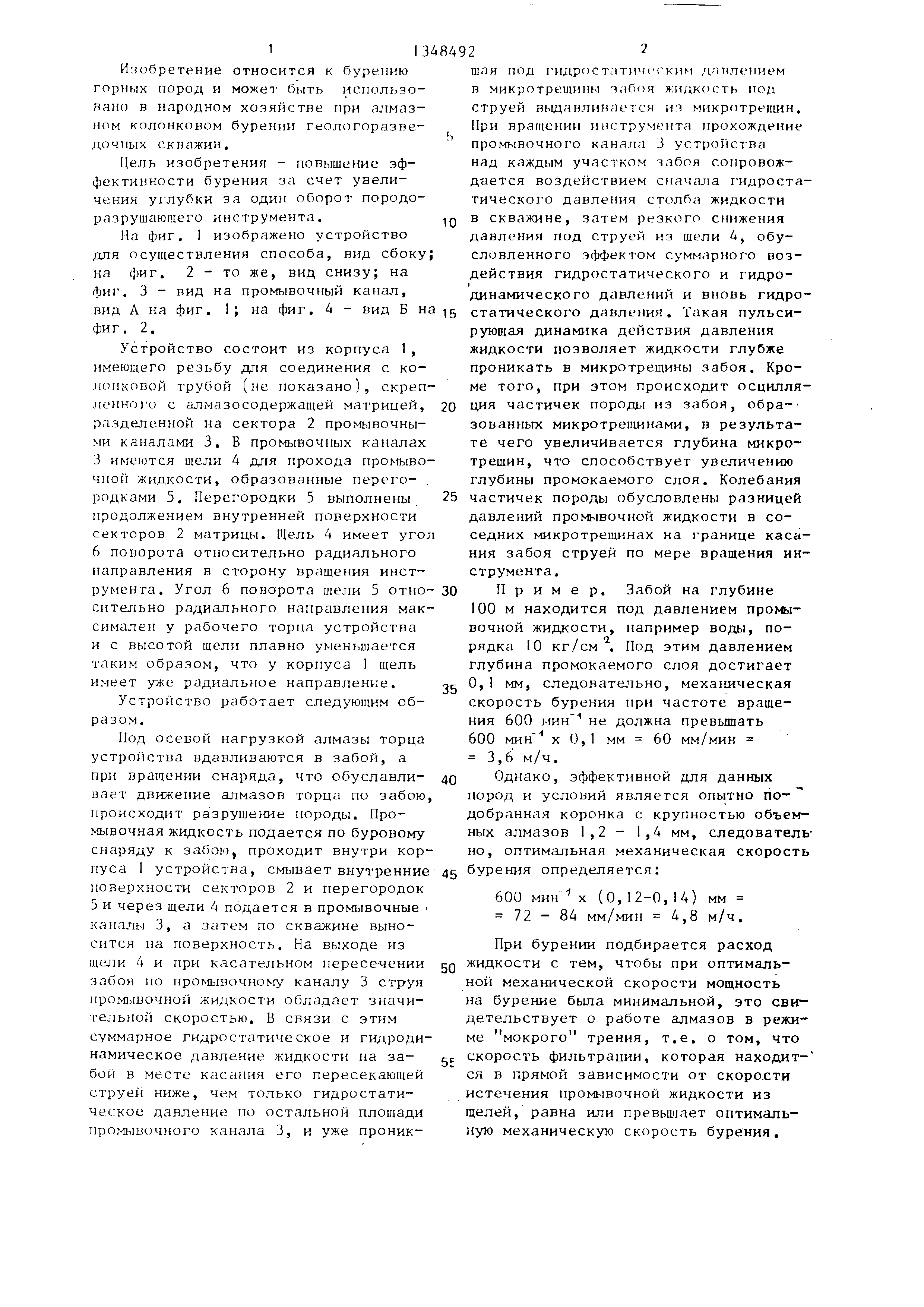 путем увеличения механической скорости бурения до максимальной для данной коронки и подачи промывочной жидкости на забой под пульсирую- шим давлением. 2.Устройство для алмазного бурения горных пород, включающее корпус и алмазосодержащую матрицу, разделенную на сектора промывочными каналами, отличающееся тем, что- в каждом промывочном канале со стороны внутренней поверхности секторов