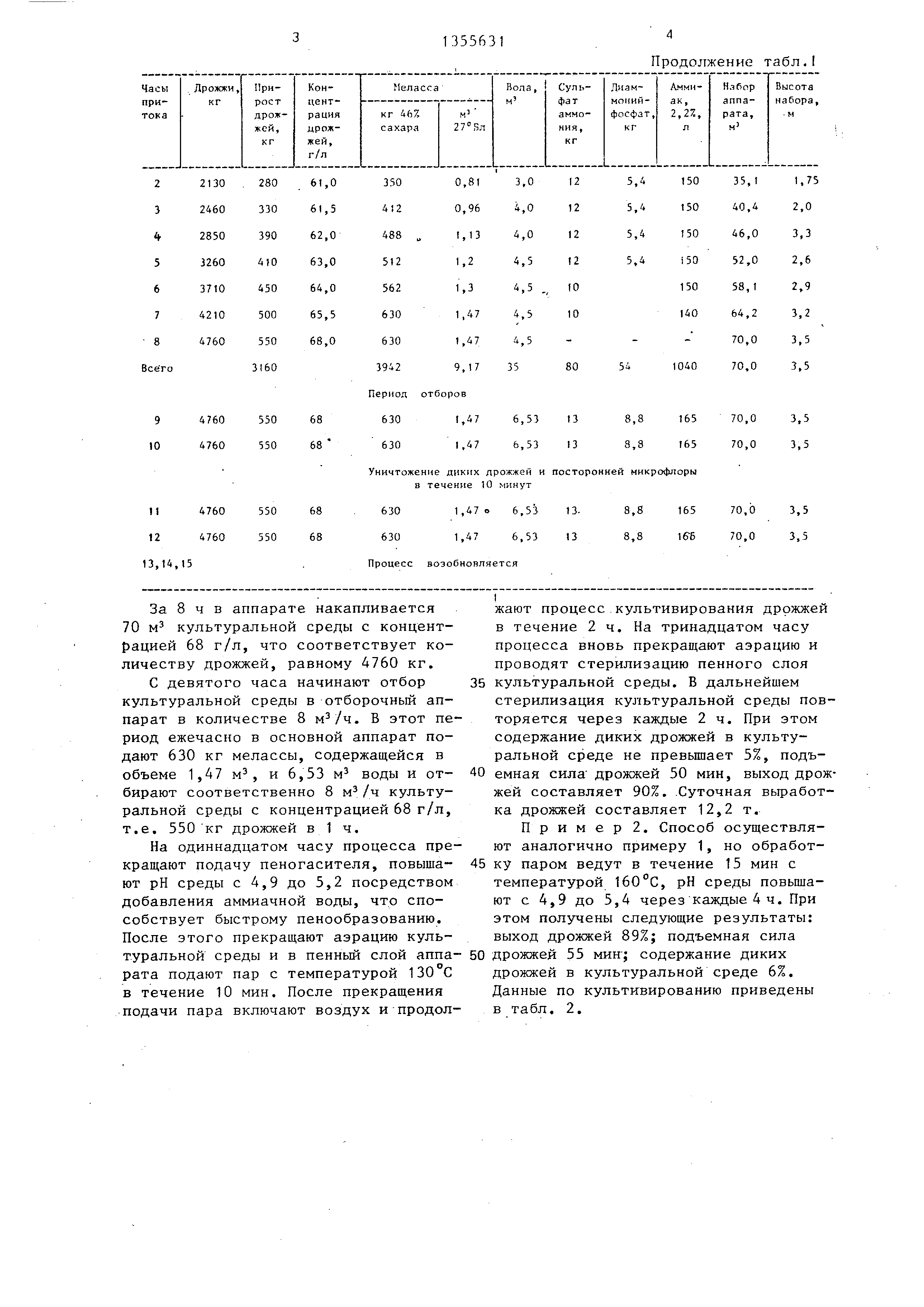 подачи пара включают воздух и продолПродолжение табл,1 жают процесс культивирования дрожжей в течение 2ч. На тринадцатом часу