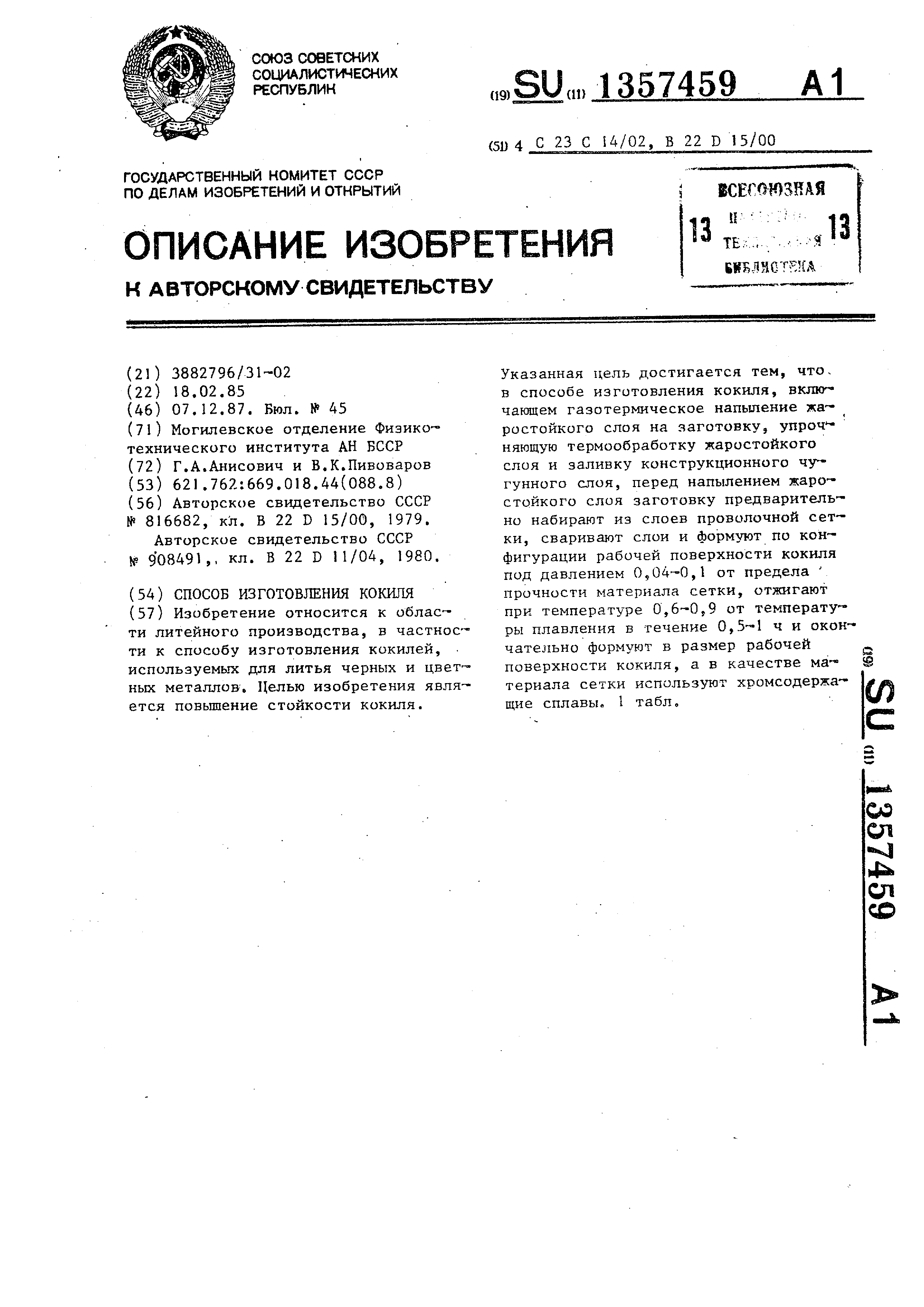 имитирующих условия работы кокилей. В таблице приведены примеры изготовления