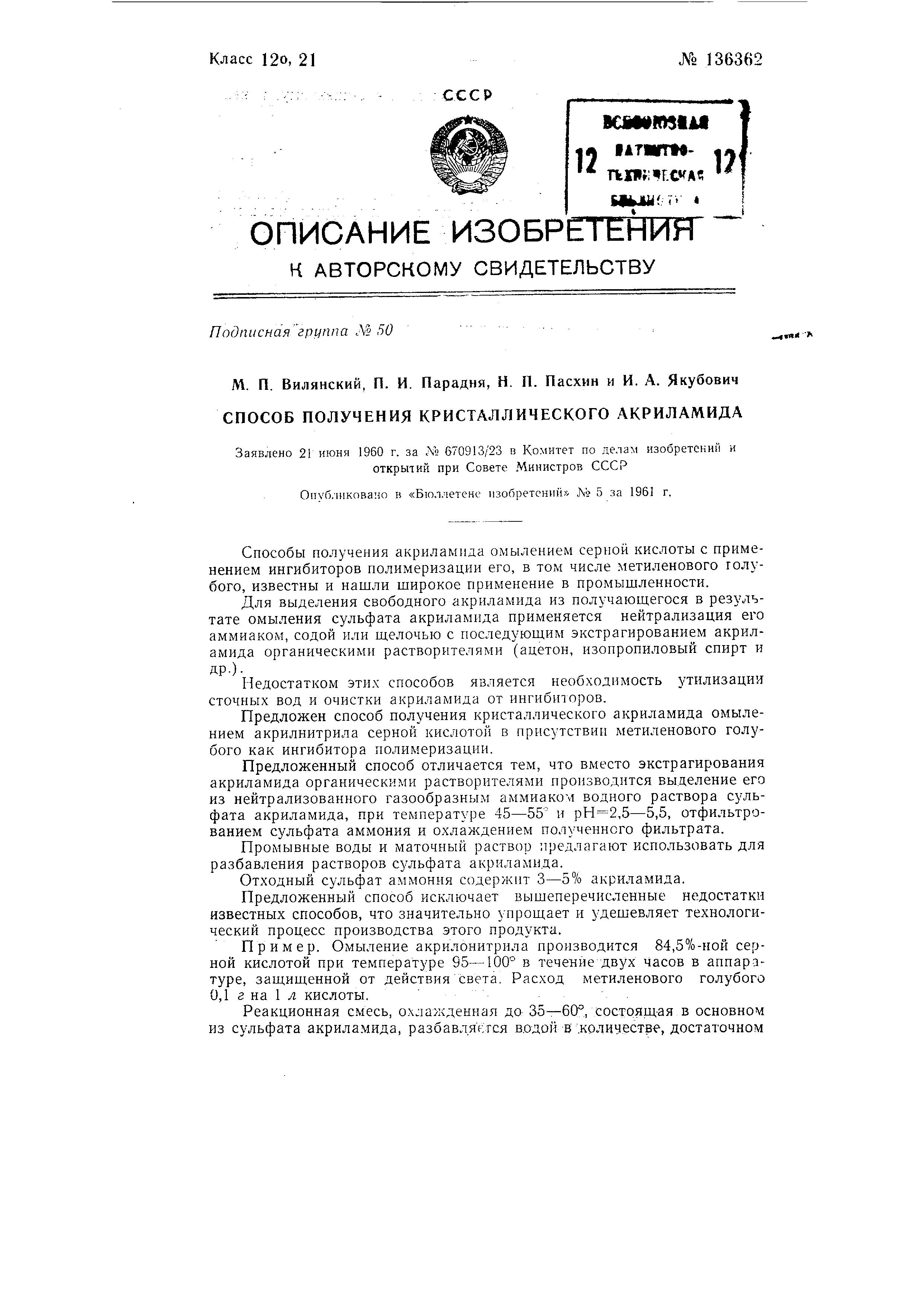Л 136362-2для «олучения раствора акриламида, близкого к насыщенному, и нейтрализует я -азооб1 а ым аммиаком до ,5-5,5 при 45-55° при перемешивании.|