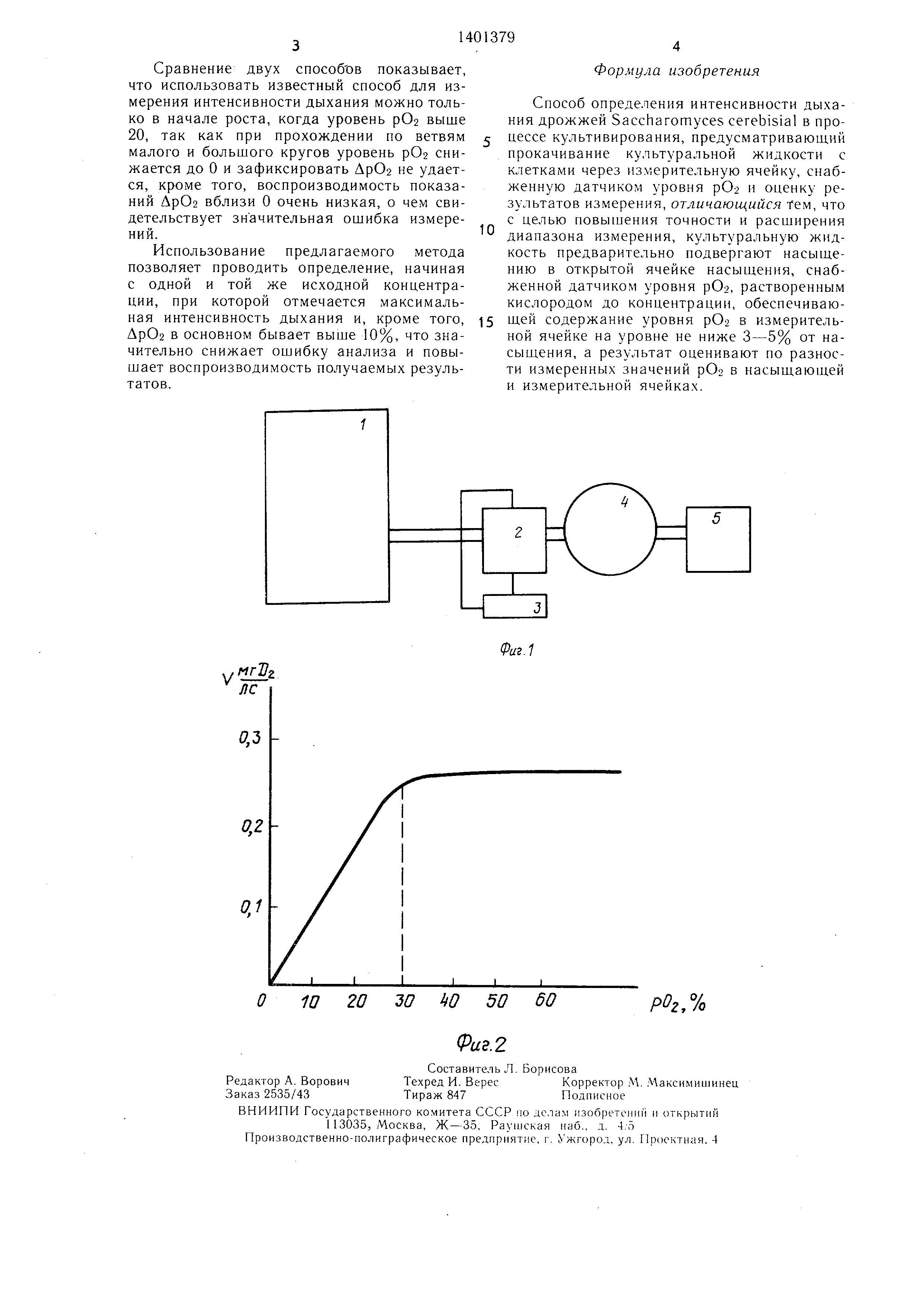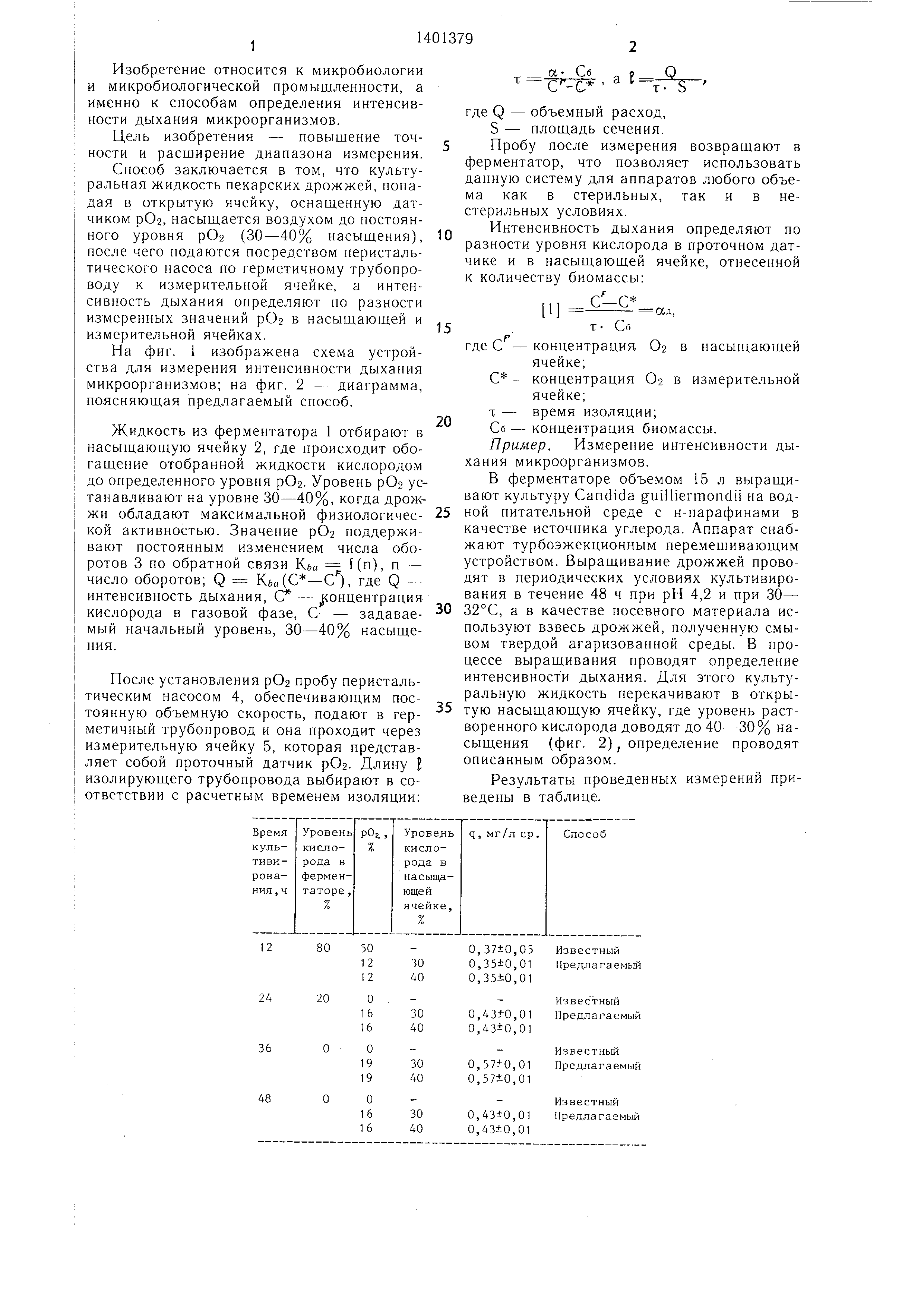 снижает ошибку анализа и повы-сыщения, а результат оценивают по разносшает воспроизводимость получаемых резуль-ти измеренных значений рО2 в насыщающей татов.и измерительной ячейках. Формула изобретения Способ определения интенсивности дыхания дрожжей Saccharomyces cerebisial в процессе