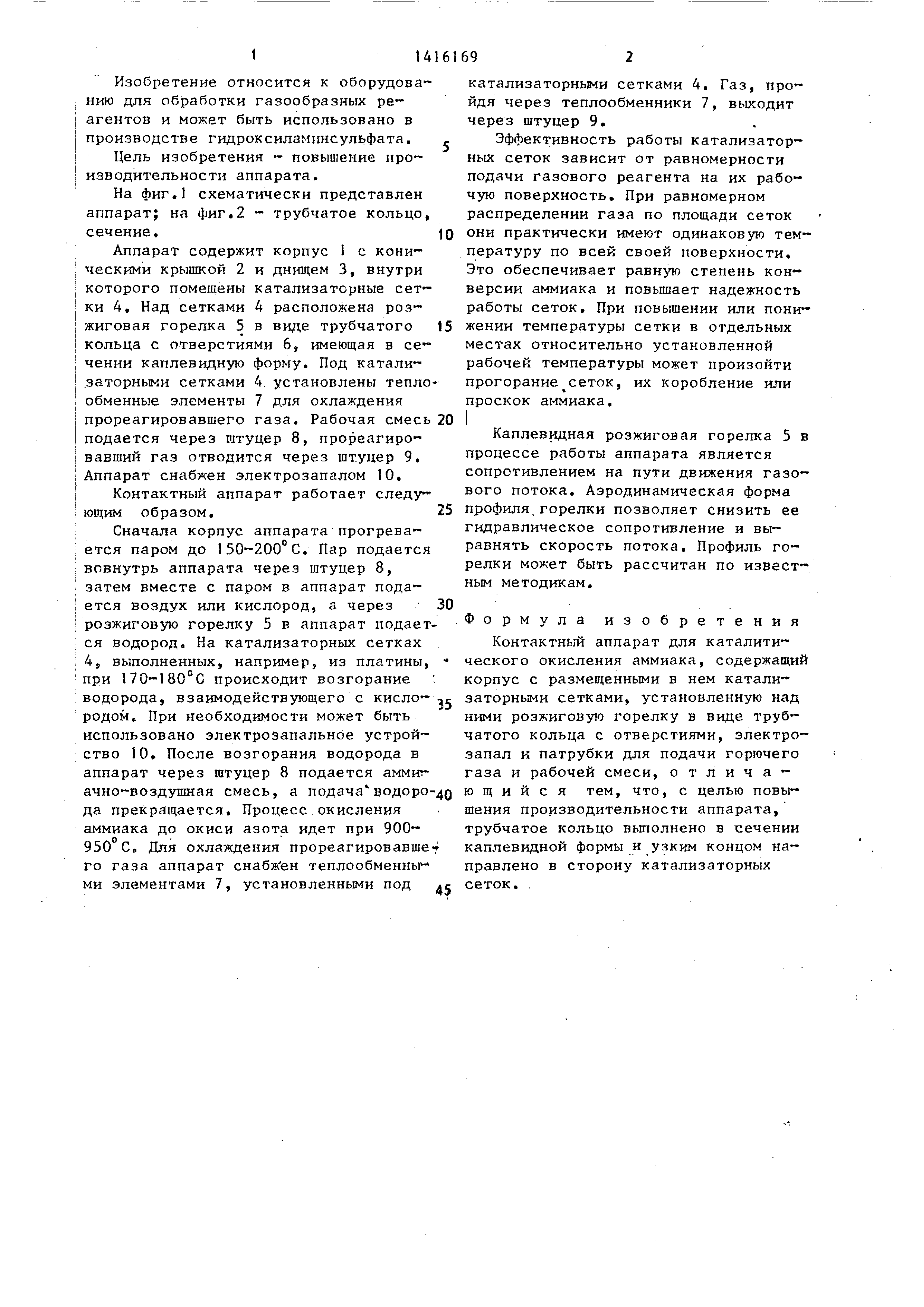 Аппарат содержит корпус 1 с коническими крышкой 2 и днищем 3, внутри которого помещены катализаторные сетки 4. Над сетками 4 расположена роз- жиговая горелка 5 в виде трубчатого 15 кольца с отверстиями 6, имеющая в сечении каплевидную форму. Под катали- .заторными сетками 4. установлены тепло- обменные элементы 7 для охлаждения прореагировавшего газа. Рабочая смесь 20 подается через штуцер 8, прореагировавший газ отводится через штуцер 9. Аппарат снабжен электрозапалом 10.