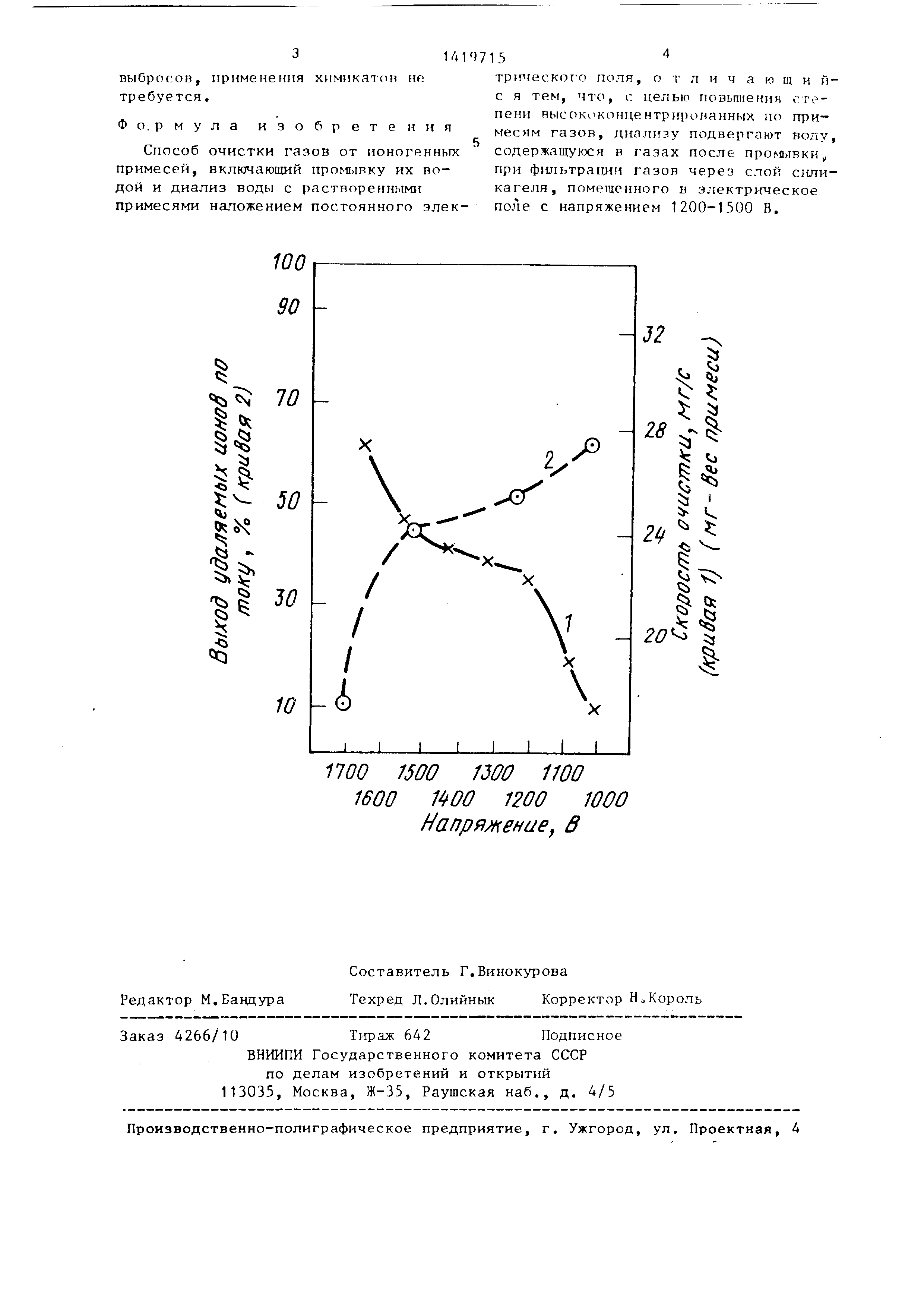 При напряжениях на клеммах электролизера ниже 1200 В возрастает риск прискока примесей с воздухом через слой сликагеля - ввиду резкого падения скорости очистки из-за снижения в электрическом поле скорости передвижения ионов в воде, а выше 1500 В значительно уменьшается выход по току целевого продукта - очищенного от примесей воздуха, что подтверждается приводимым графиком (см. чертеж).