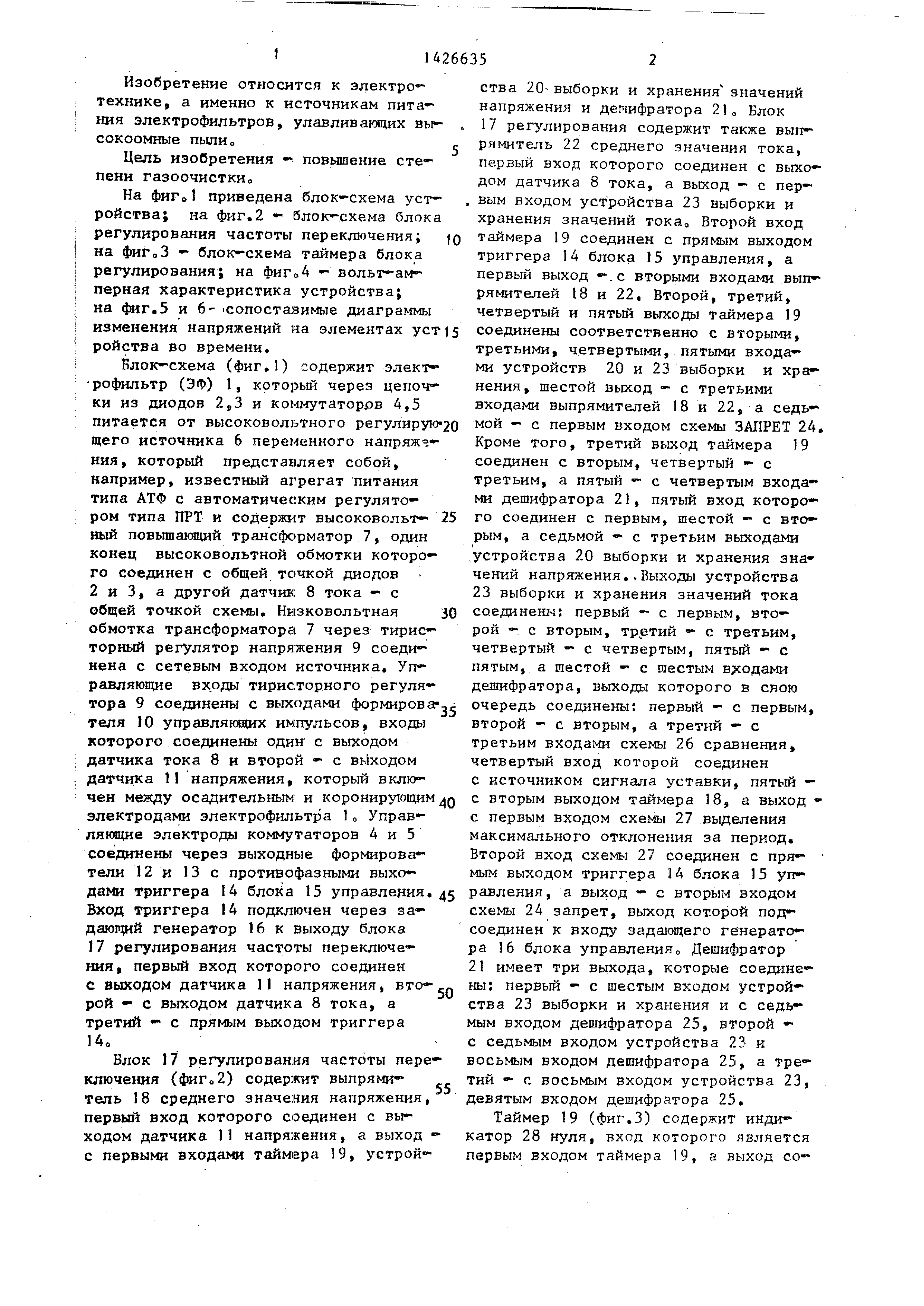 из последовательно соединенных вентилей 2,3 с коммутаторами 4,5, датчик 1I напряжения, подключенный к электрофильтру 1, и датчик 8 тока, блок 15 управления, выполненный в виде задающего