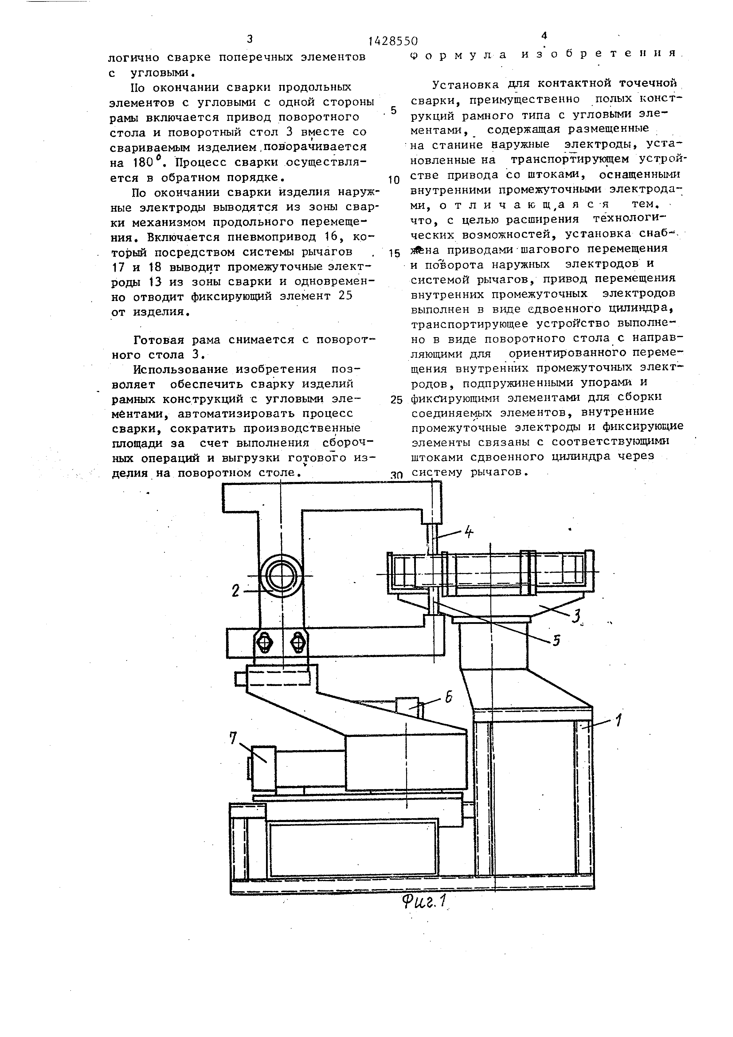 3, и связанного с рычагами 17, Установка работает следующим образом. Рамная конструкция состоит из продольных, поперечных и угловых: элементов. На поворотный стол 3 по упорам устанавливаются продольные и поперечные элементы свариваемого изделия,