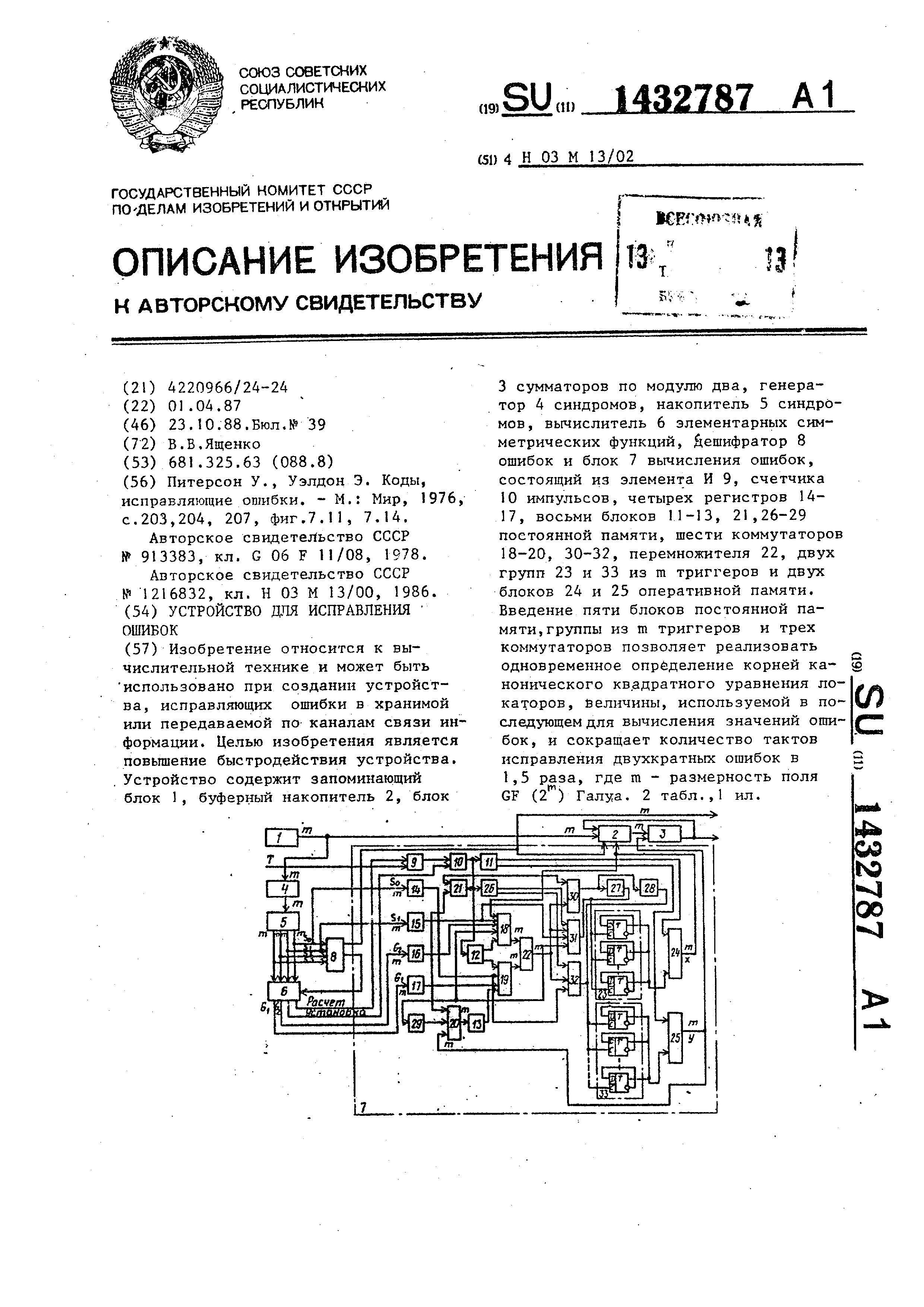 , и сокращает количество тактов исправления двухкратных ошибок в 1,5 раза, где m - размерность поля GF (2) Галуа. 2 табл.,1 ил. а. Од N5 00