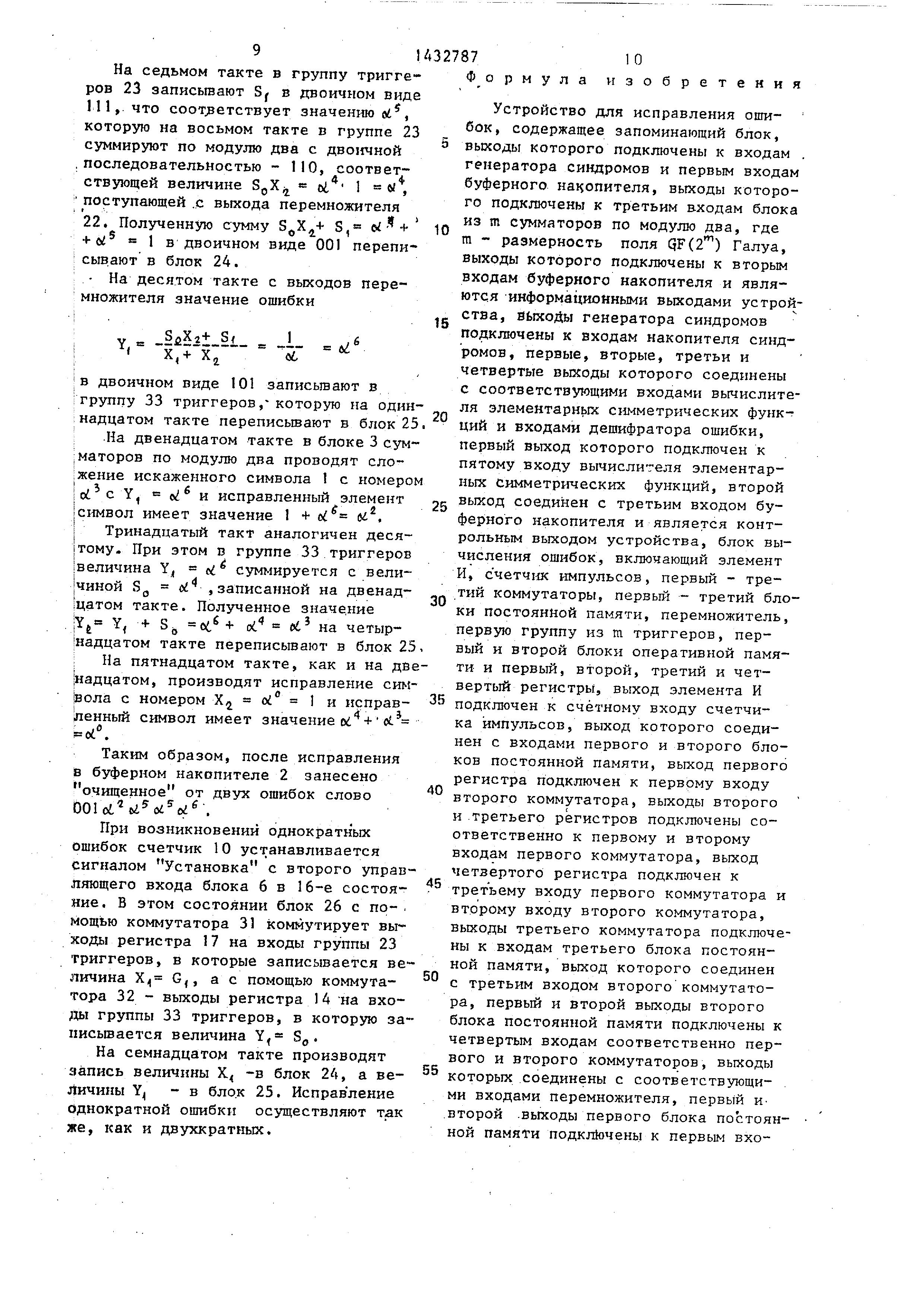 записьгоают в блок 24, а z (101) - в блок 25. На третьем такте с выхода перемно- жителя 22 полученньй локатор ошибок SiS3+ Si -oг. oC S,+ So Si в 10 15 поступают на входы соответственно регистра 16 и регистра 17, Из блока