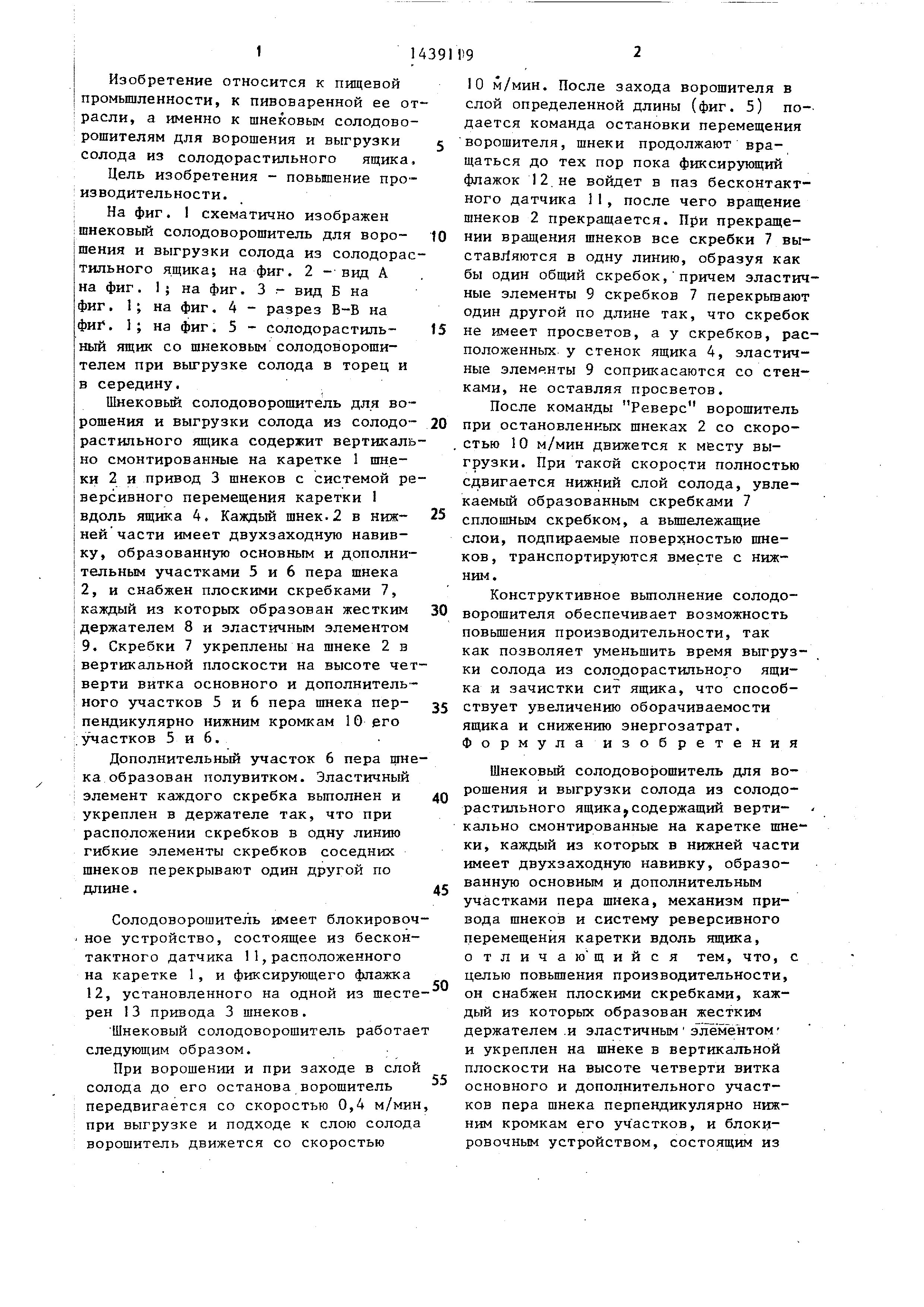 ящика и снижению энергозатрат. Формула изобретения Шнековый солодоворошитель для ворошения и выгрузки солода из солодорастильного