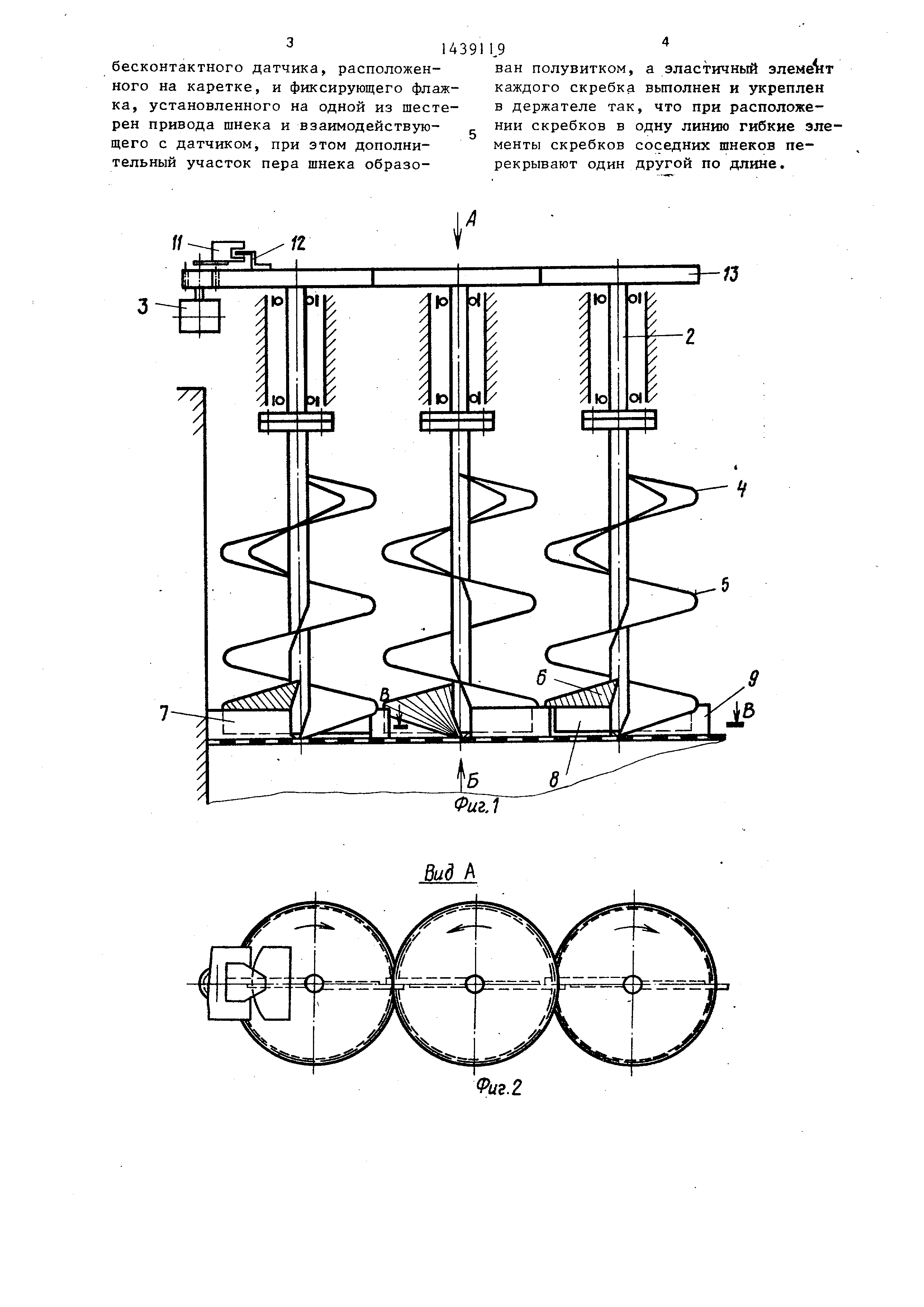 с датчиком, при этом дополнительный участок пера шнека образо143 1439119 ван полувитком, а эластичный элемент каждого скребка вьтолнен и укреплен