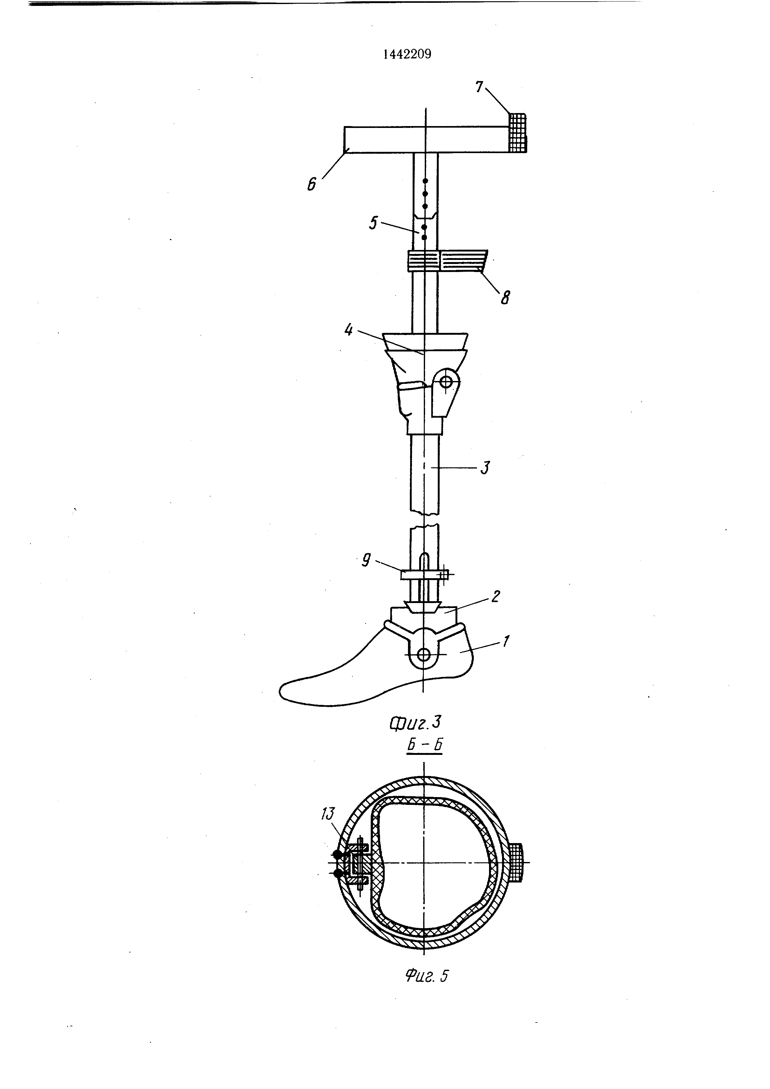 бедра, общий вид; на фиг. 5 - разрез Б-Б на фиг. 4; на фиг. 6 - протез с гильзой бедра, общий вид. Протез состоит из стопы 1, щиколотки 2, голени 3, коленного узла 4 с каркасом